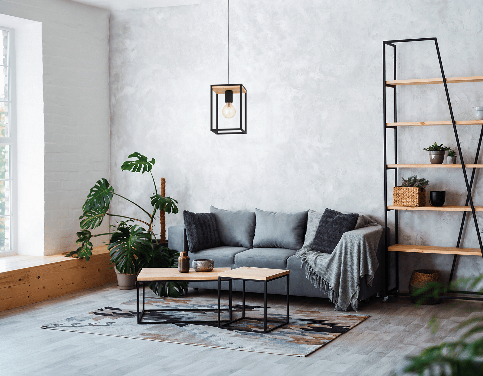 Stylish open-frame design – Features a structured black steel cuboid housing with warm natural wood detailing, bringing a sleek geometric aesthetic to modern, Scandinavian, or industrial-inspired interiors.