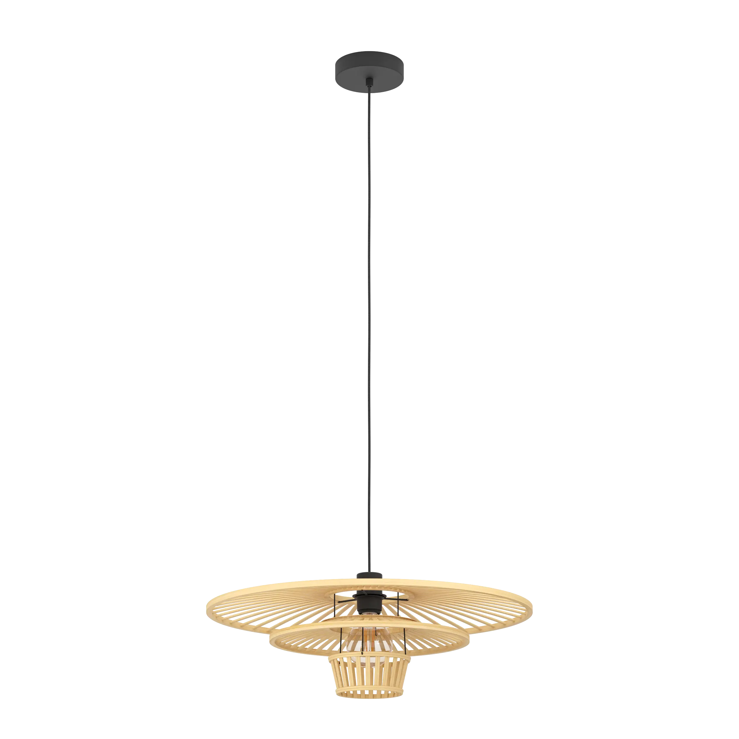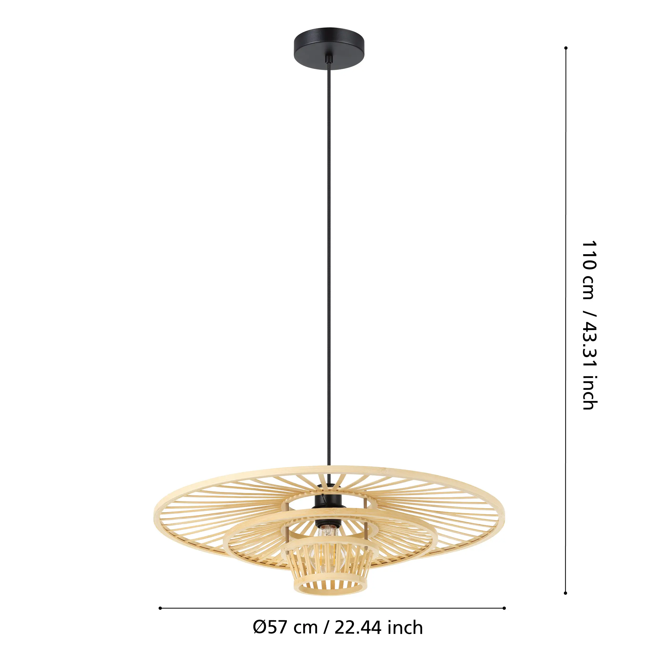 LYDNEY Pendant Light – Black Steel Canopy with Natural Wood Disc Shade, Ø570mm, 1100mm Drop, E27 Socket – Warm Nordic-Inspired Ceiling Accent