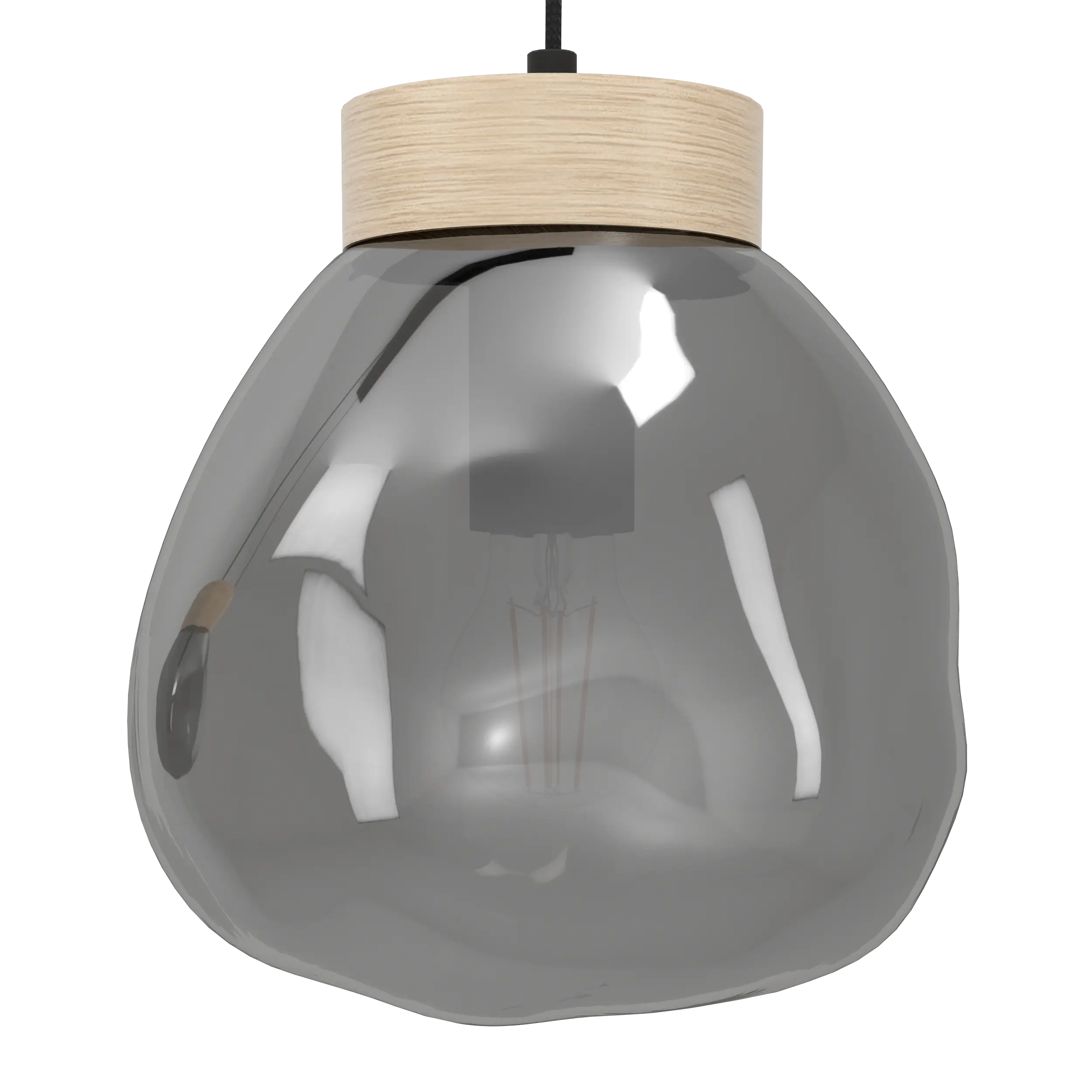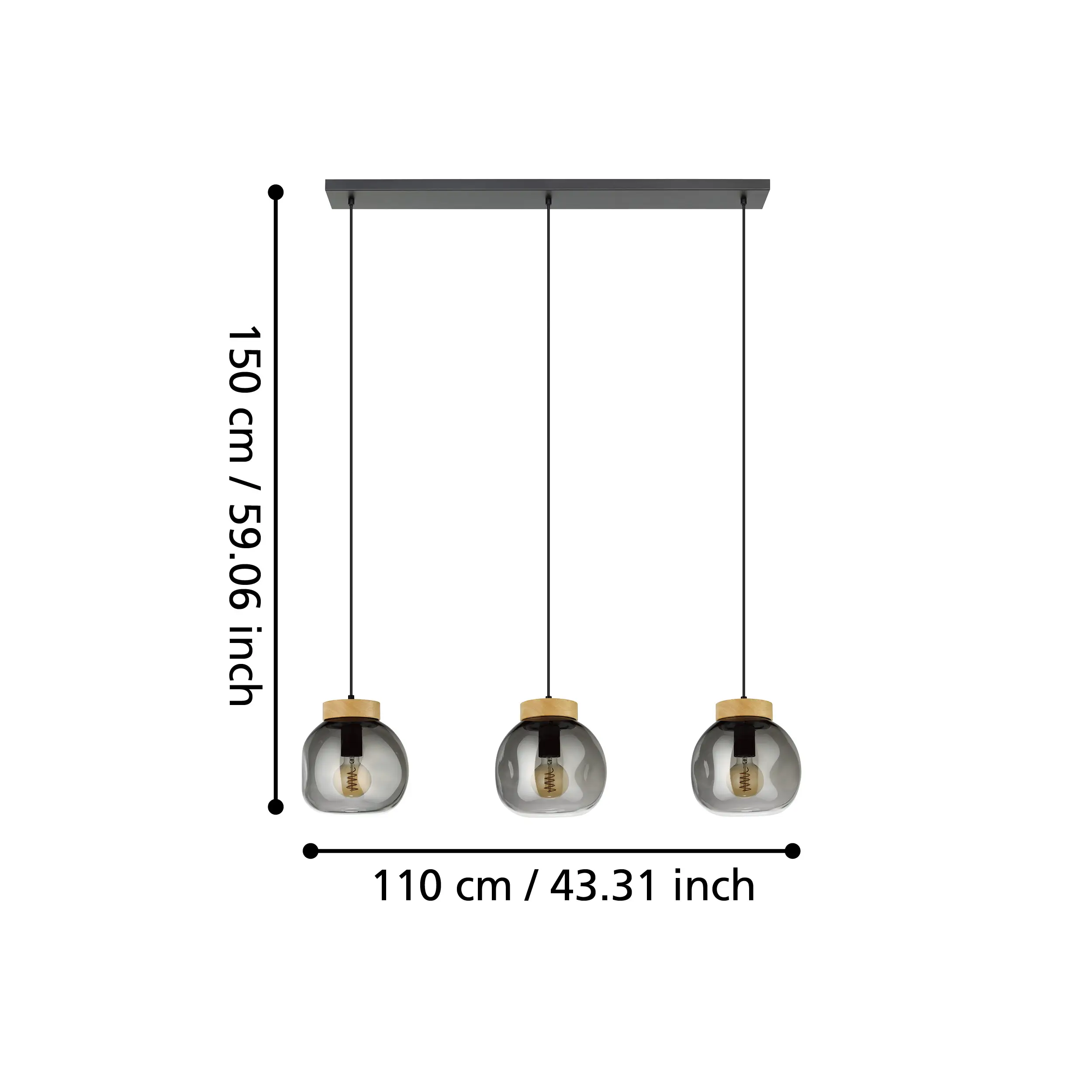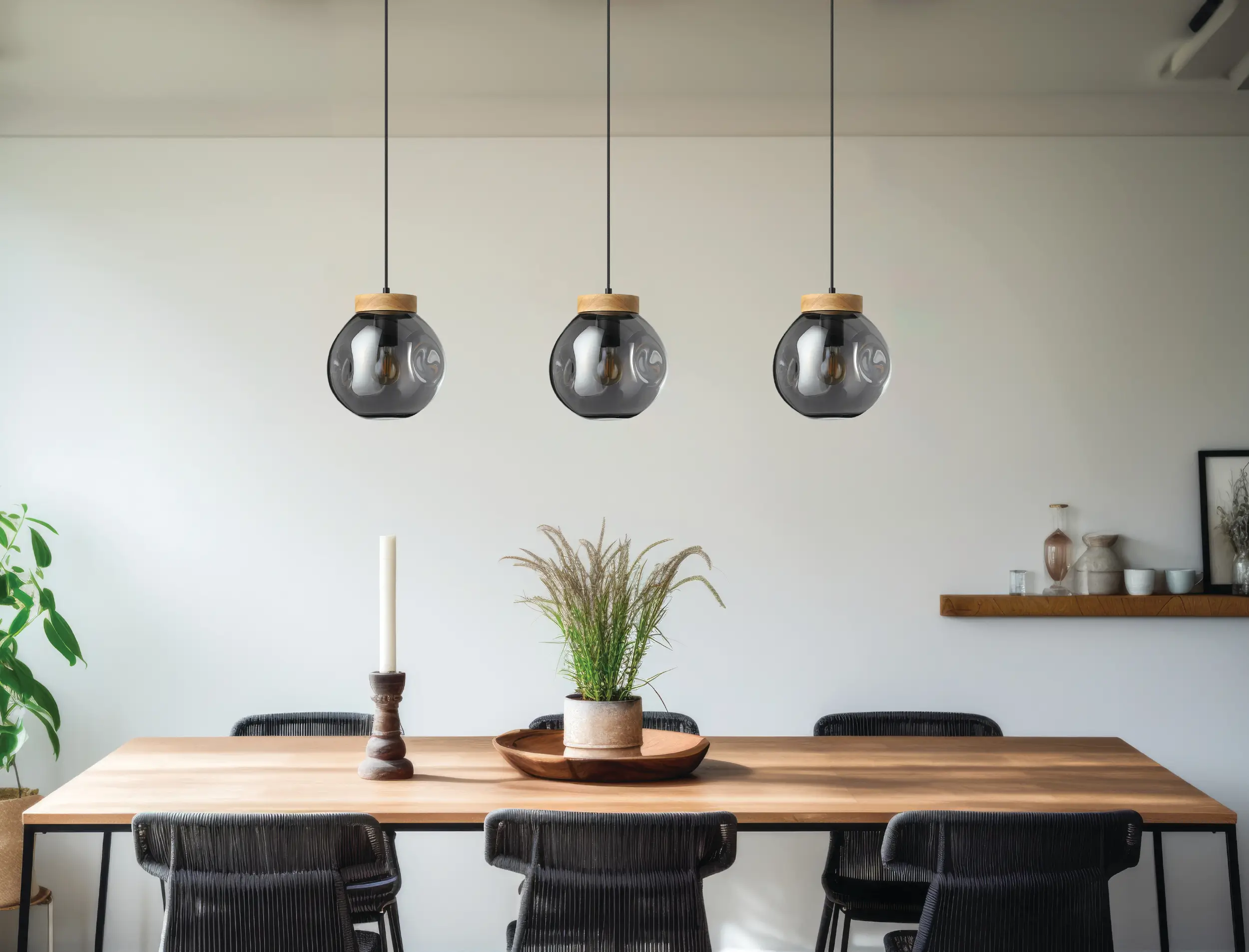 Elegant & Modern Trio Design: Three organically shaped smoked-glass shades with wood-accented tops hang from a sleek black steel canopy—adds sculptural style to dining rooms or kitchens.