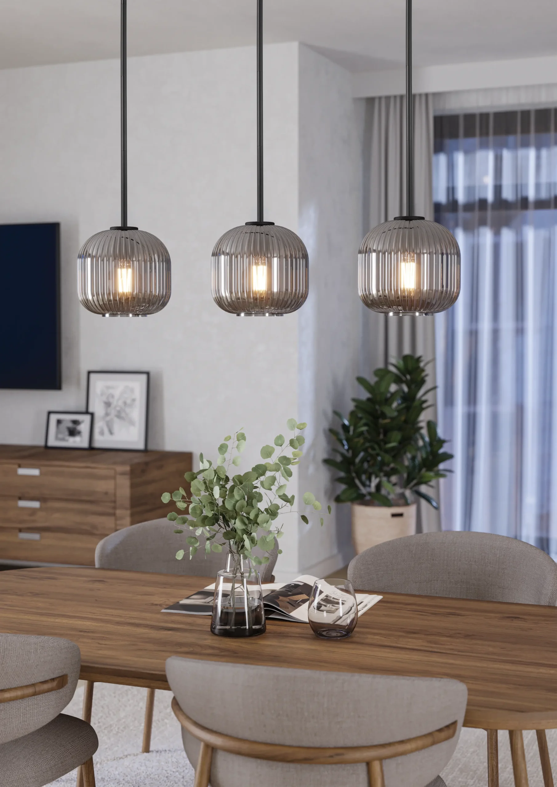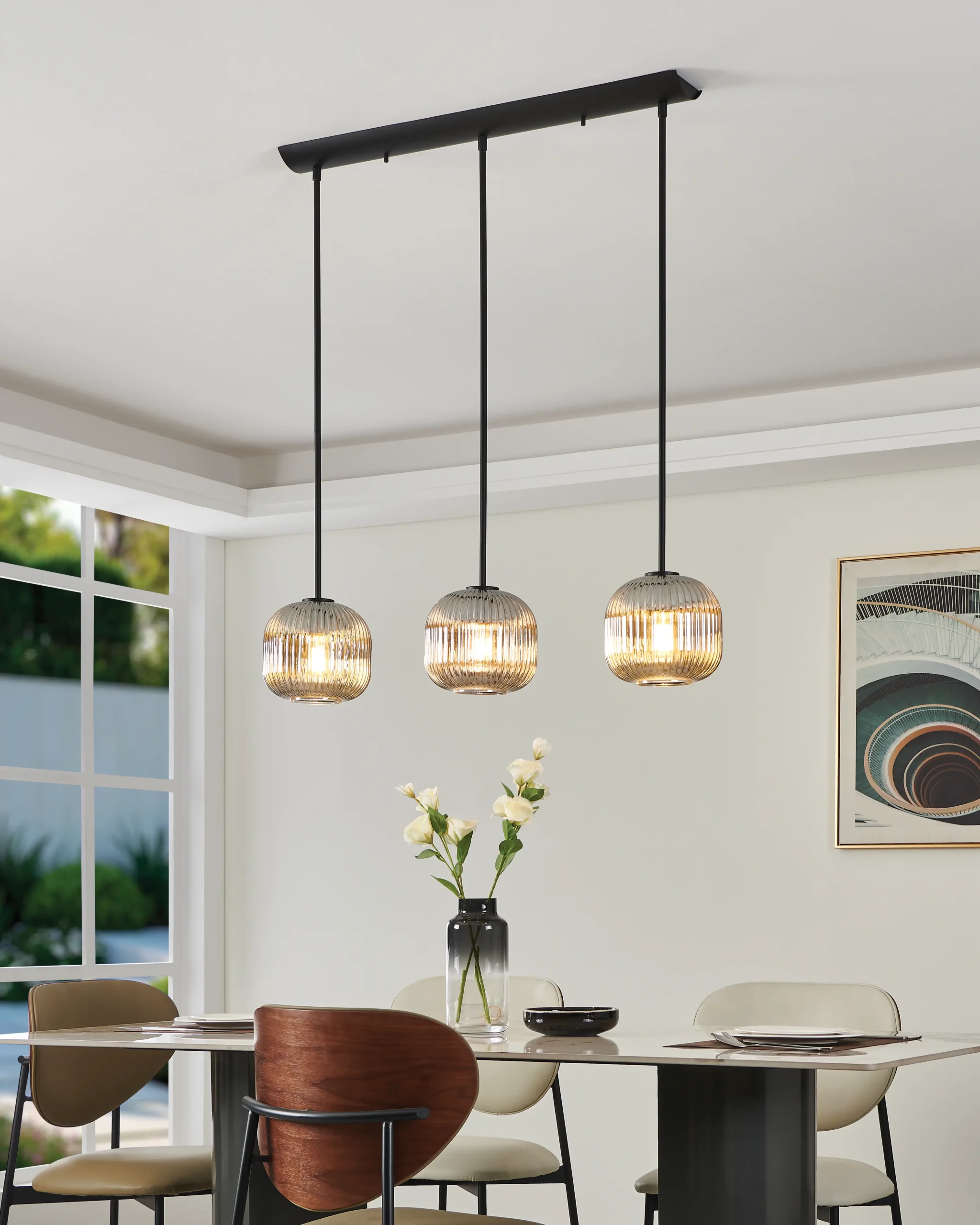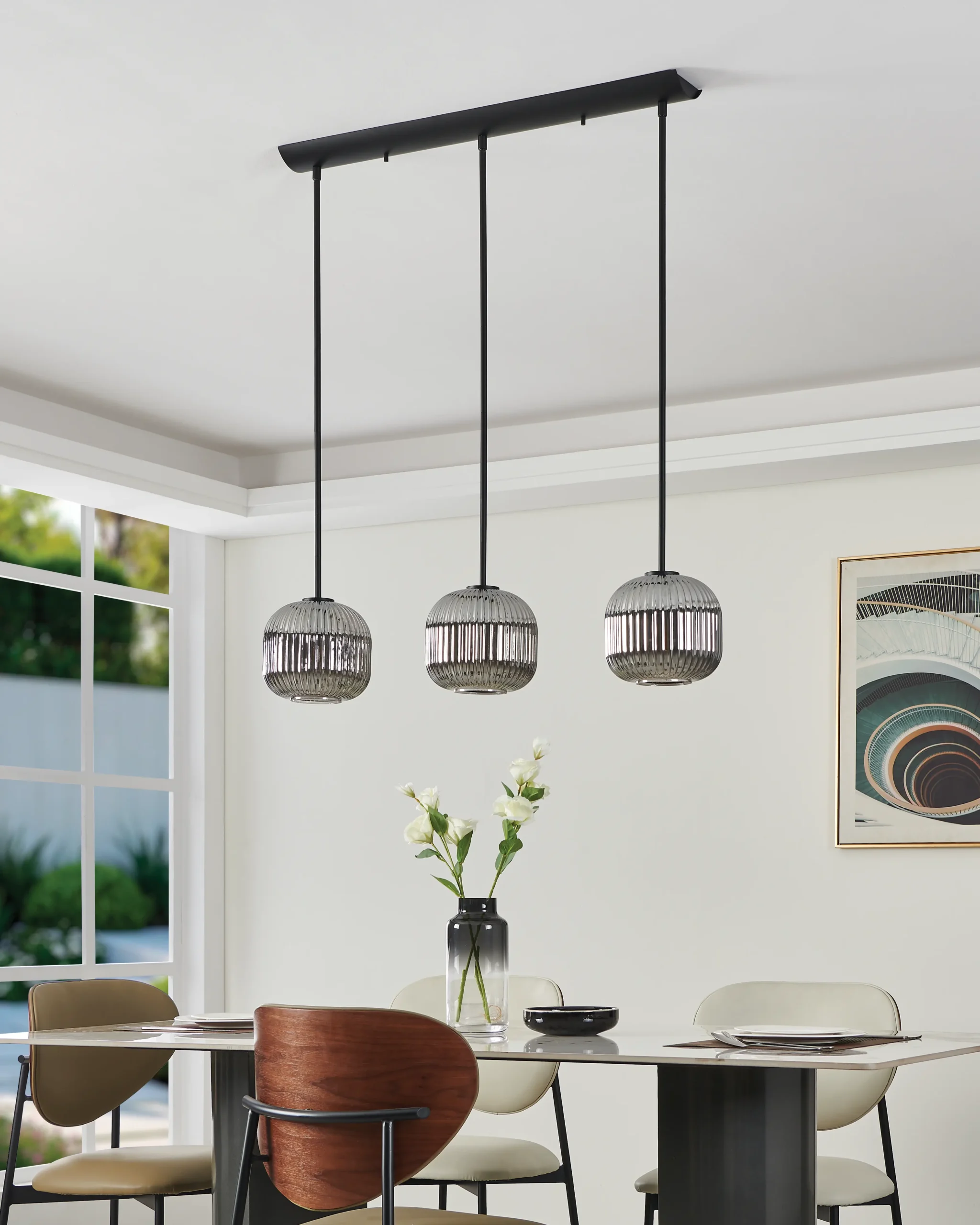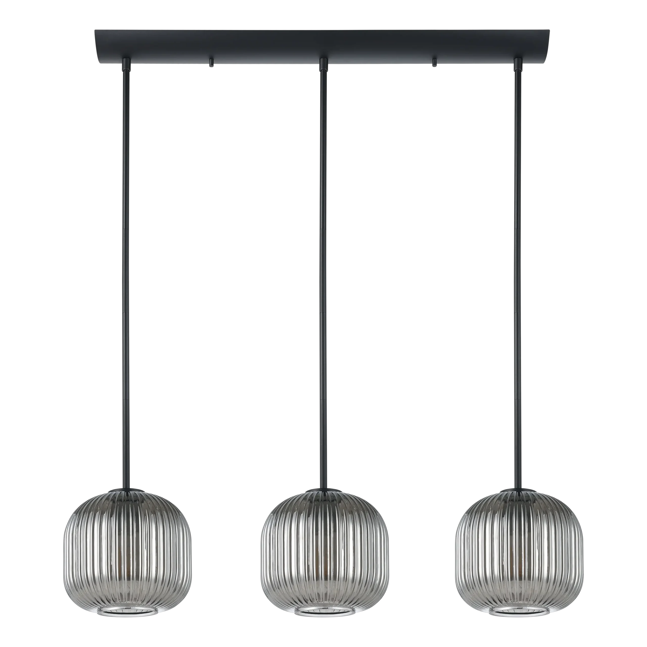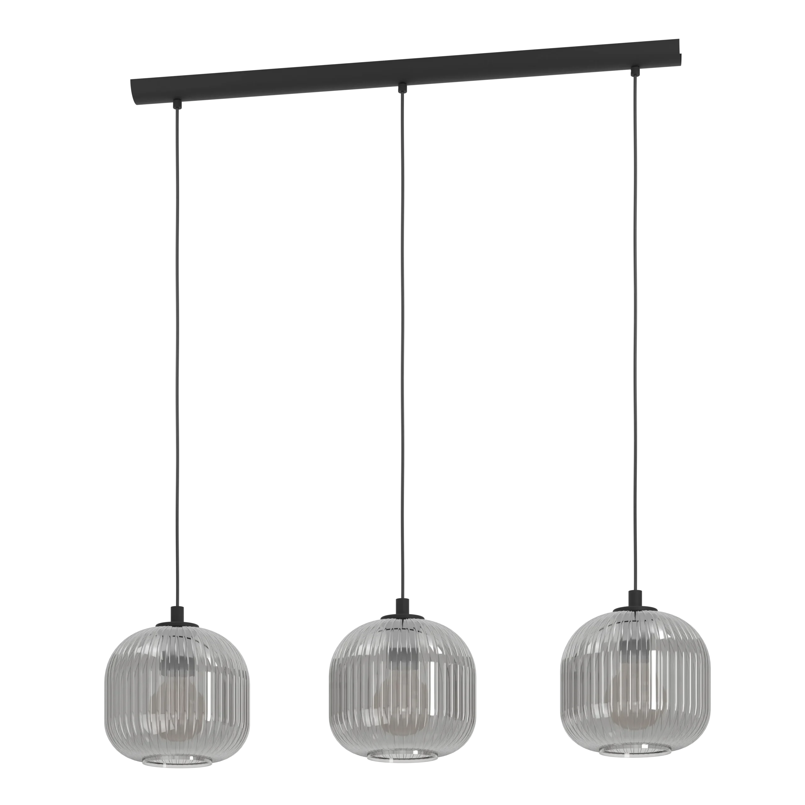 Sleek tri-light pendant with smoked glass shades – Three vaporized black-glass globes suspended from a matte-black steel bar (1,200×200mm), combining modern and industrial aesthetics.
