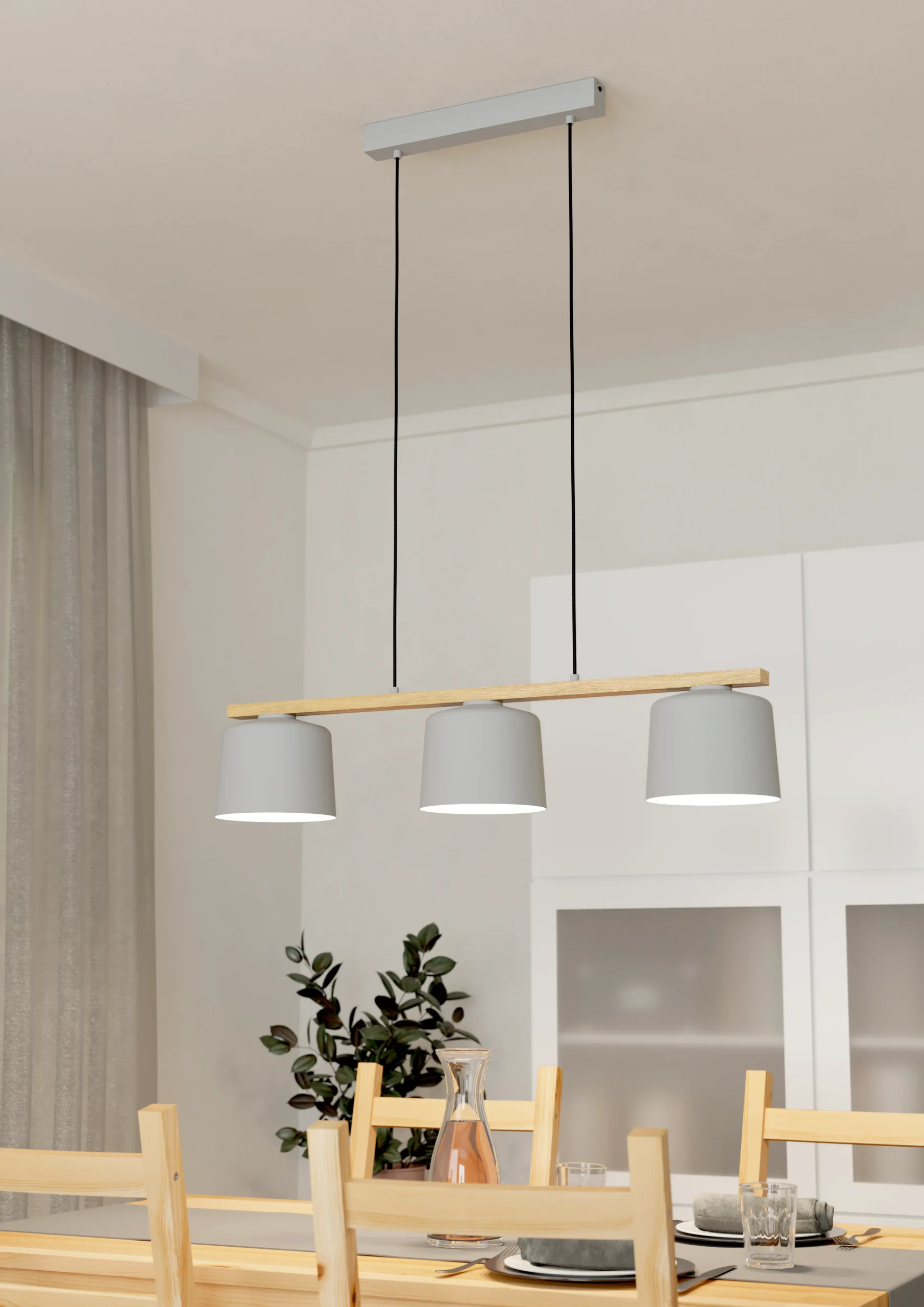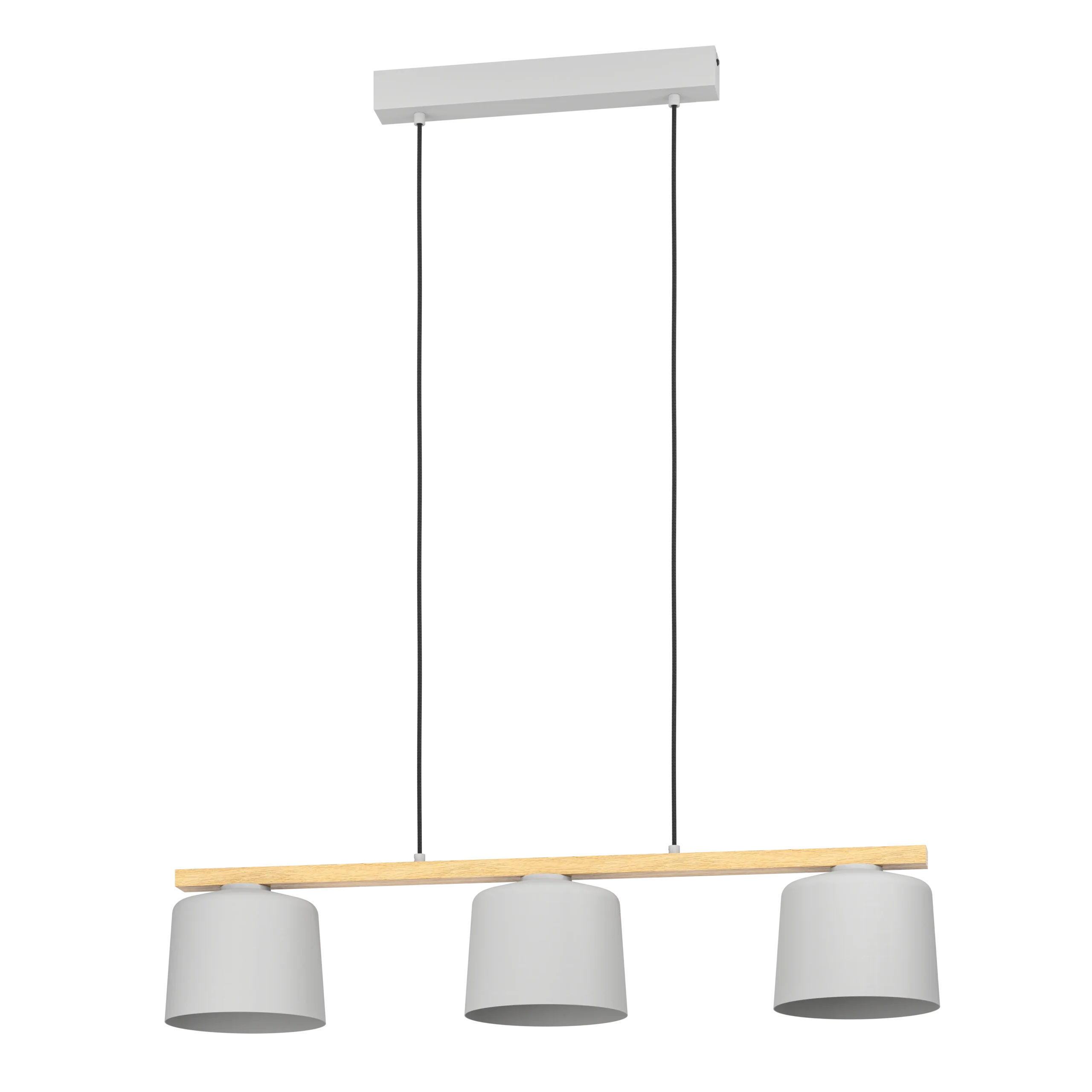 Scandi‑Chic Trio Design: Features a brown wood crossbar suspending three pale grey fabric drum shades from a sleek steel canopy—perfect for cozy, contemporary interiors.