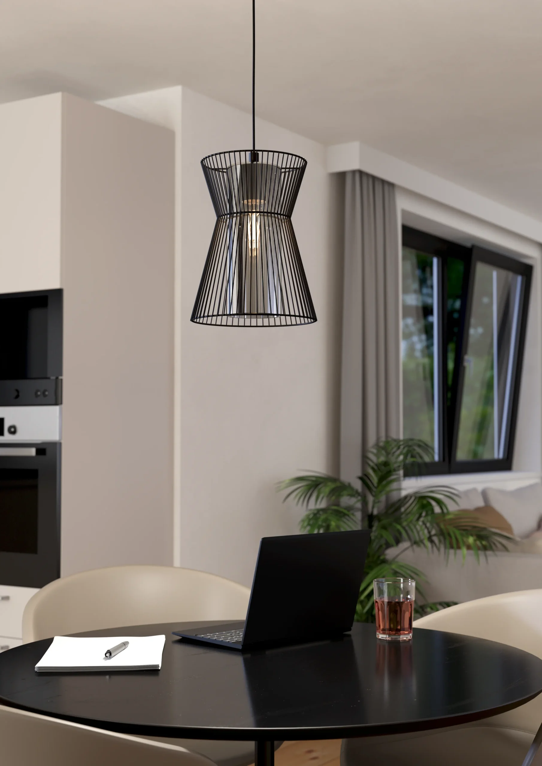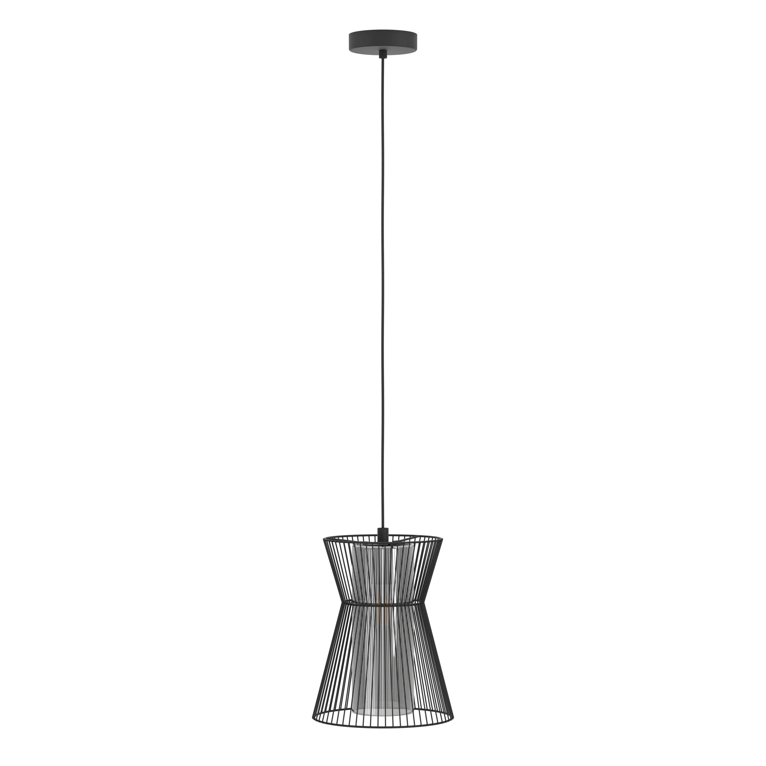 Striking Cage-Style Design – A sleek black steel hourglass frame encases a smoked, transparent glass shade (Ø225mm), combining industrial elegance and ambient lighting perfect for kitchens, dining areas, foyers, or home offices.