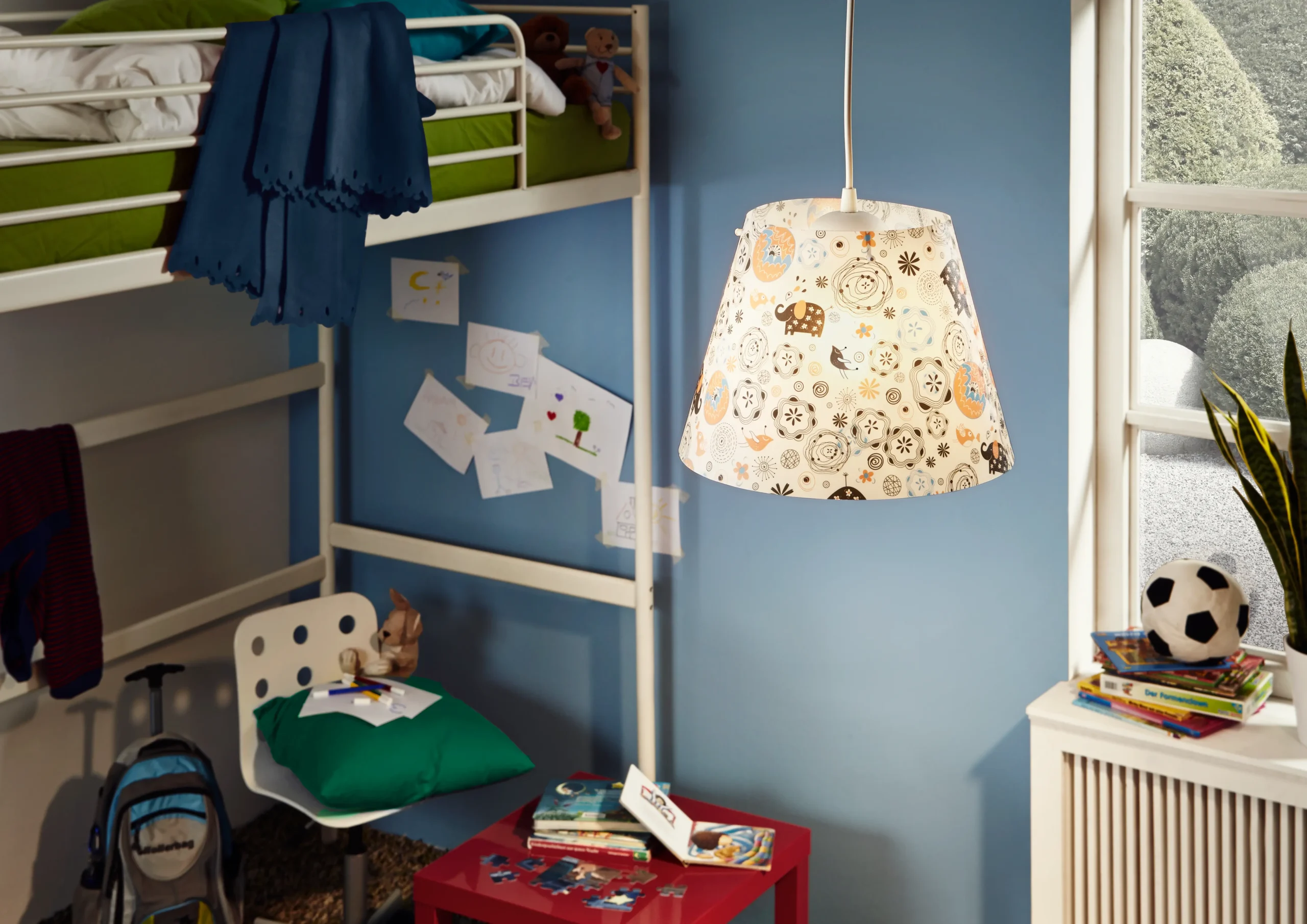 The MOLOVE 12 pendant light combines functionality with playful aesthetics, making it ideal for children’s indoor spaces. It features a lightweight plastic enclosure and a colored plastic glass shade, providing soft illumination through an E27 socket-compatible lamp. The fixture operates on standard mains voltage (220-240V) with IP20 protection, ensuring safety and reliability in everyday use.