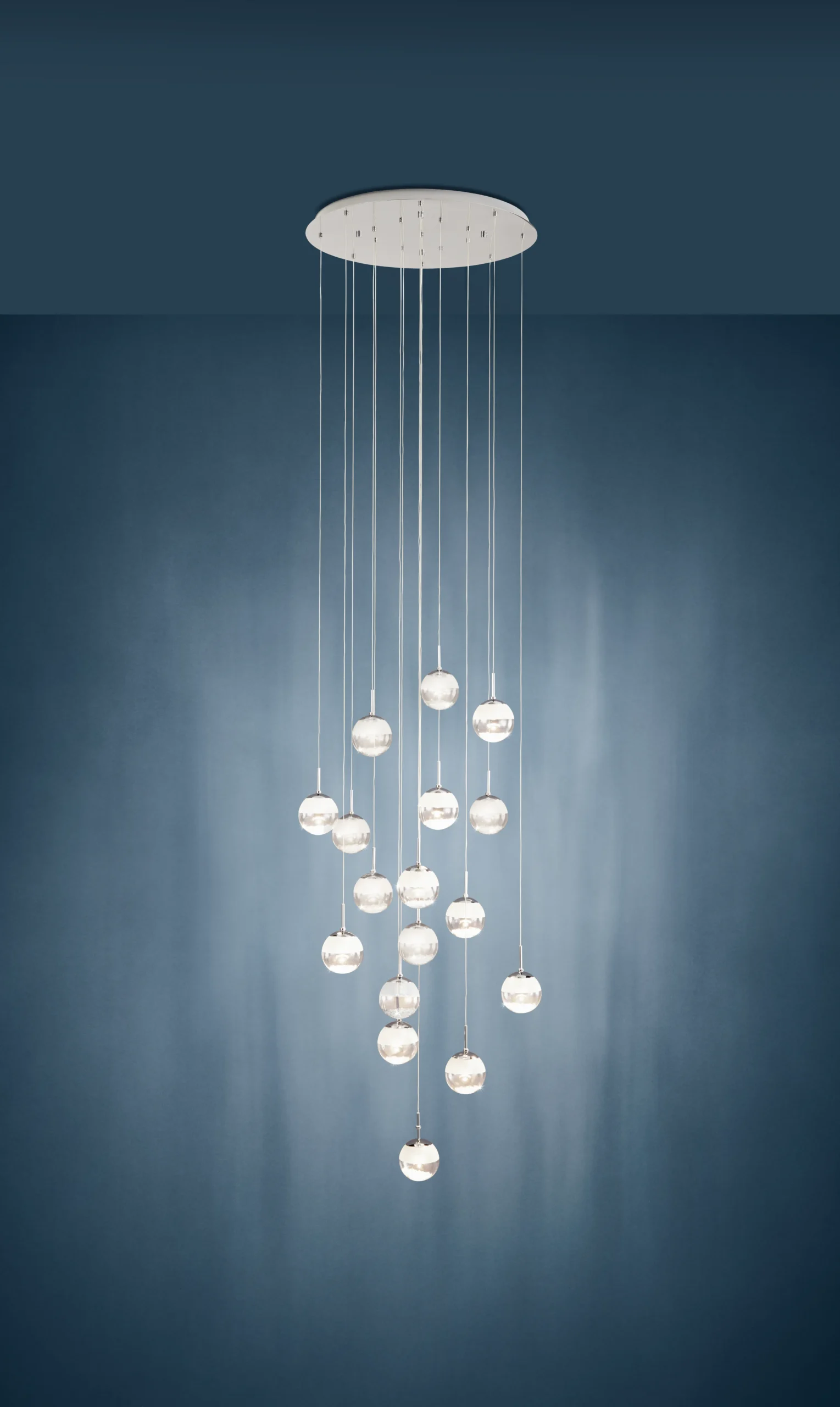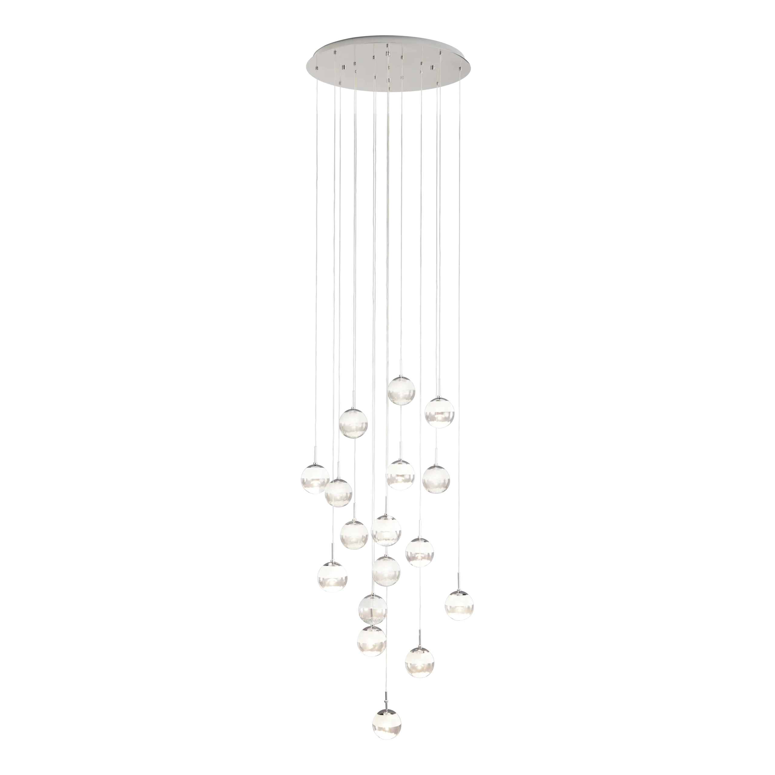 Captivating Spiral Design: Seventeen stunning glass globes—crystal-clear and frosted—are suspended along a twisting chrome steel cable, creating a dynamic, cascading centerpiece ideal for tall ceilings and staircases.