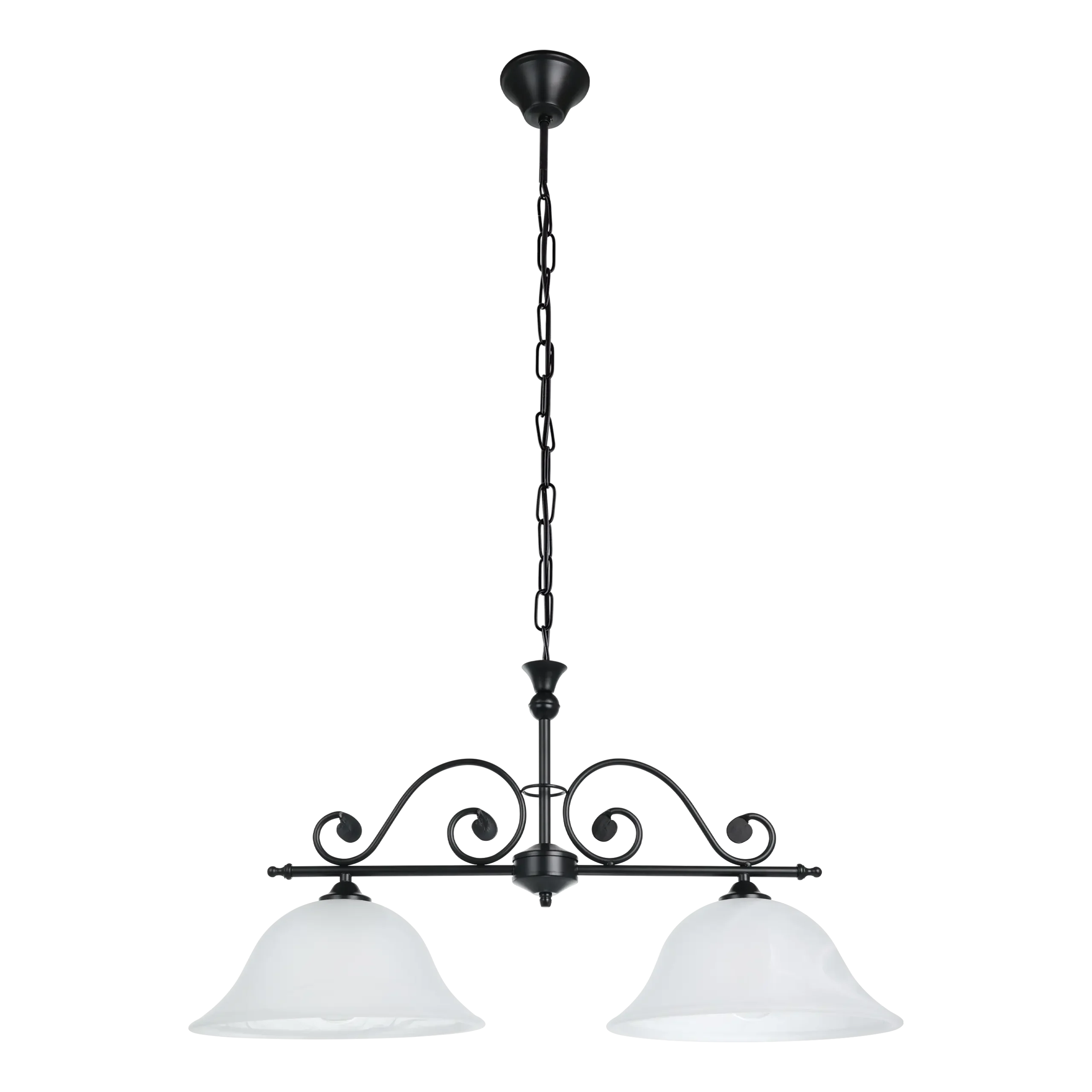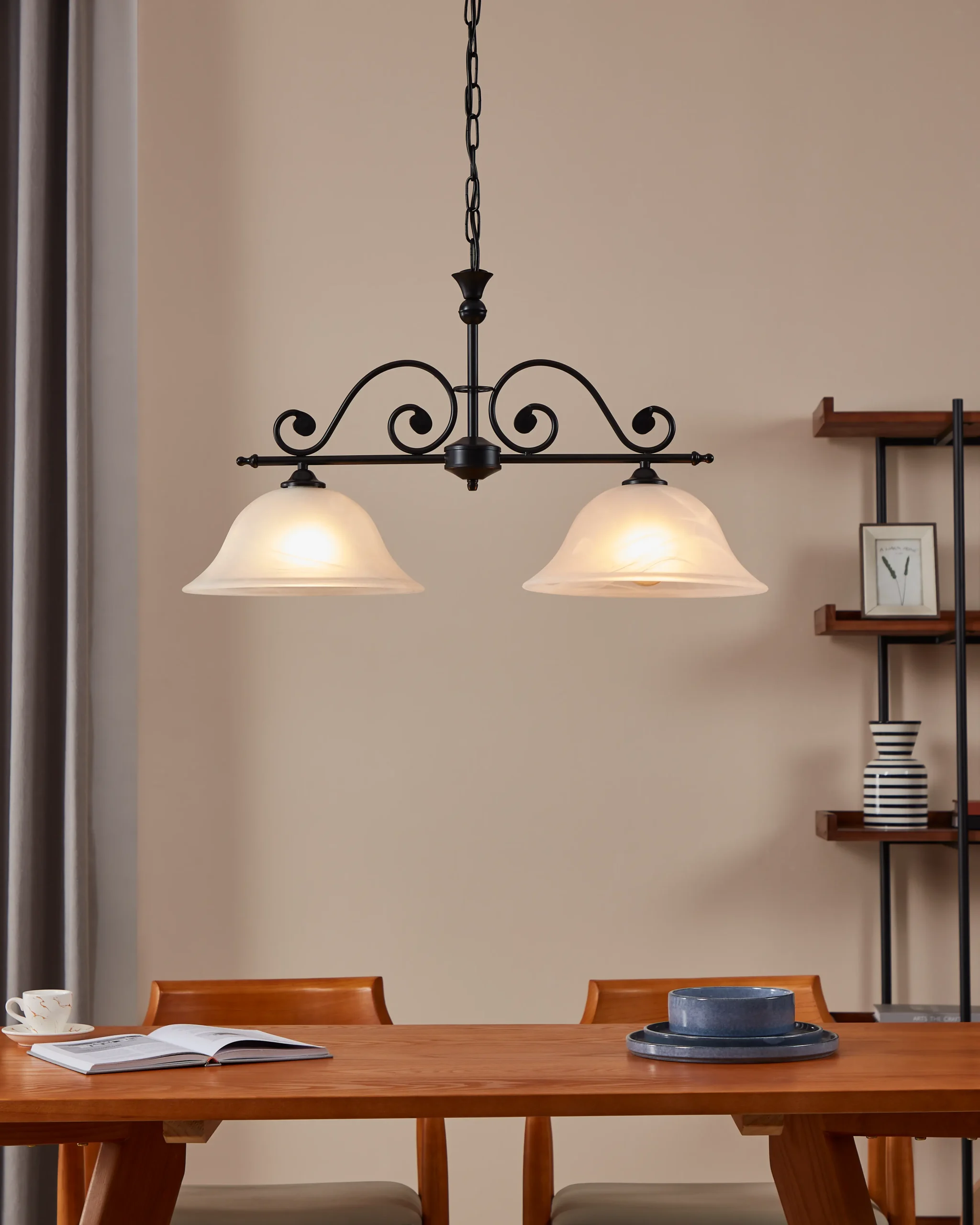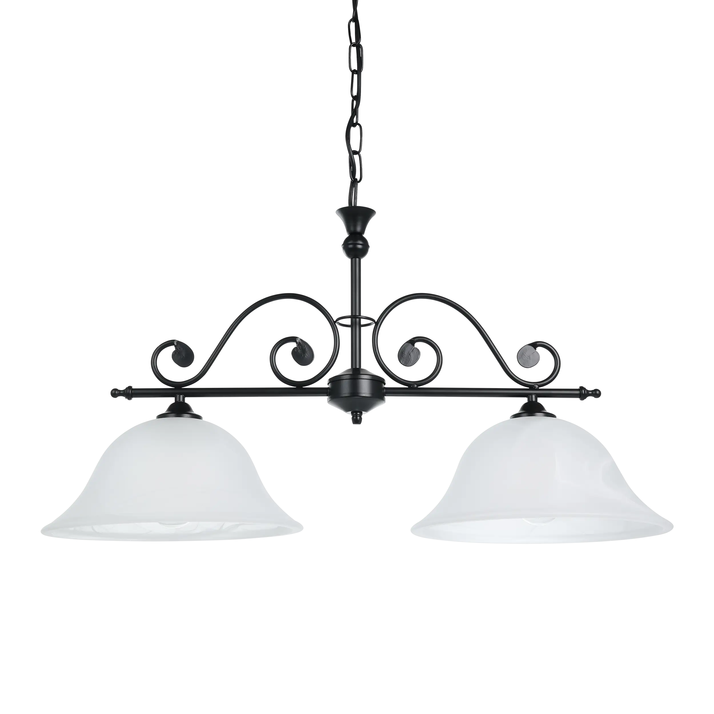Stylish Two-Light Design: Features a sleek black steel enclosure paired with white alabaster glass shades for elegant ambient lighting.