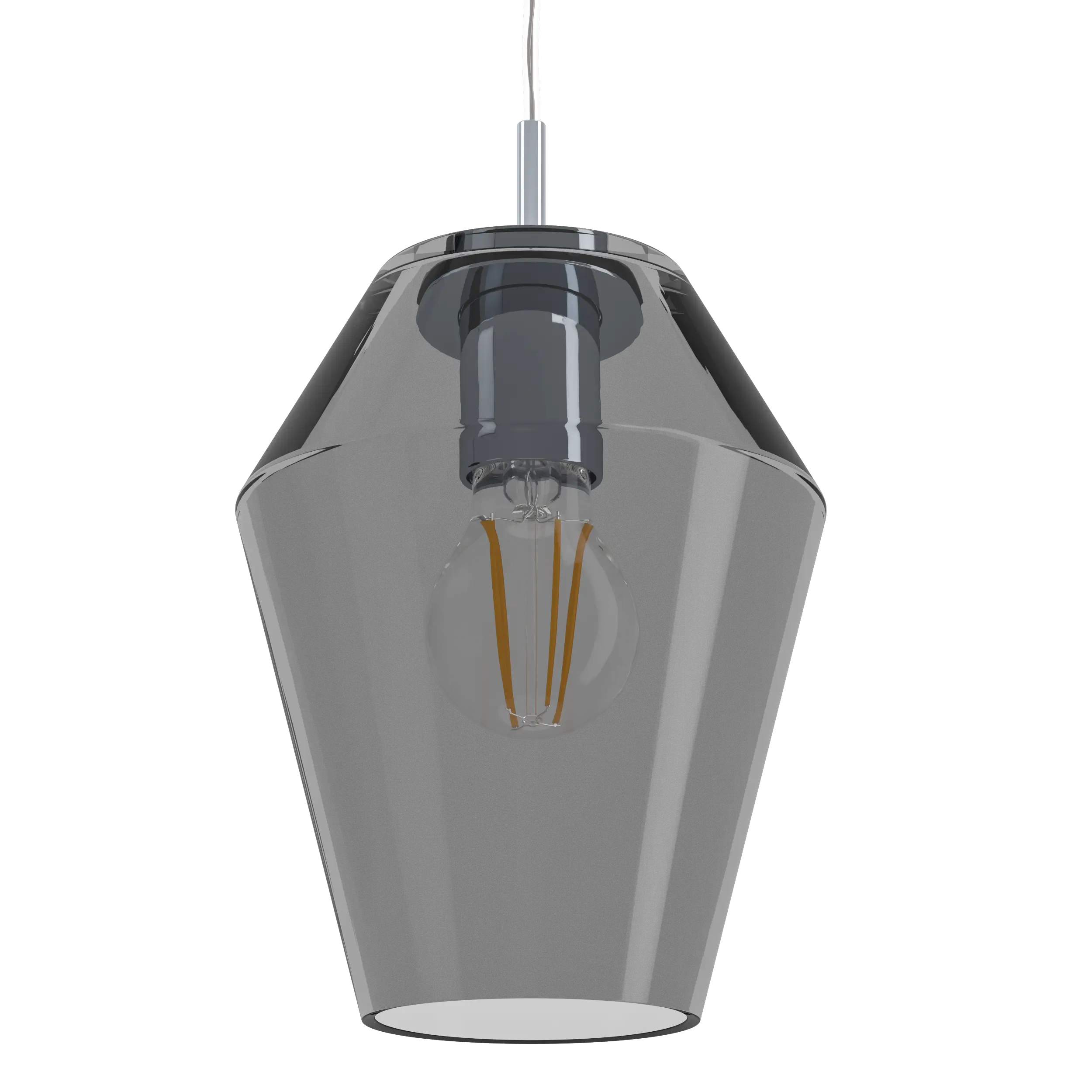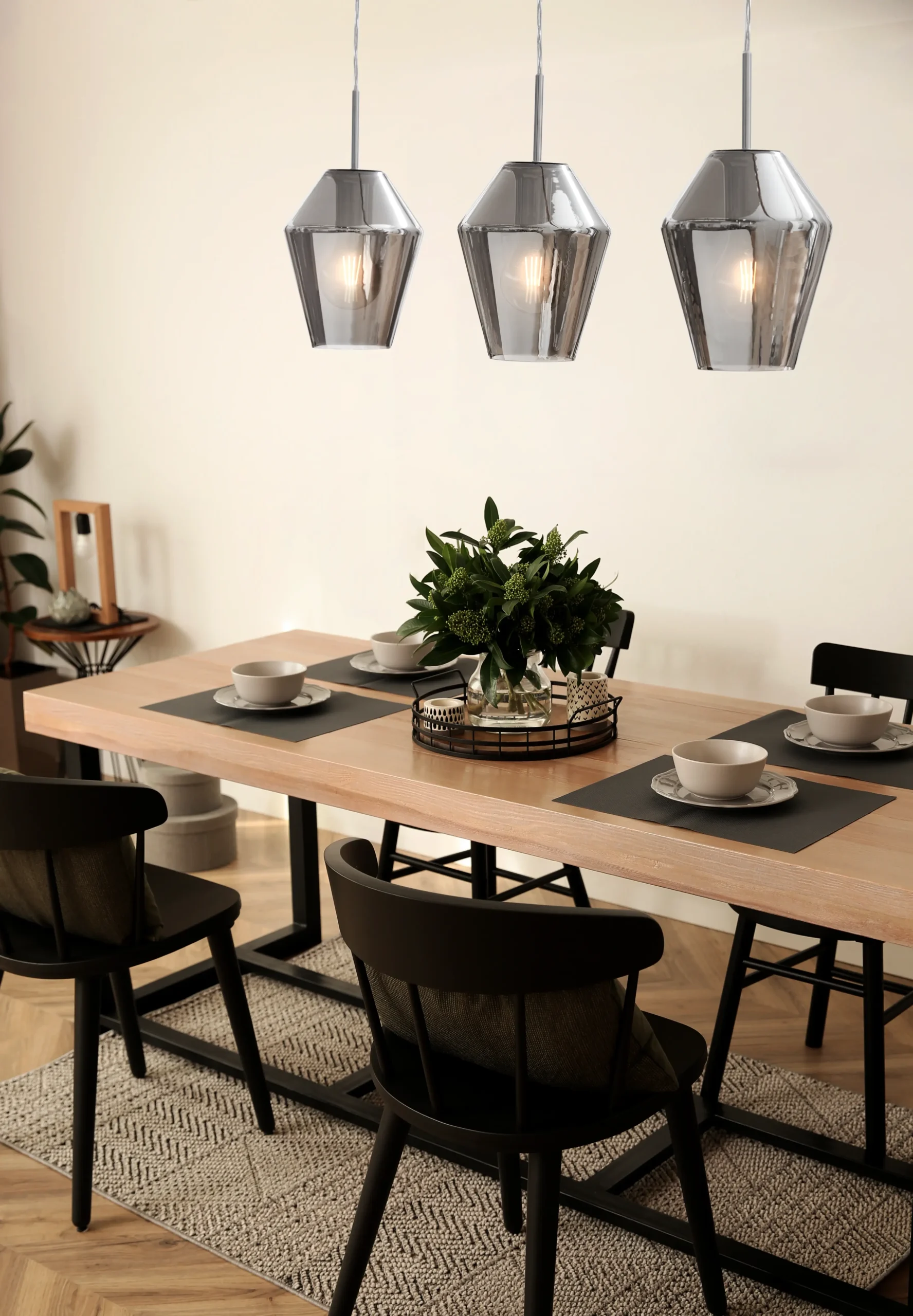 Stylish Chrome & Smoked Glass Design – Sleek bar with three smoke-finish glass shades and polished chrome steel frame elevates modern interiors.