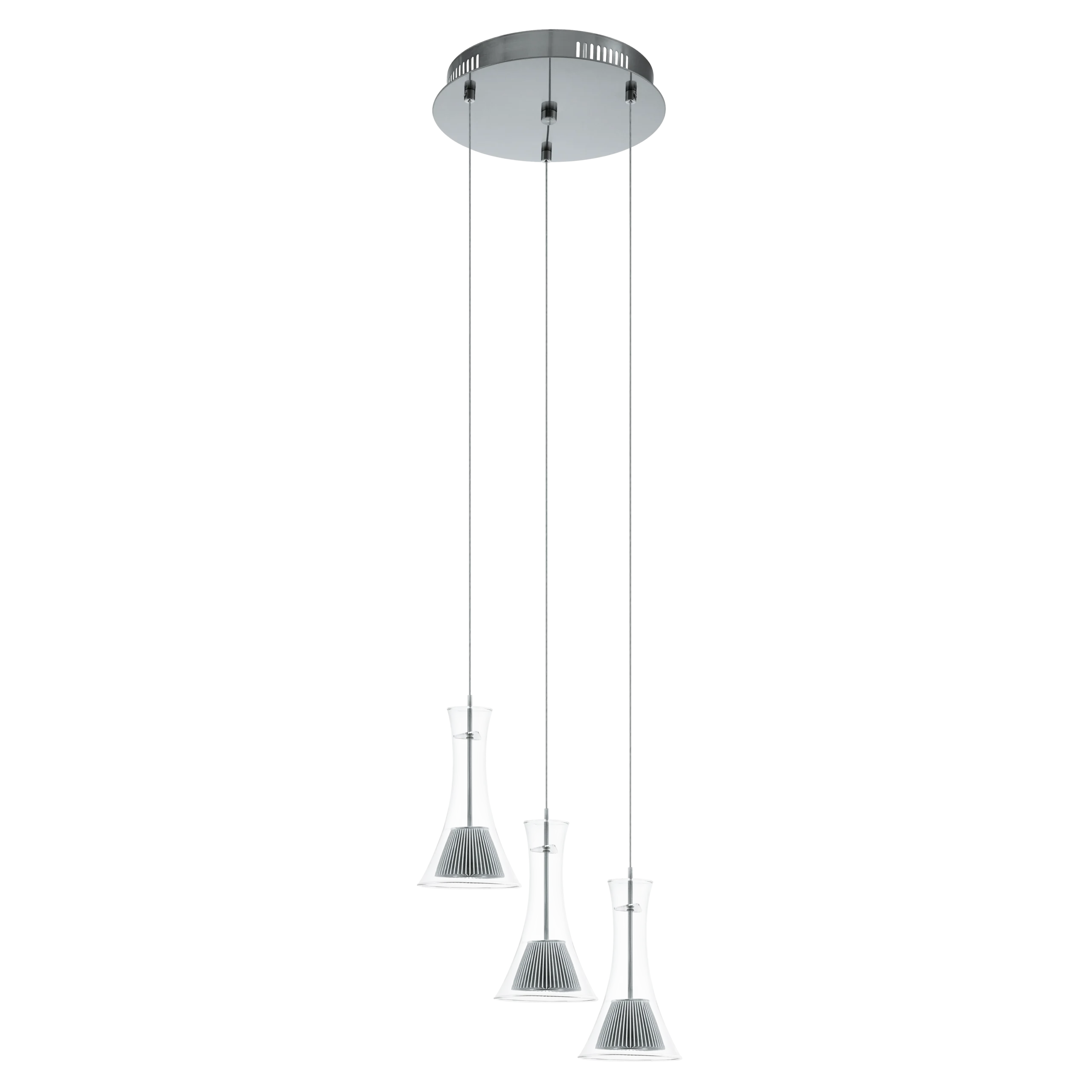Musero 3‑Lamp LED Pendant – Satin Nickel & Clear Glass, 13.8″ Dia × 94.5″ Drop, 3×5.4W Warm‑White LEDs (1,530lm), Replaceable, Dimmable