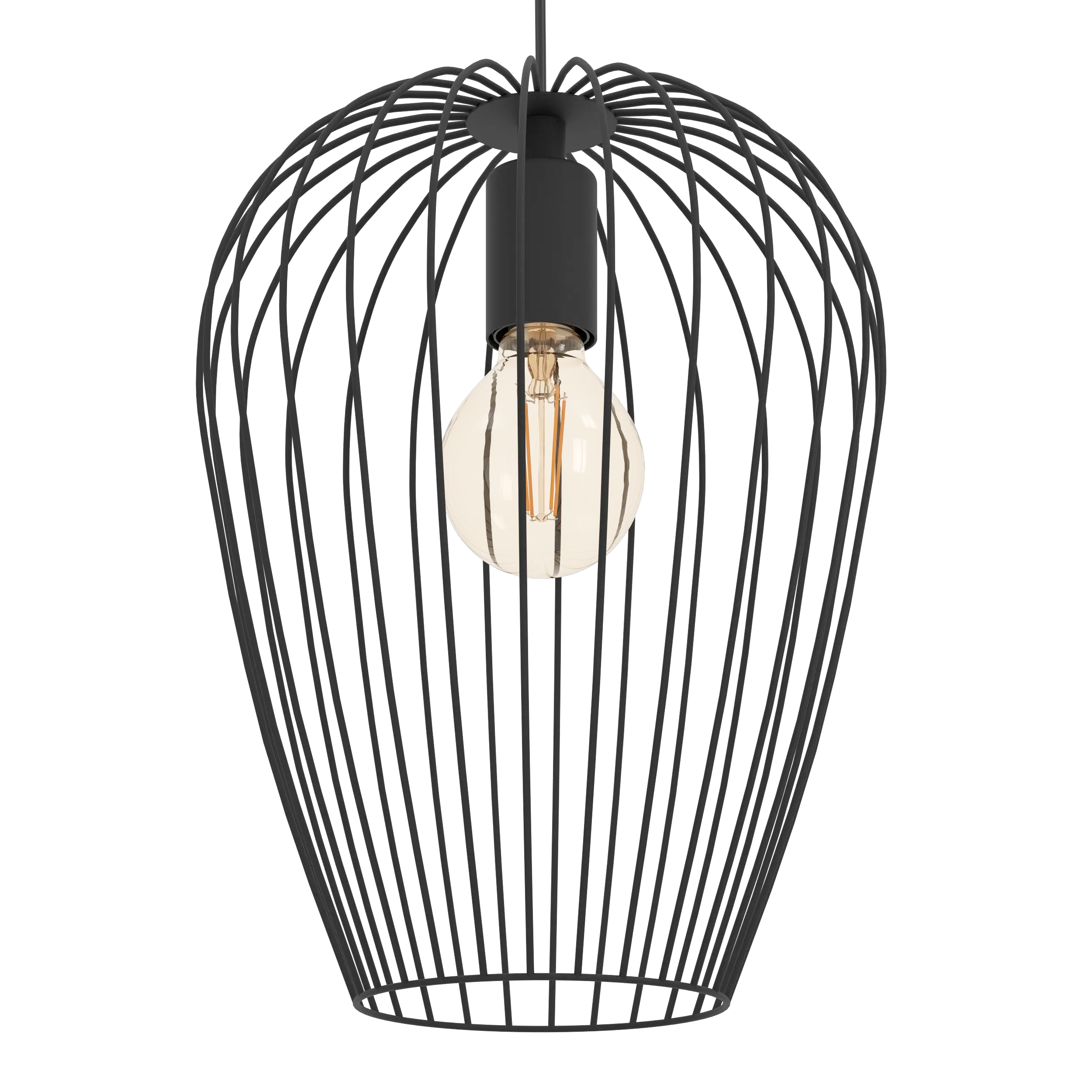 Modern industrial pendant design – Black steel wire lampshade creates a striking Lamp-and-shadow effect, suspended from a matching black canopy (model49472 Newtown).