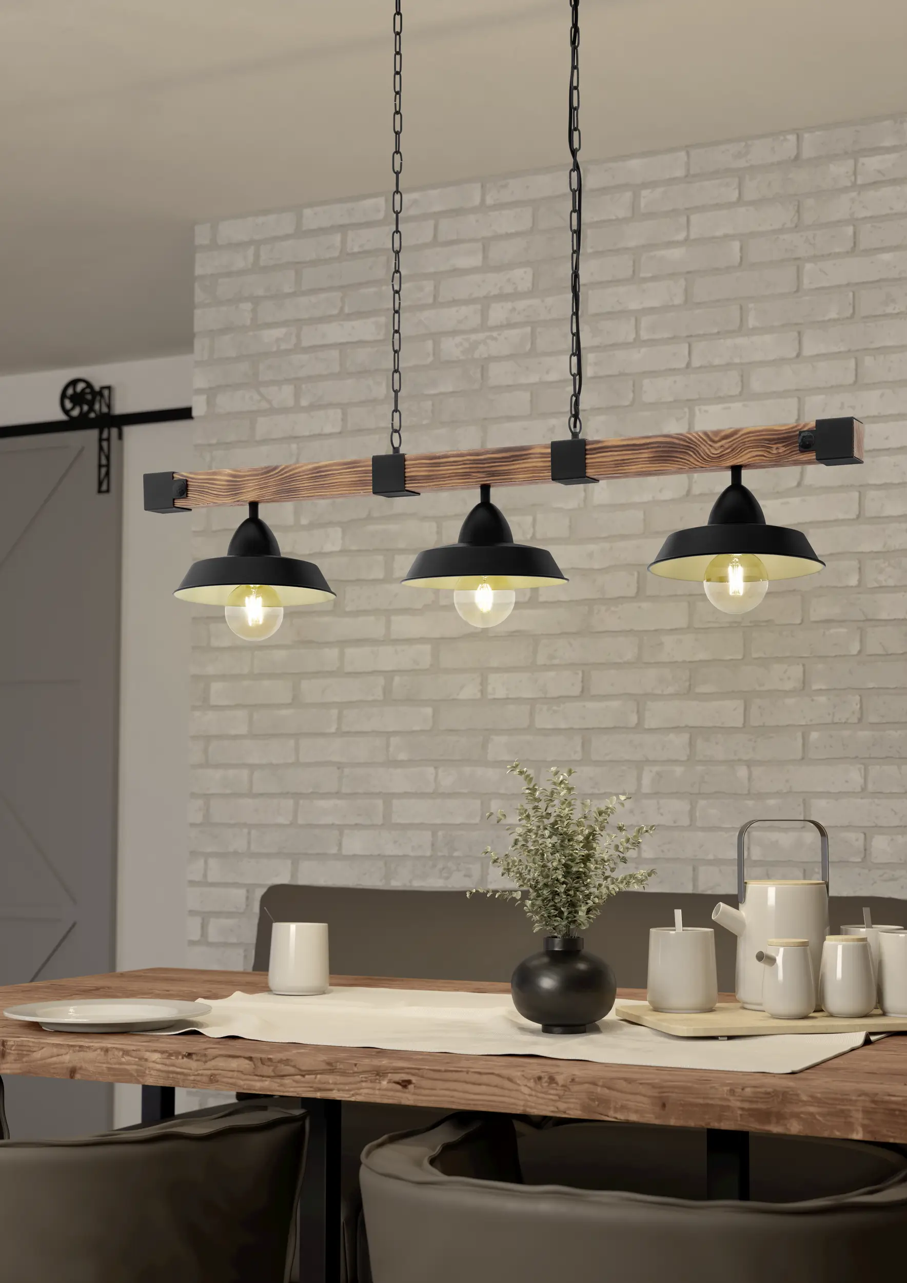 Vintage Industrial Charm: The Oldbury pendant blends a rustic wood beam with matte black steel shades to create an eye-catching vintage-industrial look—great for kitchen islands, dining tables, or loft-style interiors .