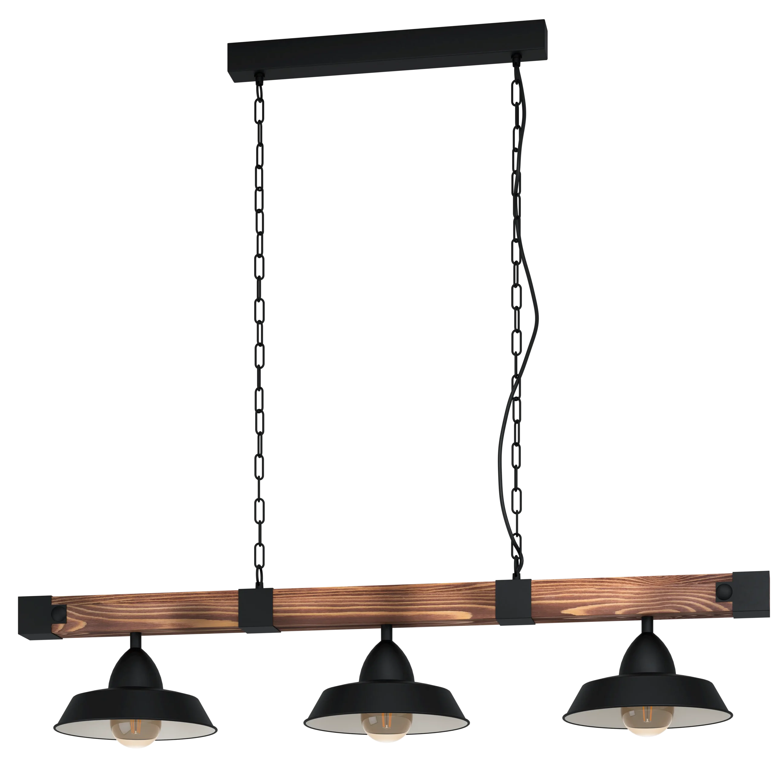 Oldbury 3‑Light Pendant – Black Steel Shades on Rustic Wood Beam, 1.18m Length, E27 Sockets, 60W Max – Vintage‑Industrial Accent Lighting