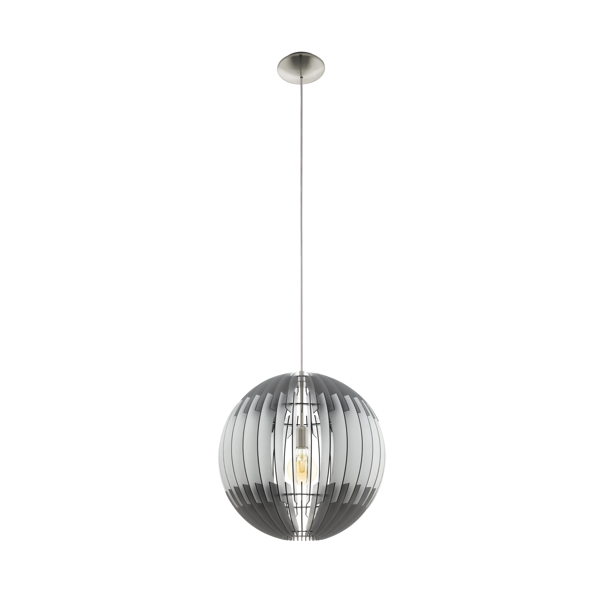 Striking Slatted Globe Design: Steel-slat spherical shade finished in satin-nickel with natural wood detailing—creates a modern sculptural focal point for living or dining spaces.
