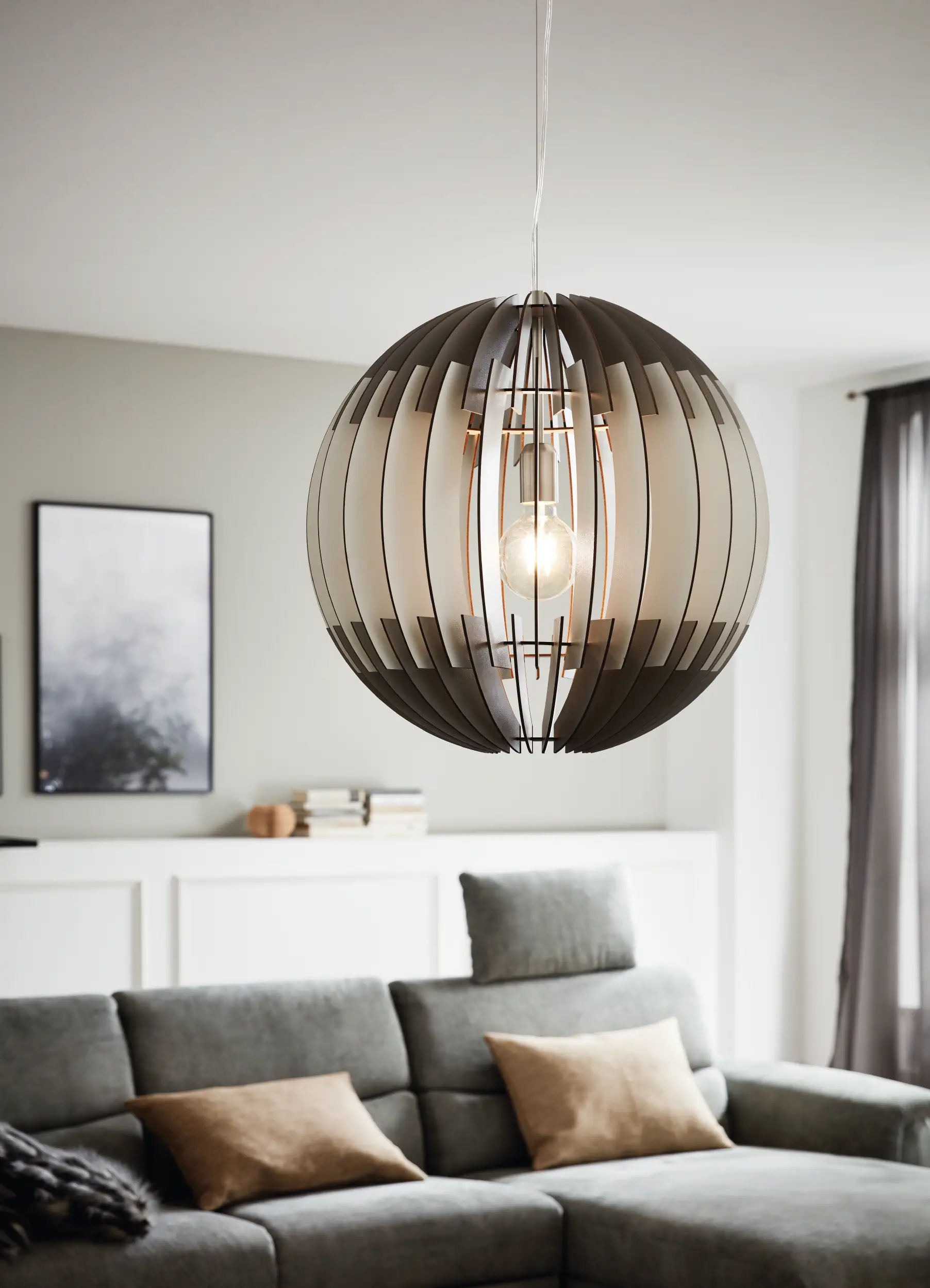 OLMERO Pendant Light – 1×E27 Socket, Satin Nickel Finish with Grey & White Wooden Slats, 60W Max, 50cm Diameter, 1.5m Adjustable Cord, Ideal for Modern Living & Dining Spaces