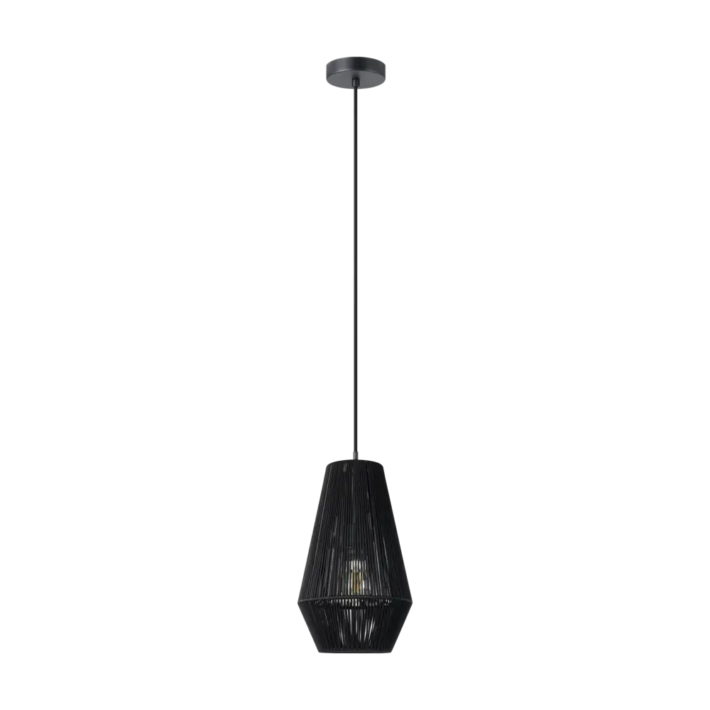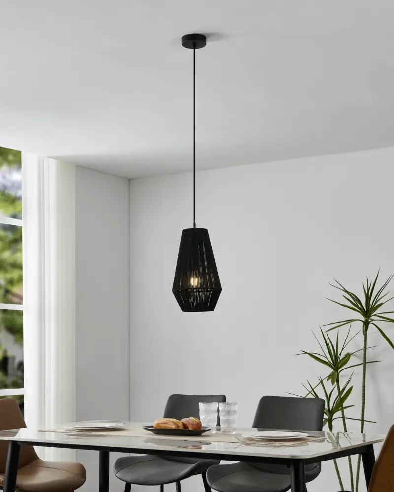 Striking Black Steel & Fabric Shade – Sleek and modern pendant crafted from durable black steel, offering a minimalist aesthetic with a matching black fabric shade for subtler illumination.