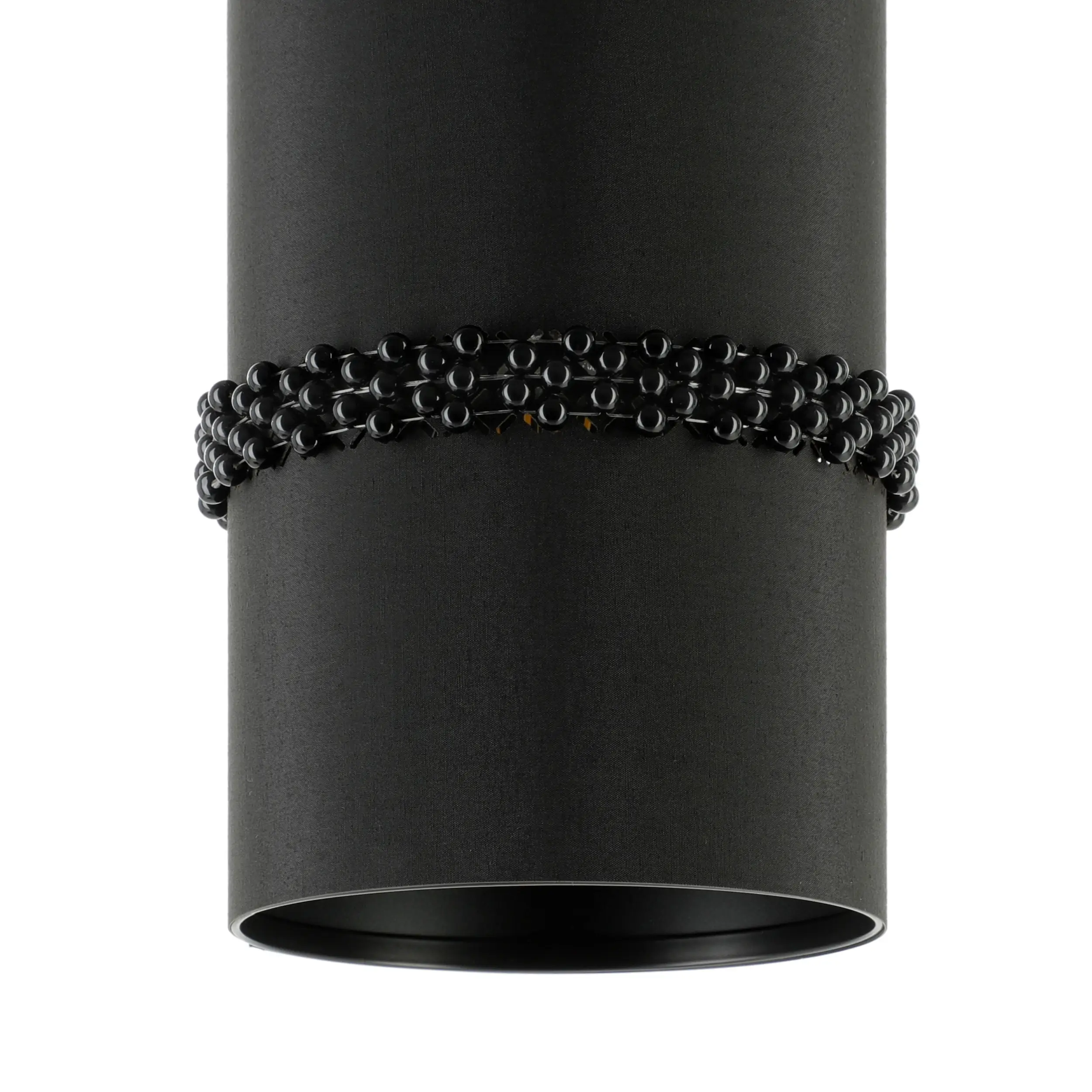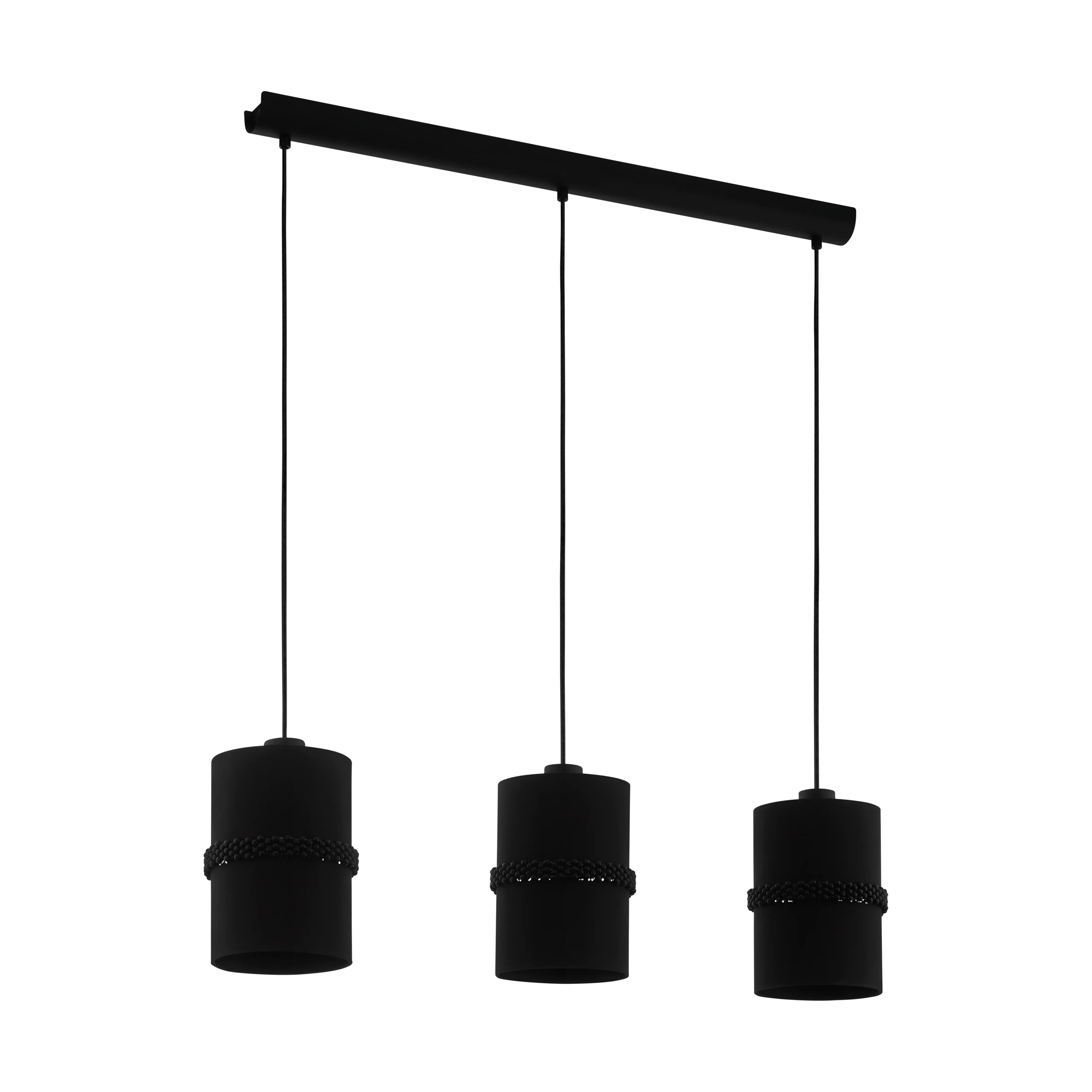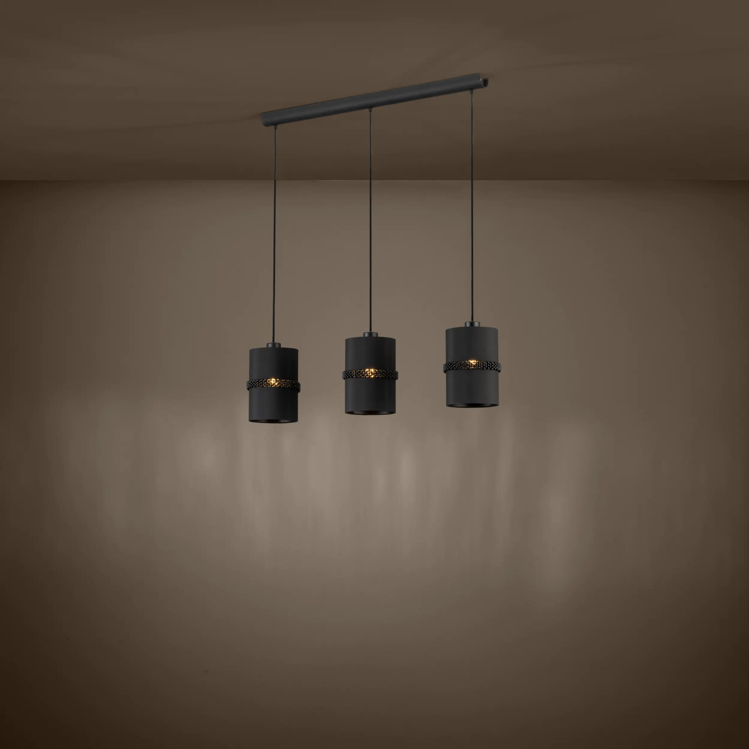 Modern Trio Scheme – Features three black fabric drum shades with inner glass diffusers suspended from a slim steel bar, offering a sleek, uniform design for contemporary interiors.