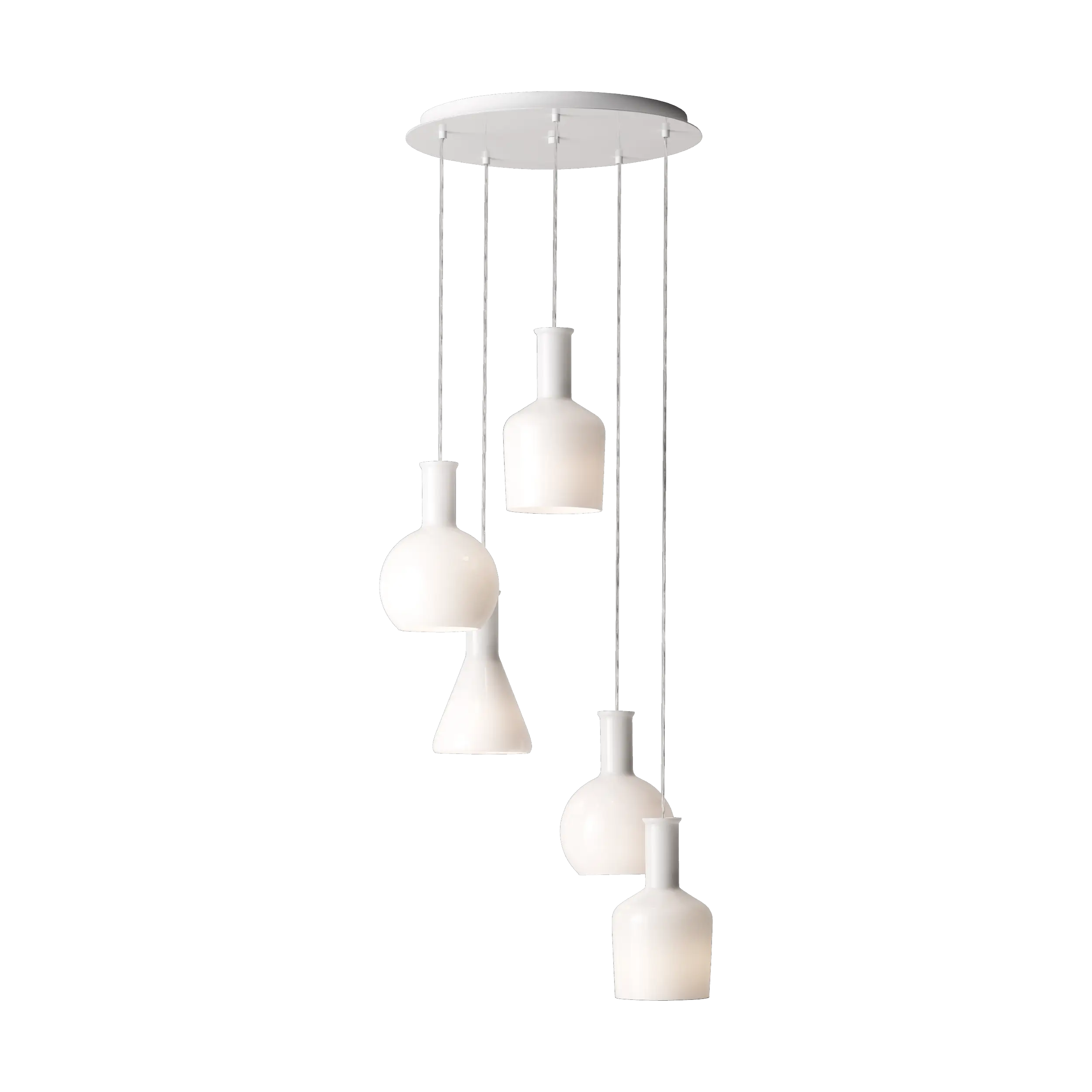 Classic Crystal-Inspired Design: Elegant 5-arm pendant crafted from white-painted steel and finished with glossy opal glass shades—adds a refined, luminous statement to any interior decor.