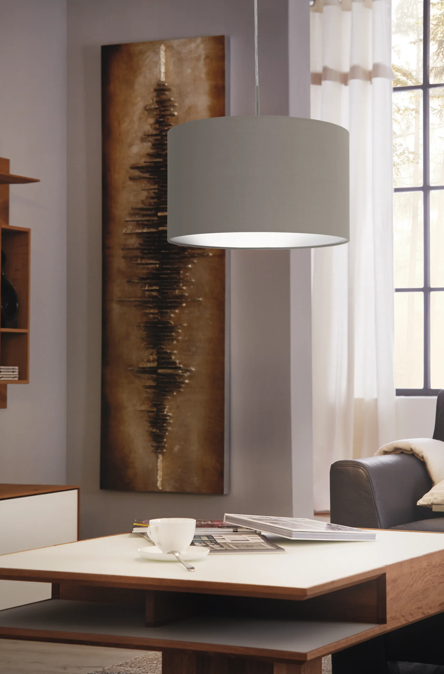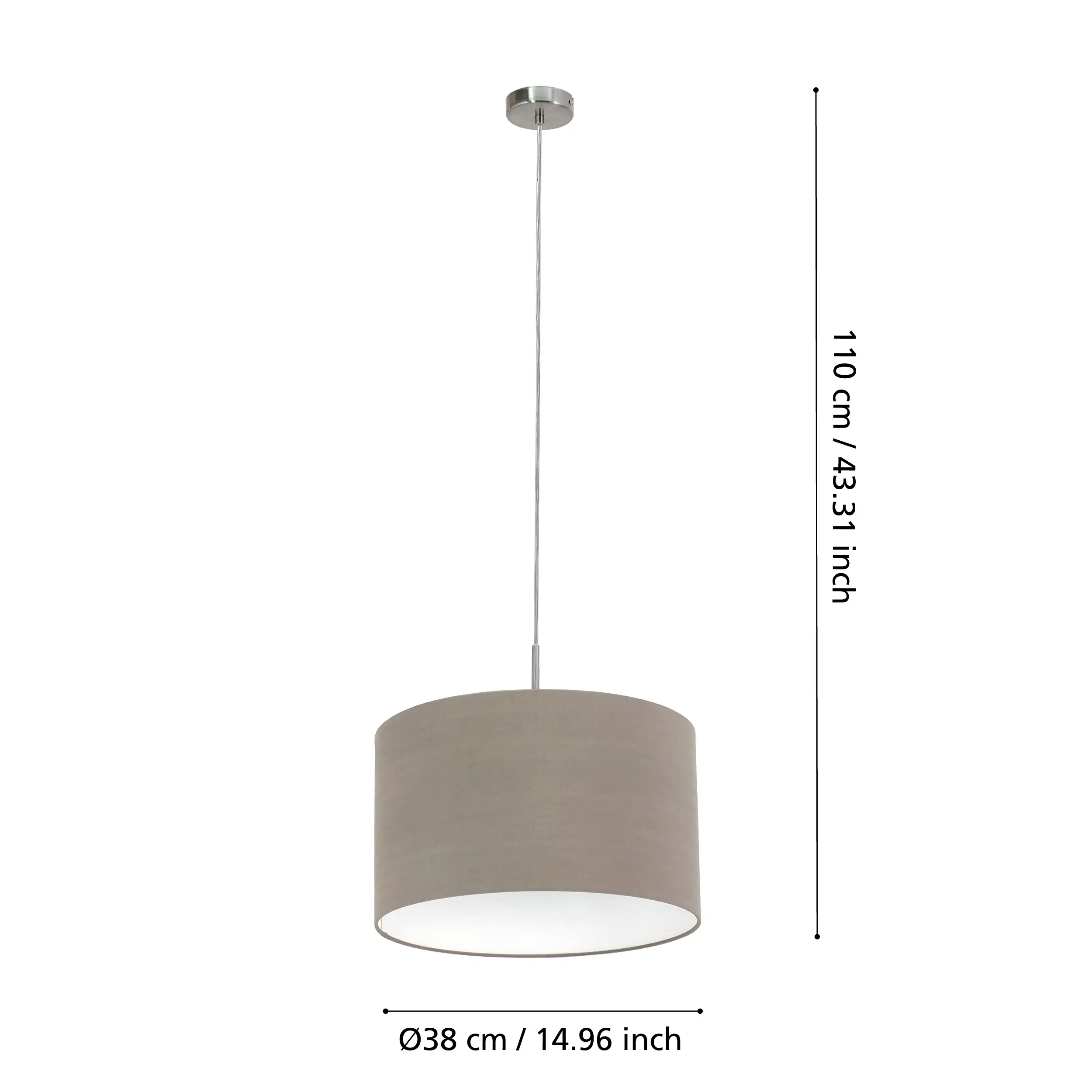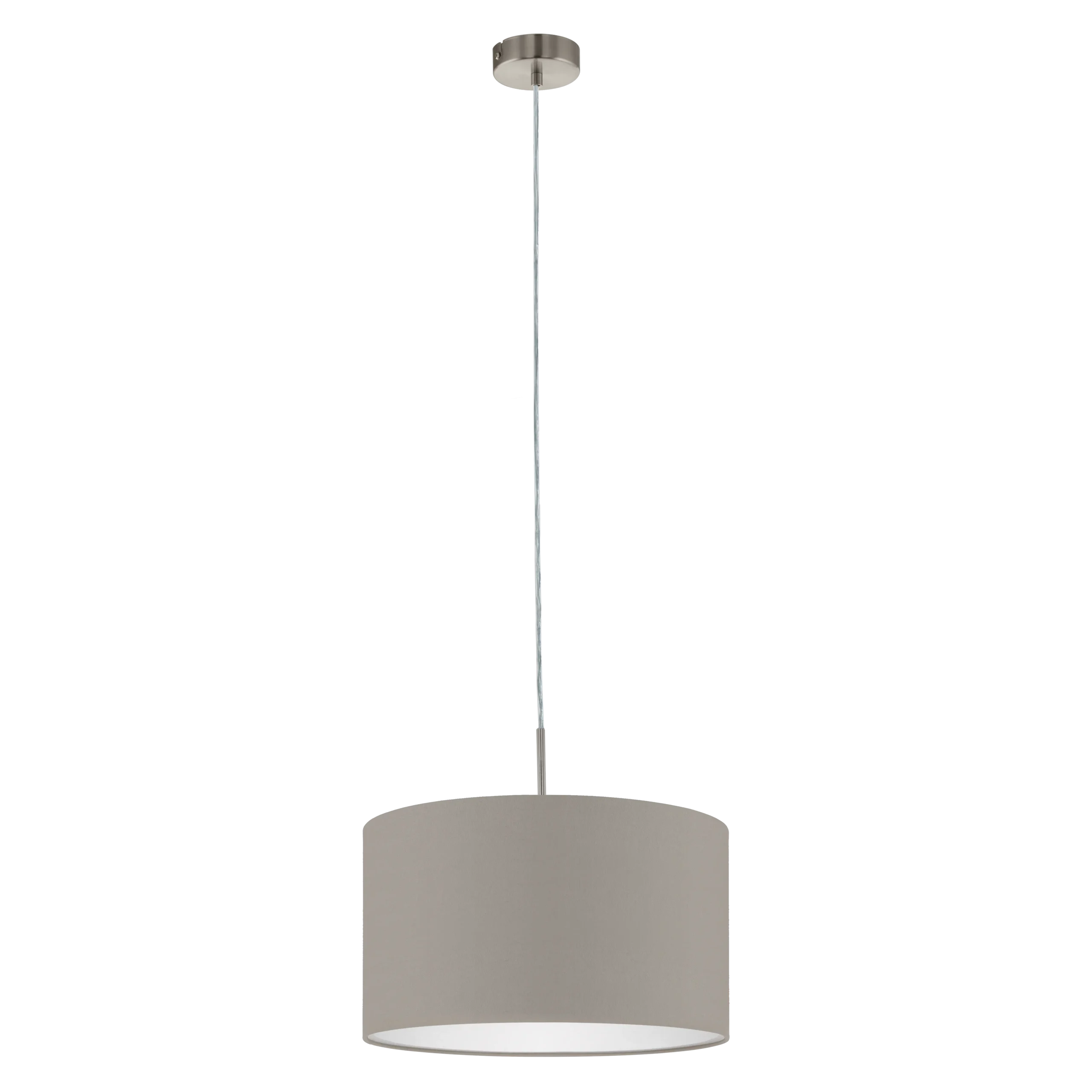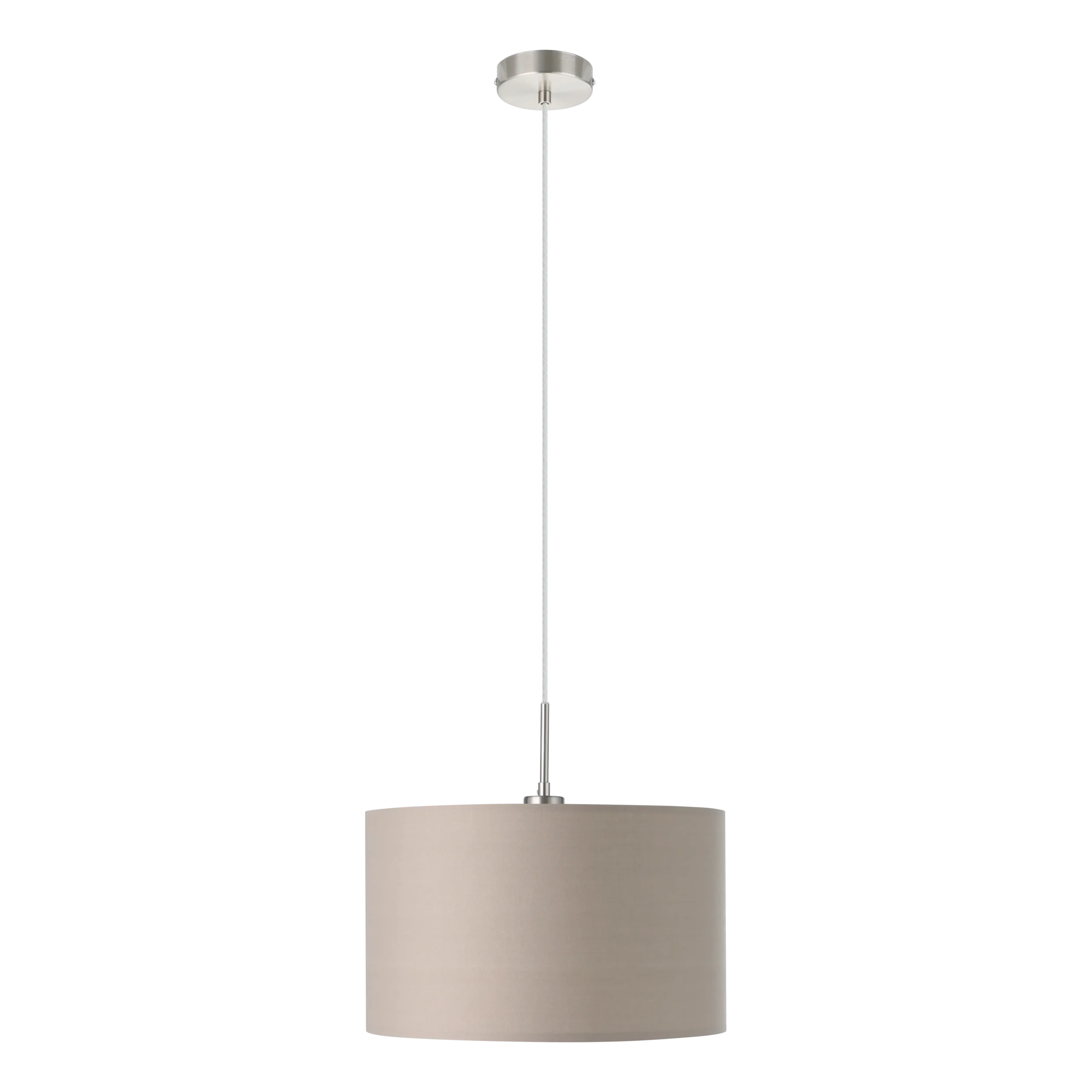 Stylish textile pendant – Elegant satin nickel steel frame with a taupe fabric drum shade blends seamlessly into living rooms, dining areas, offices, or hallways.