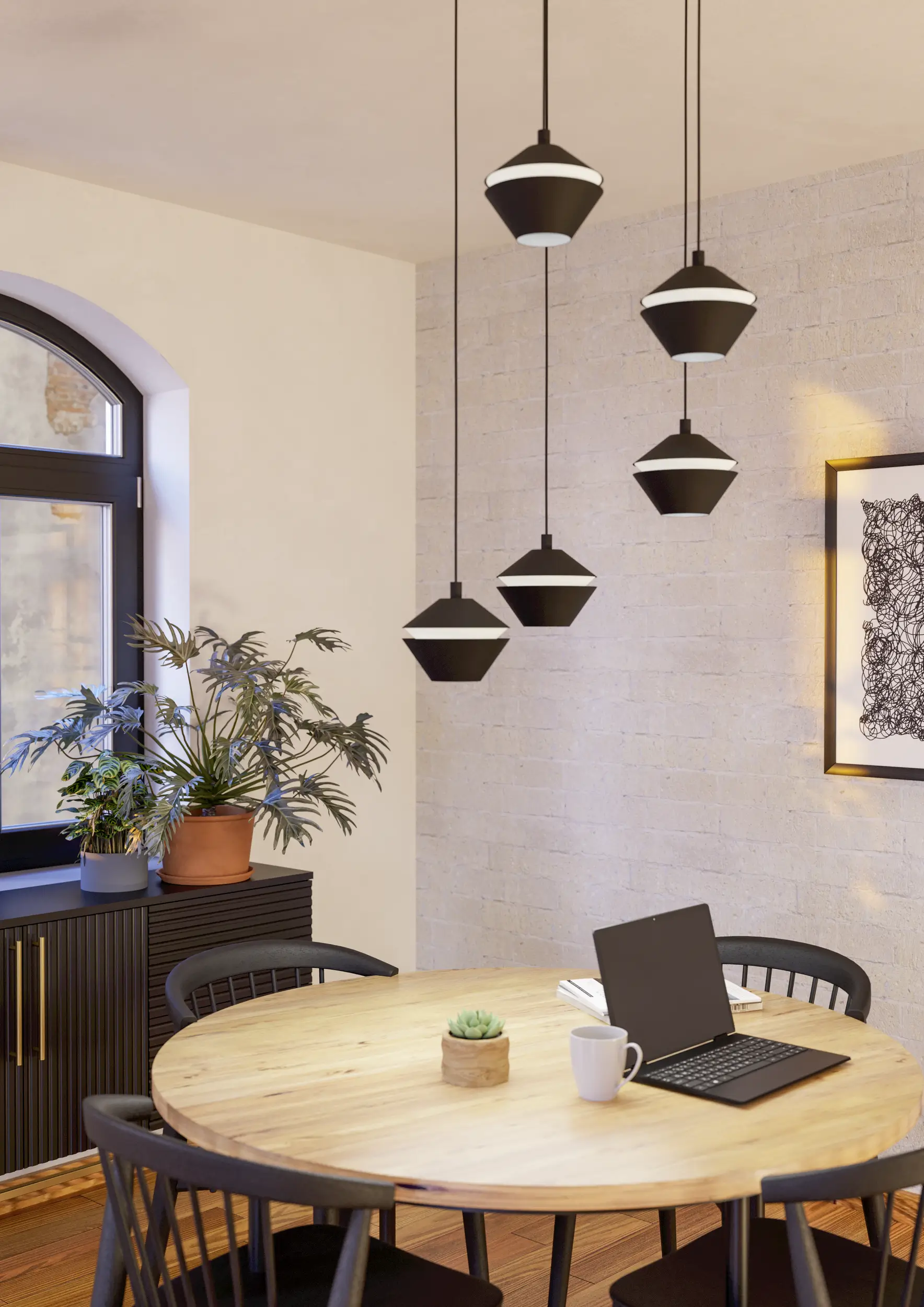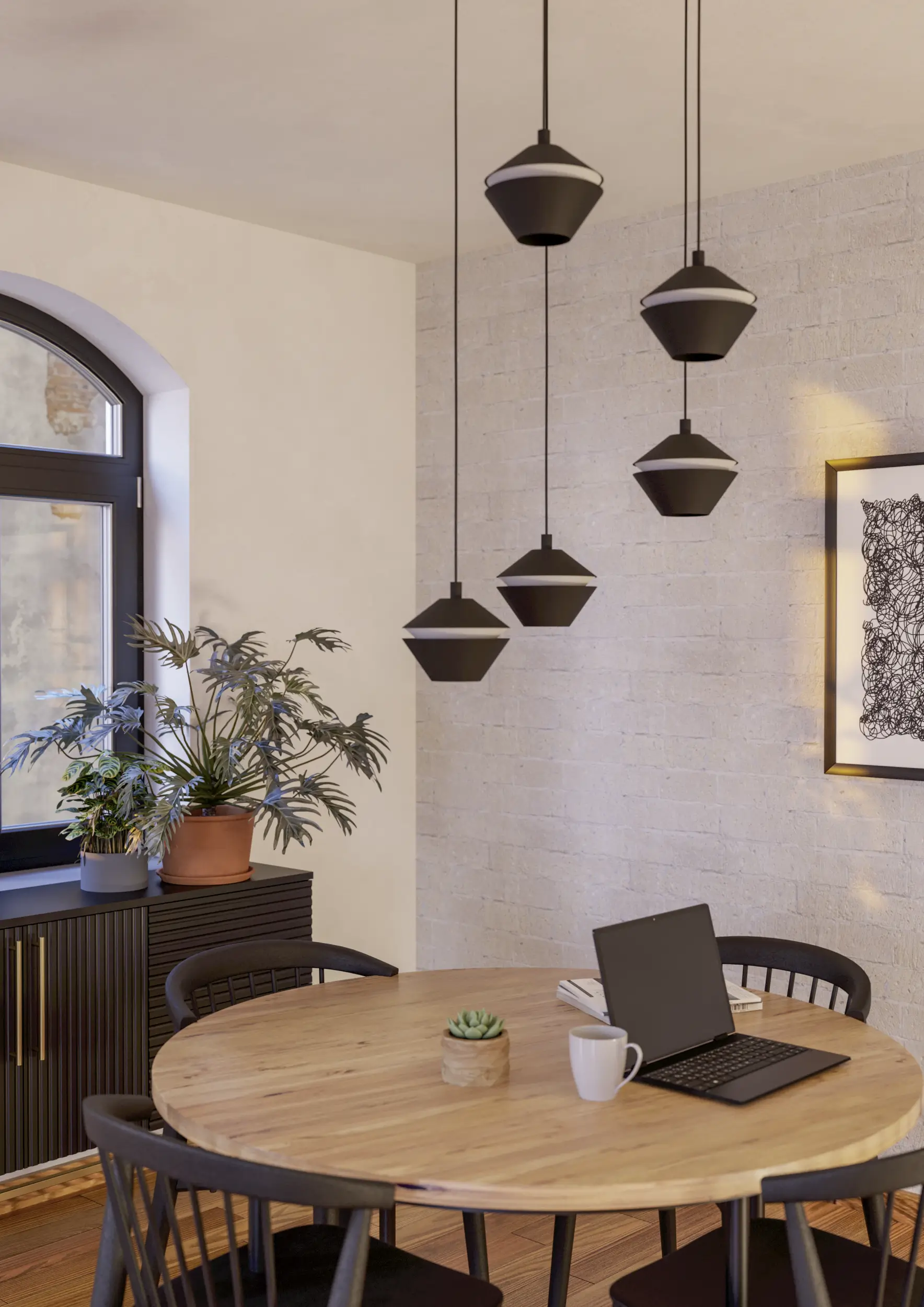Contemporary Pendant Design: Sleek black steel body with a minimalist aesthetic, perfect for modern interiors.
