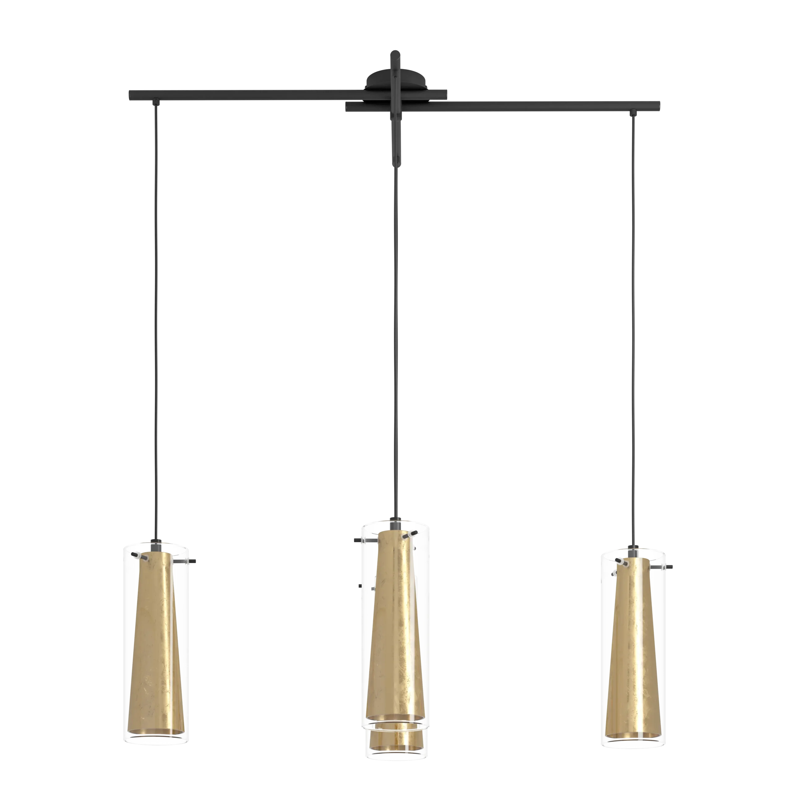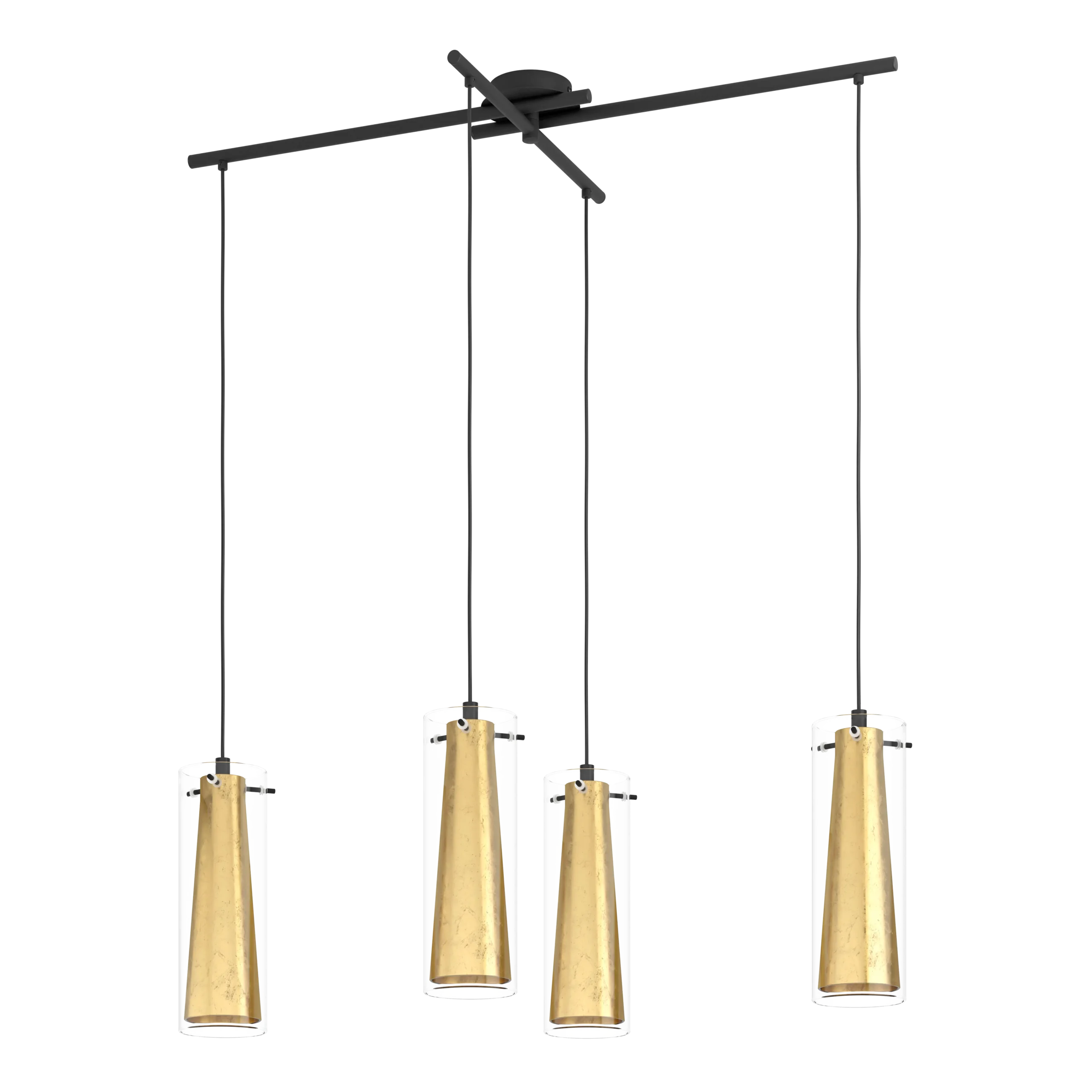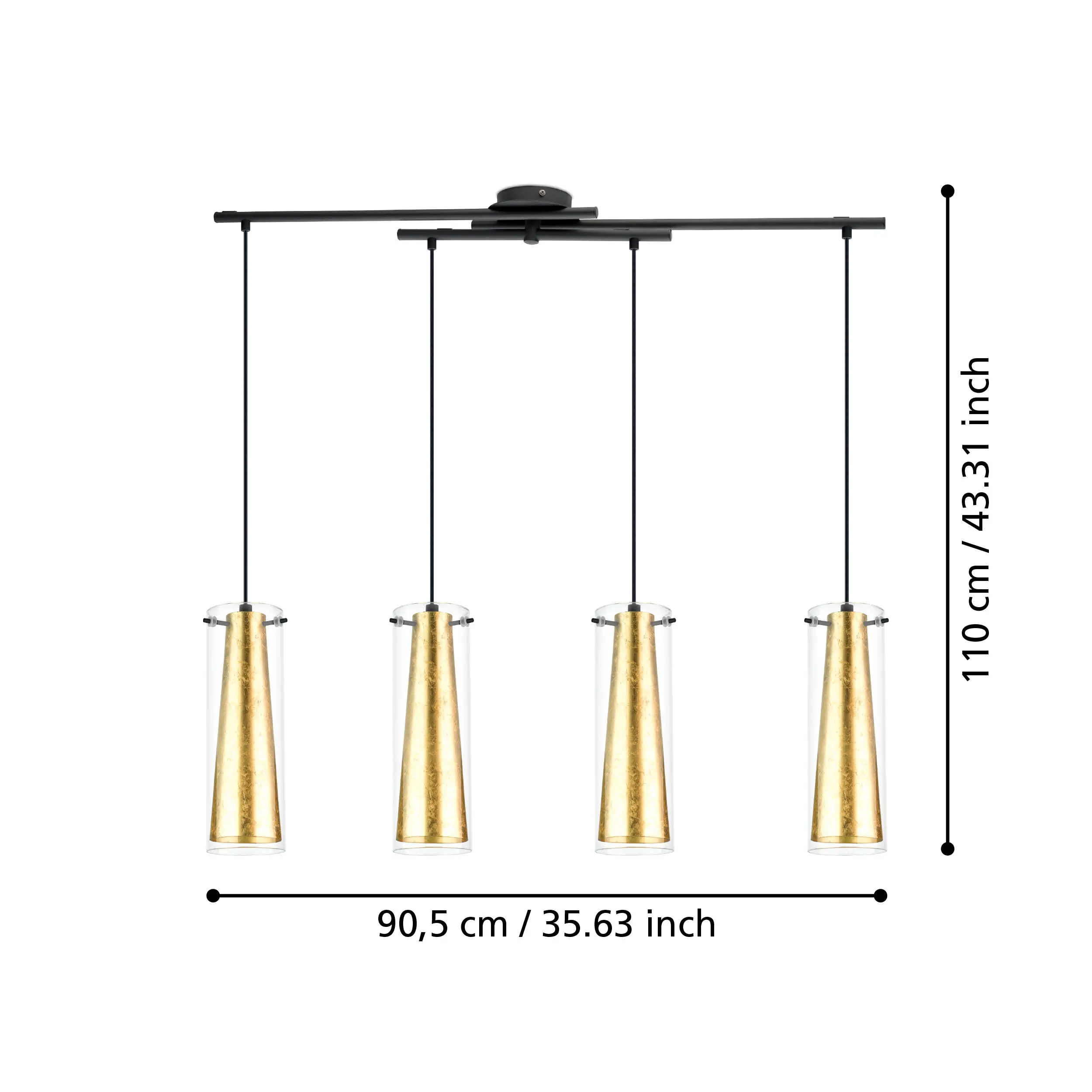 PINTO Gold 97653 4‑Lamp Bar Pendant – Black Steel with Clear & Gold Glass Shades, 90.5cm L × 36cm W × 110cm H, 4×E27, Dimmable, IP20 Indoor