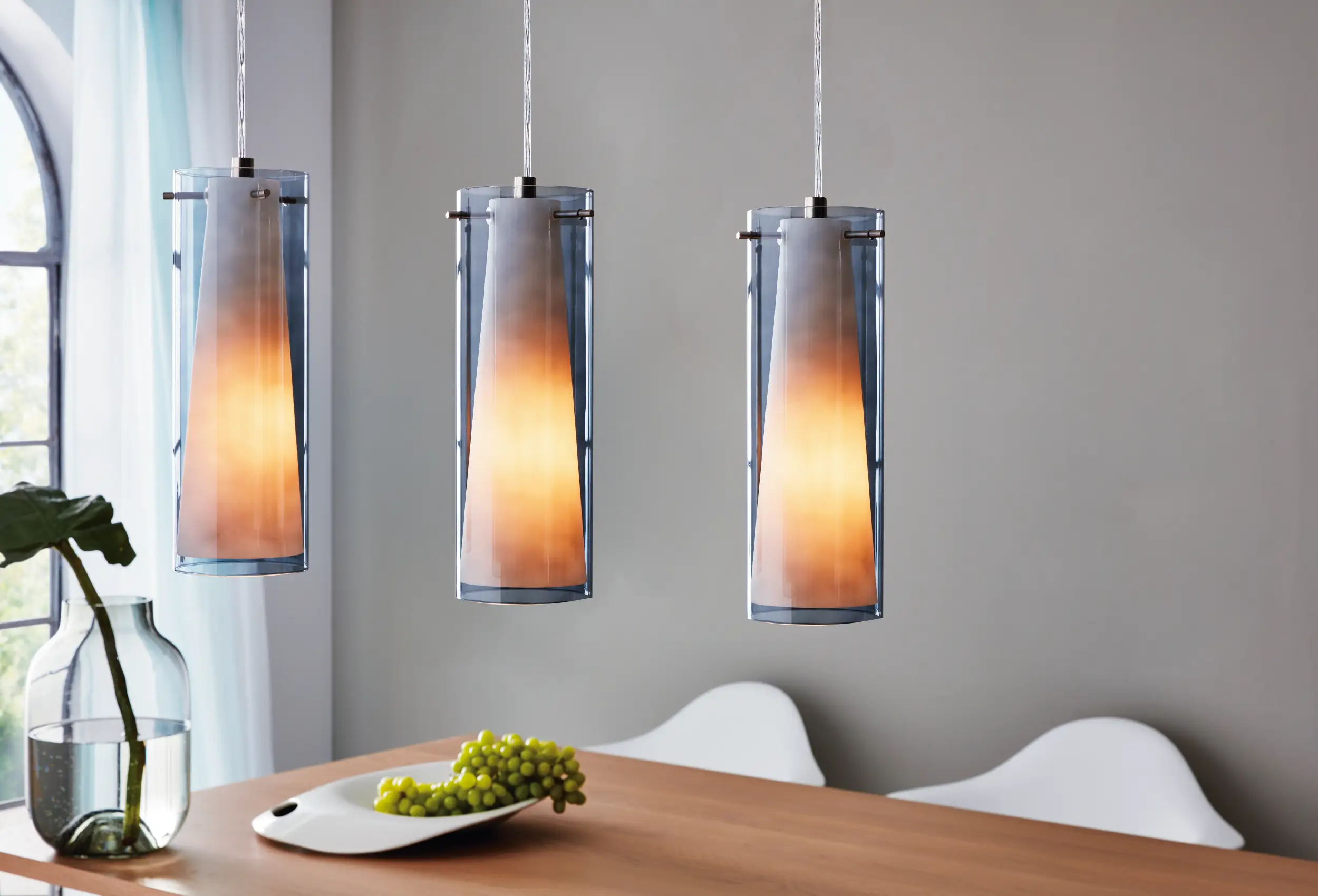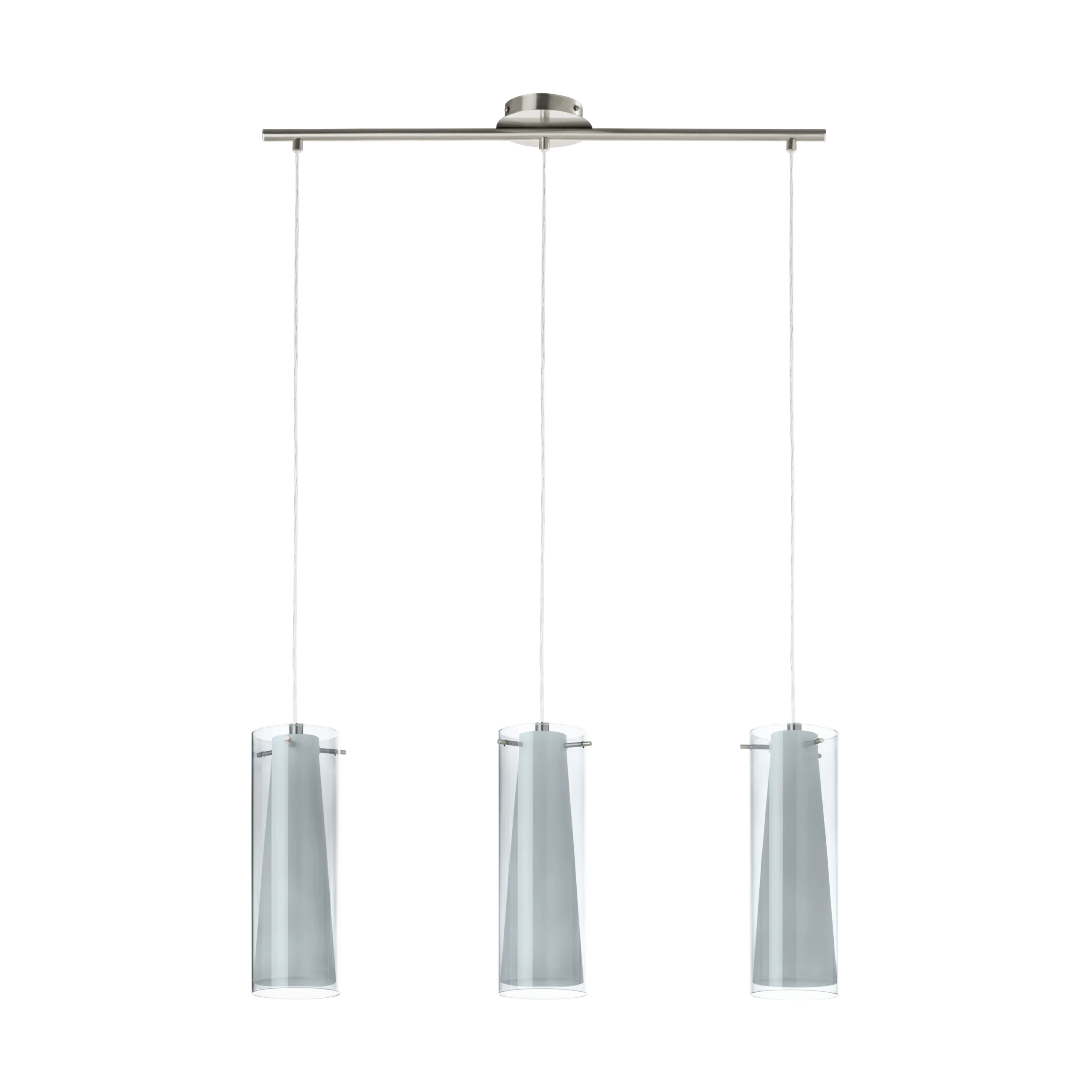 Striking Matte-Nickel & Dual Glass Silhouette – Features three sleek smoked‑glass cylinders overlaying white inner shades, suspended from a matte-nickel metal canopy—perfect for modern kitchens, dining areas, or islands.