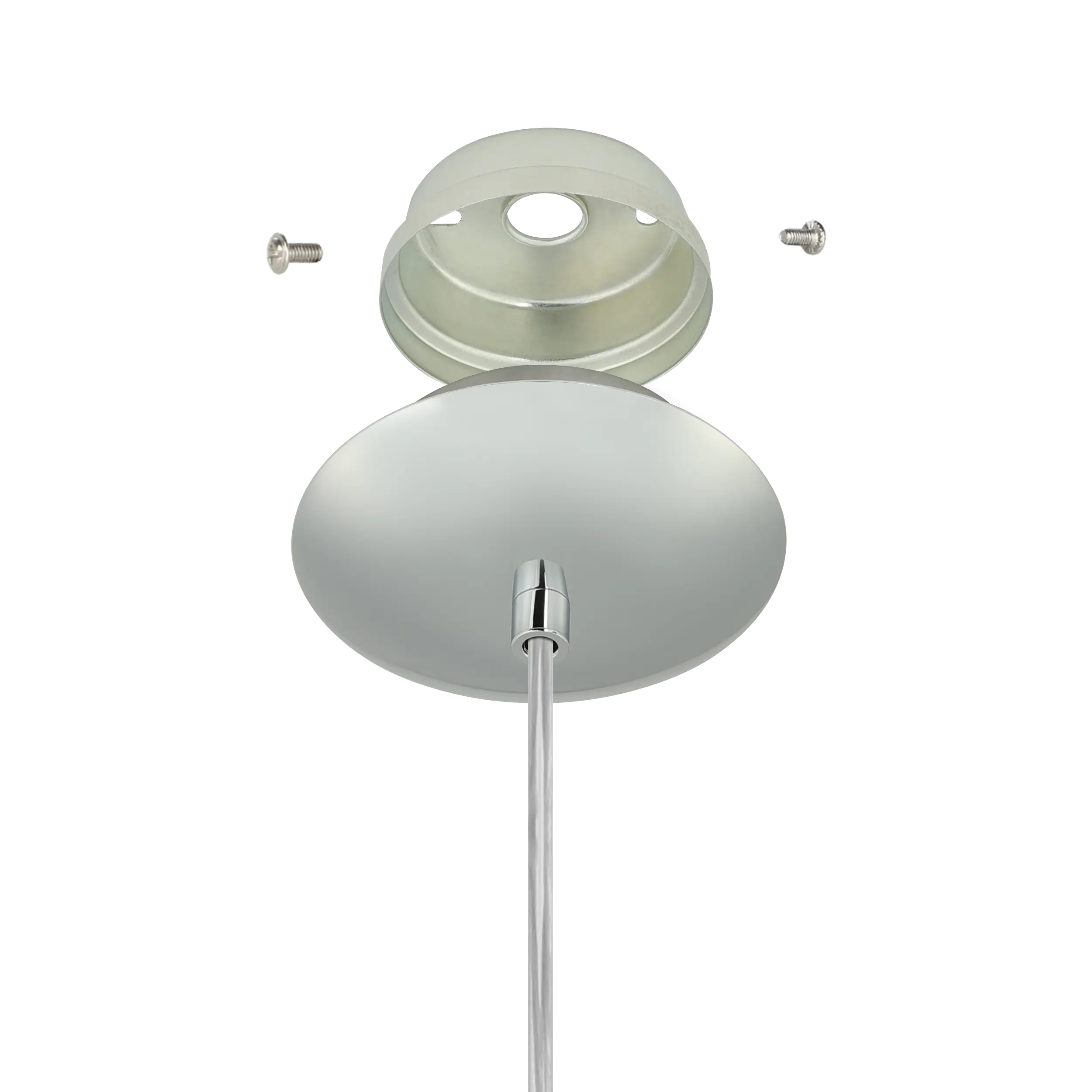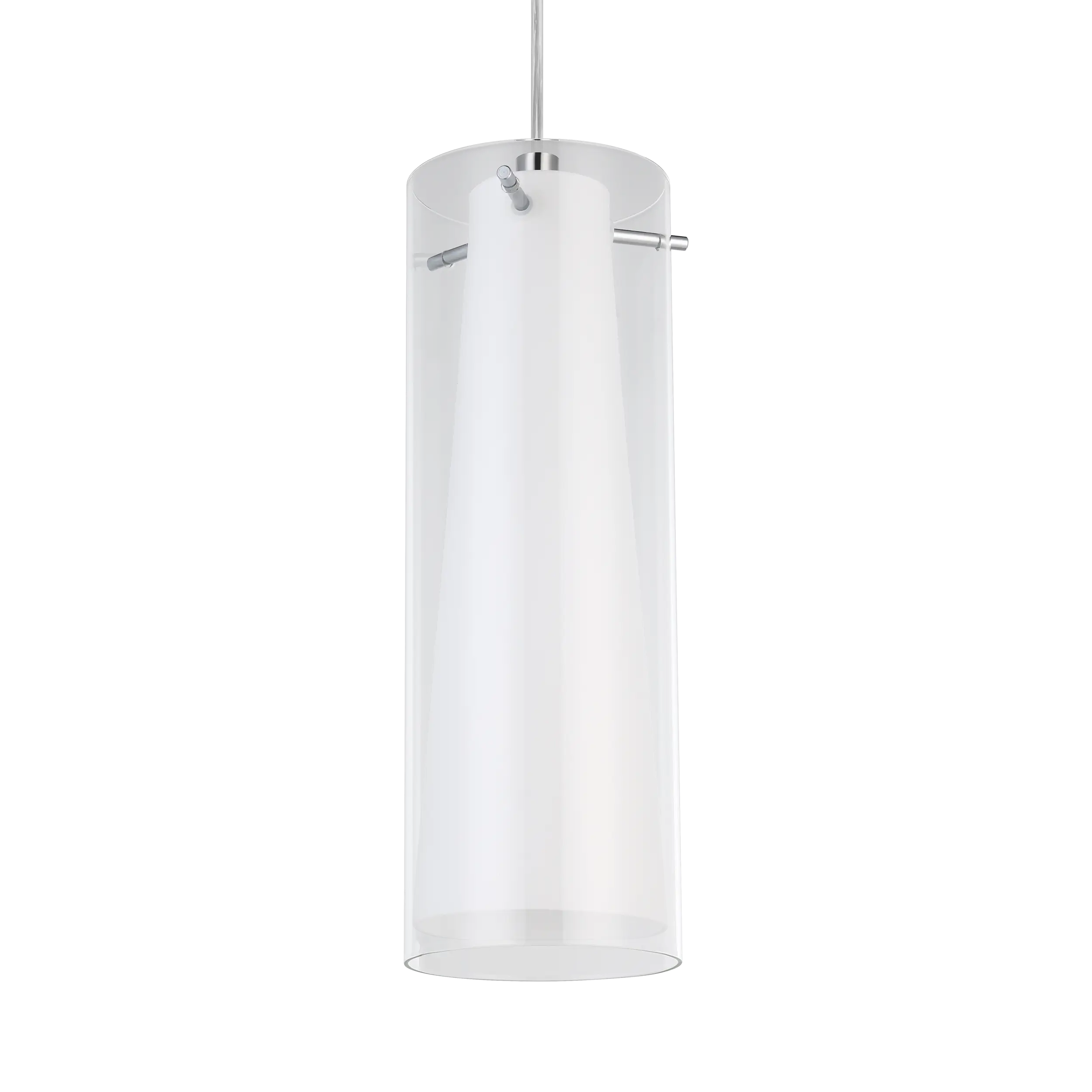 Stylish Two‑Layer Shade: Features a sleek chrome steel canopy and rod suspending a clear cylindrical outer glass with a conical opal inner shade—blending clean, minimalist lines with cozy, diffused lighting.