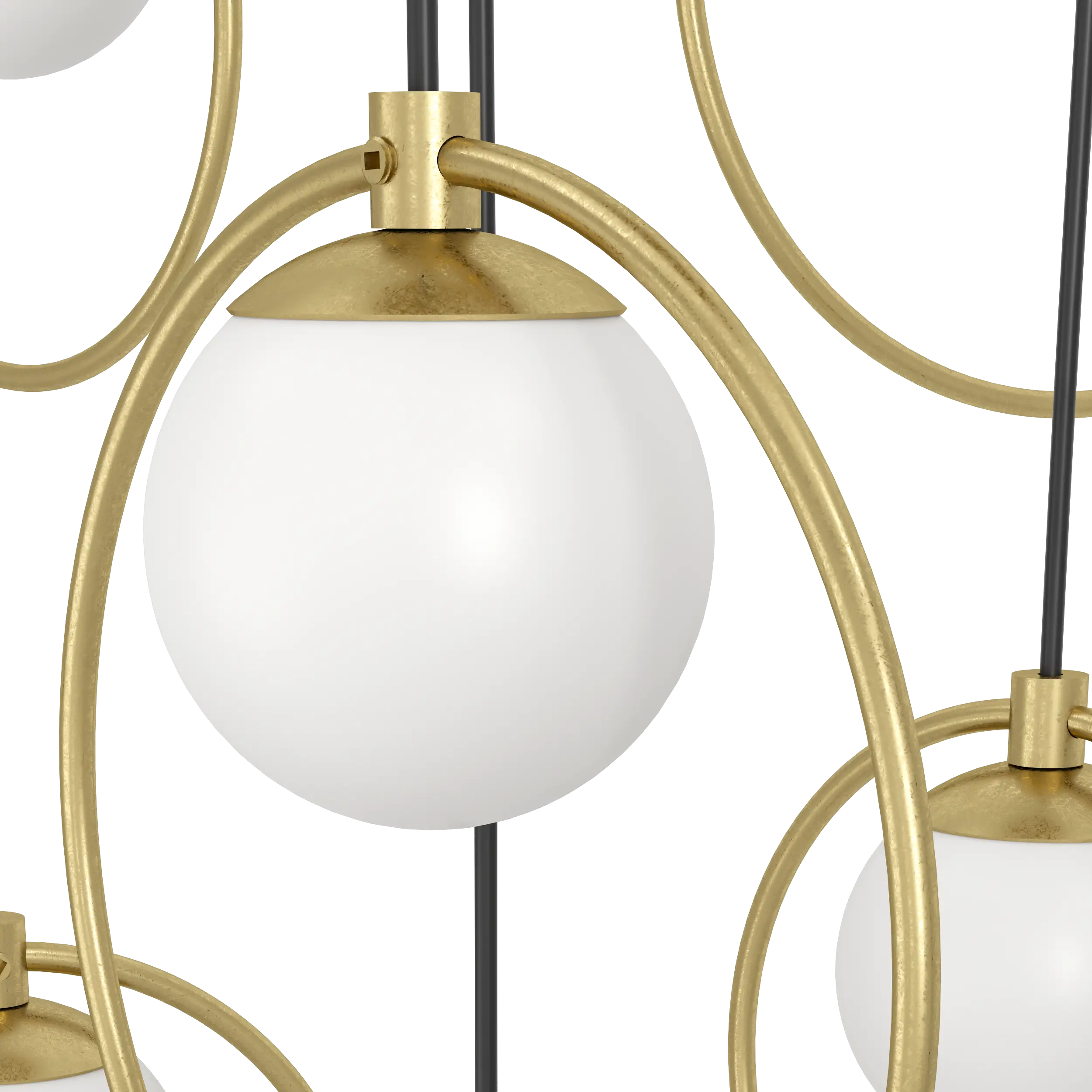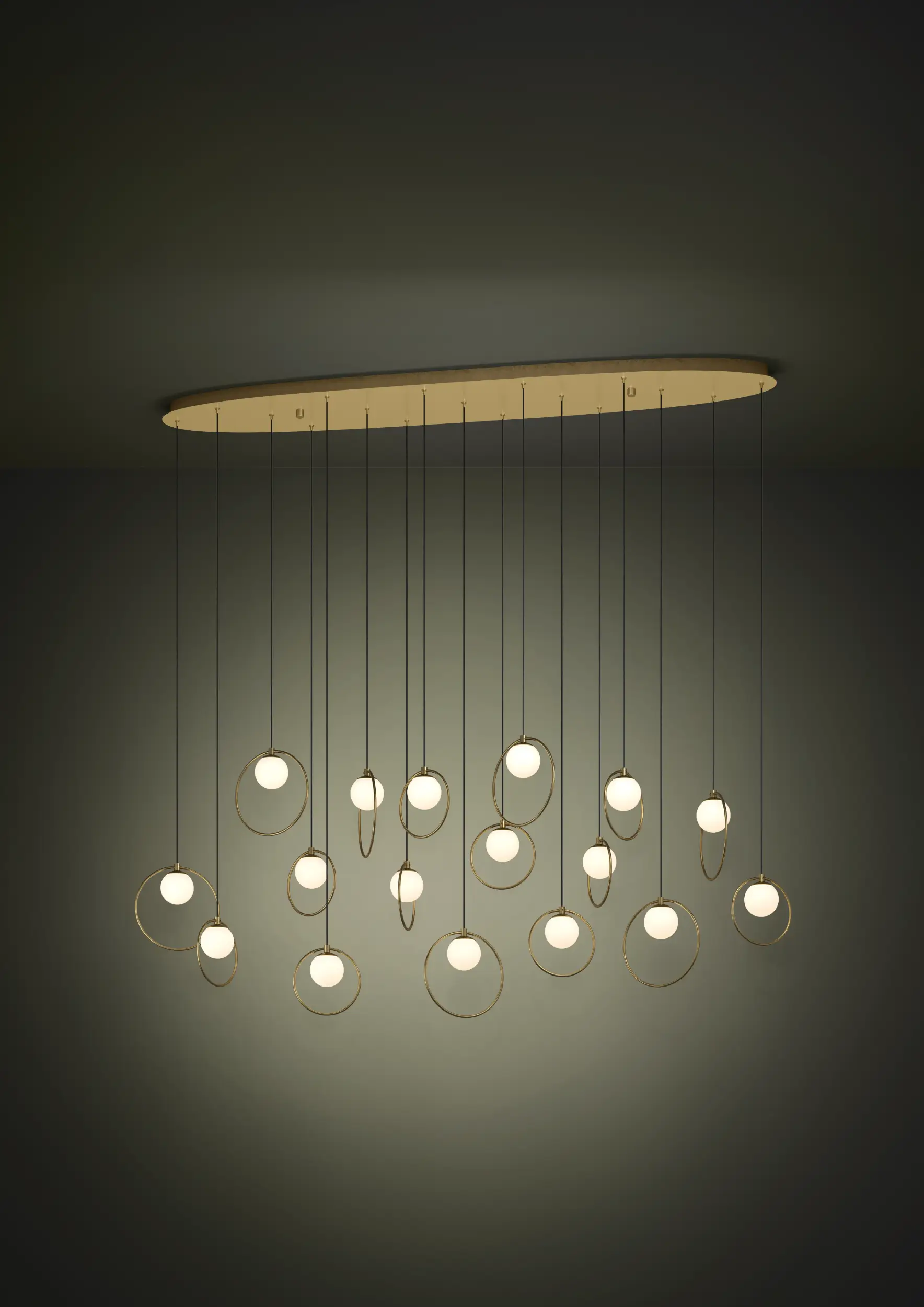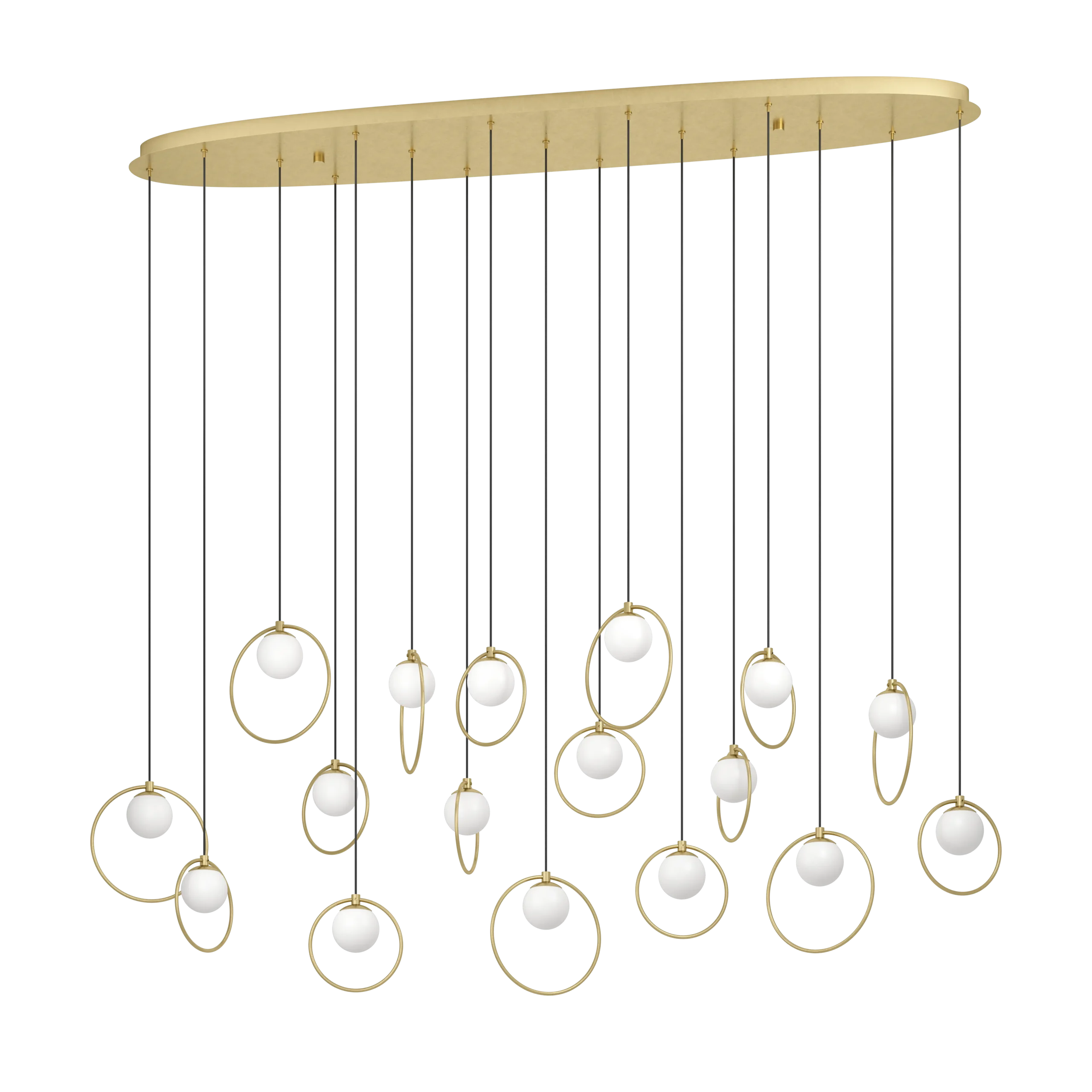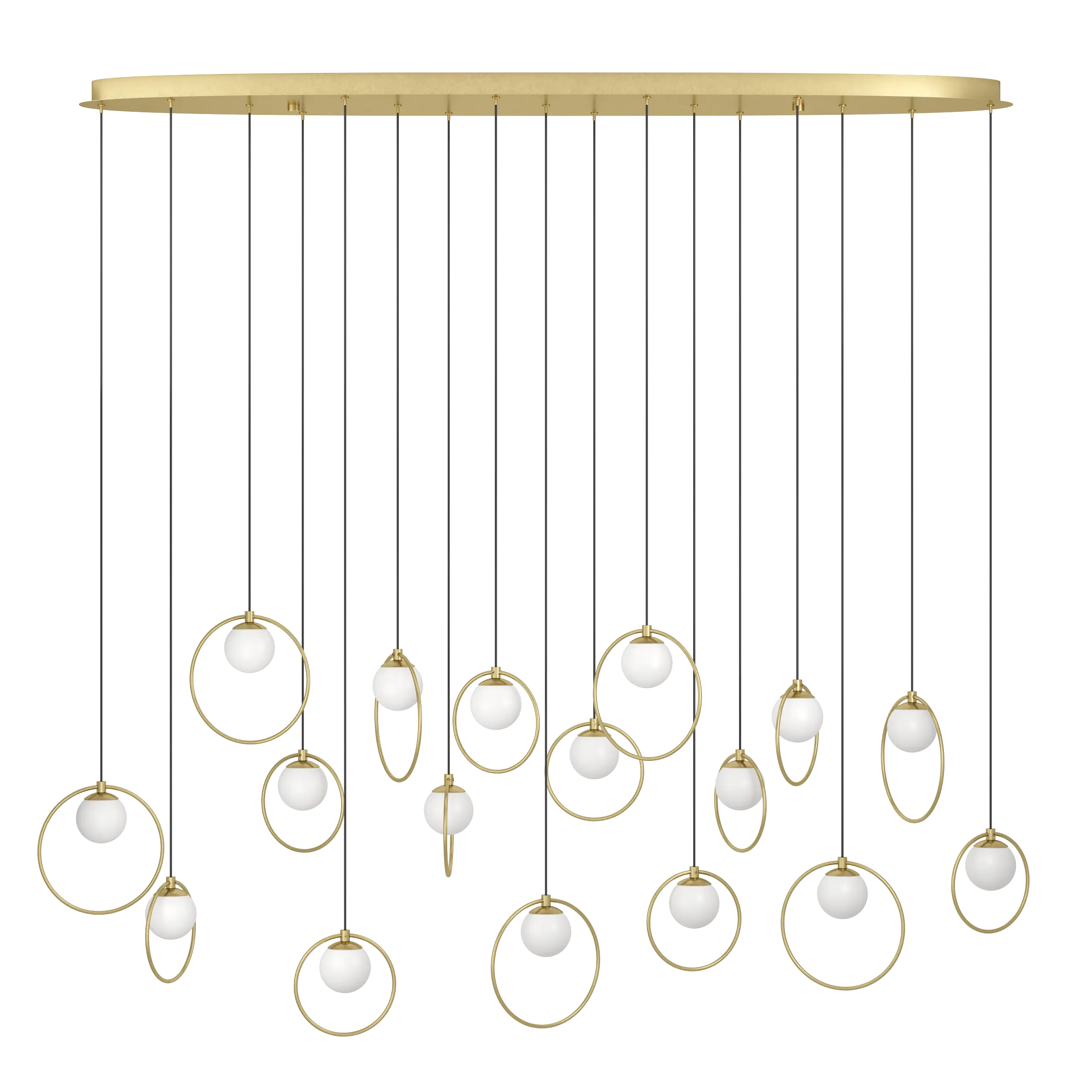 Striking architectural statement – Features 17 matte-opal glass spheres framed by brass-finish steel rings, suspended from a sleek canopy—designed to transform spacious dining rooms or foyers.