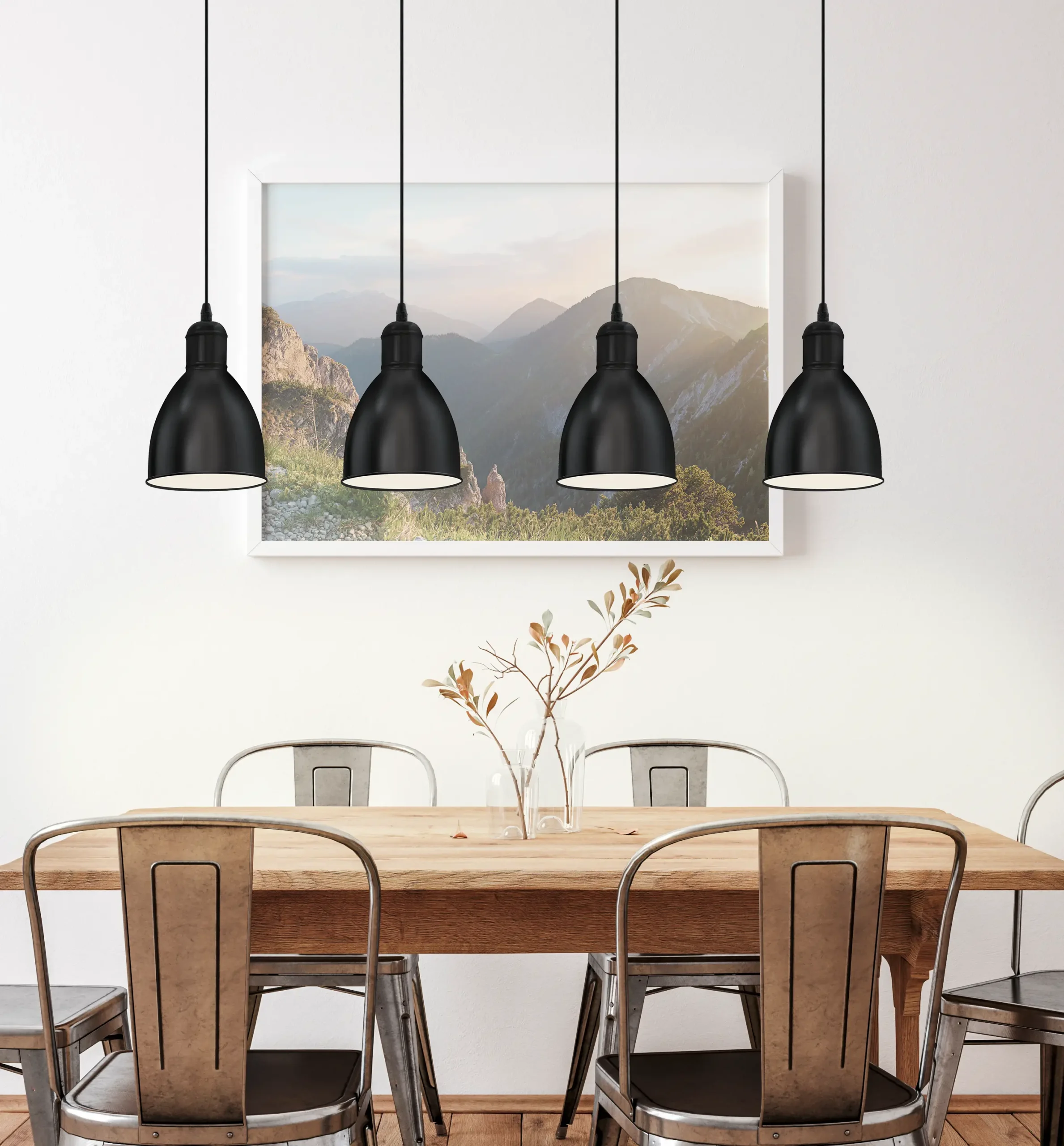 Vintage industrial charm – Four Black Steel candlestick‑style shades with a crisp white inside finish are mounted on a sleek 975×155mm black ceiling bar, adding bold style to kitchens, dining areas, or open-plan spaces.