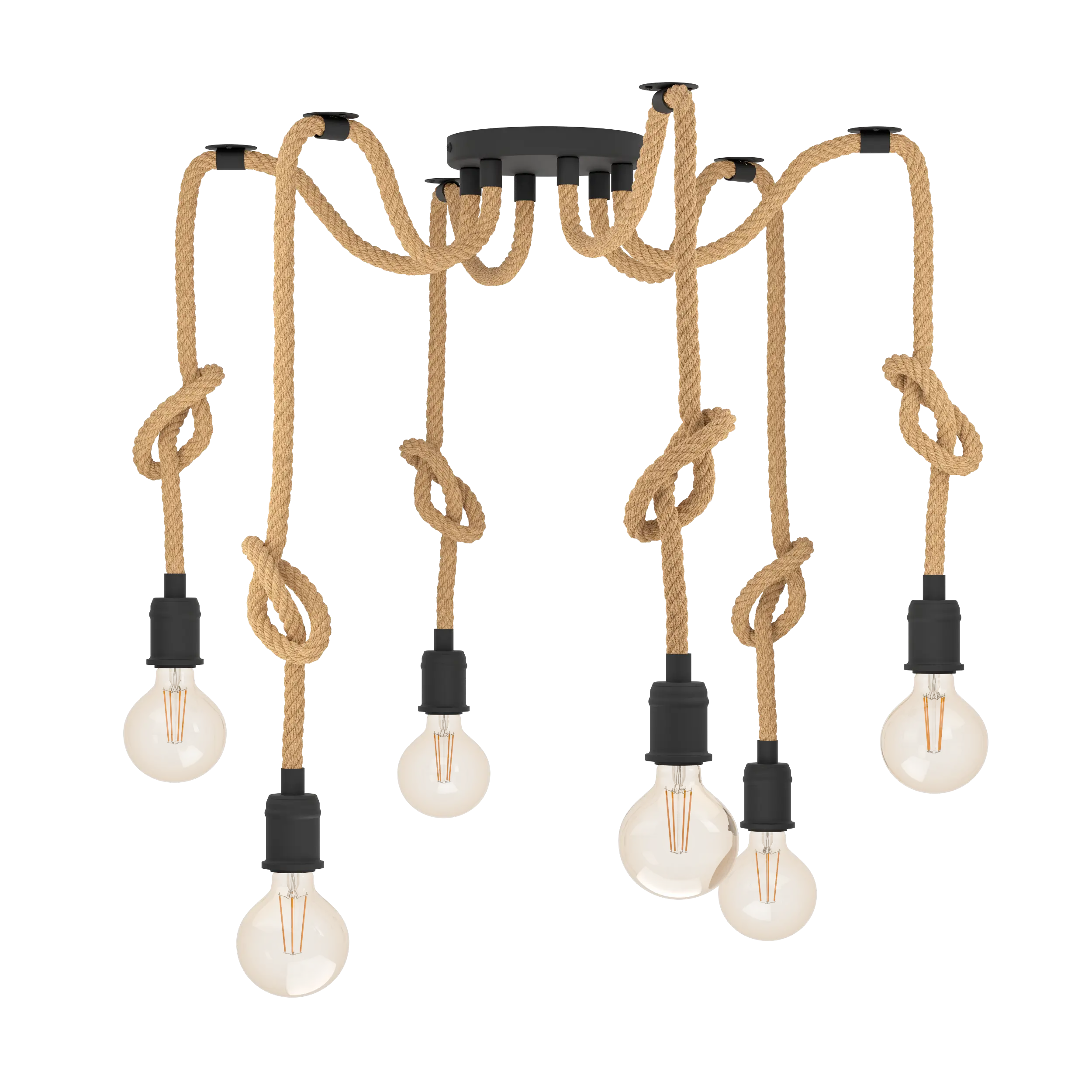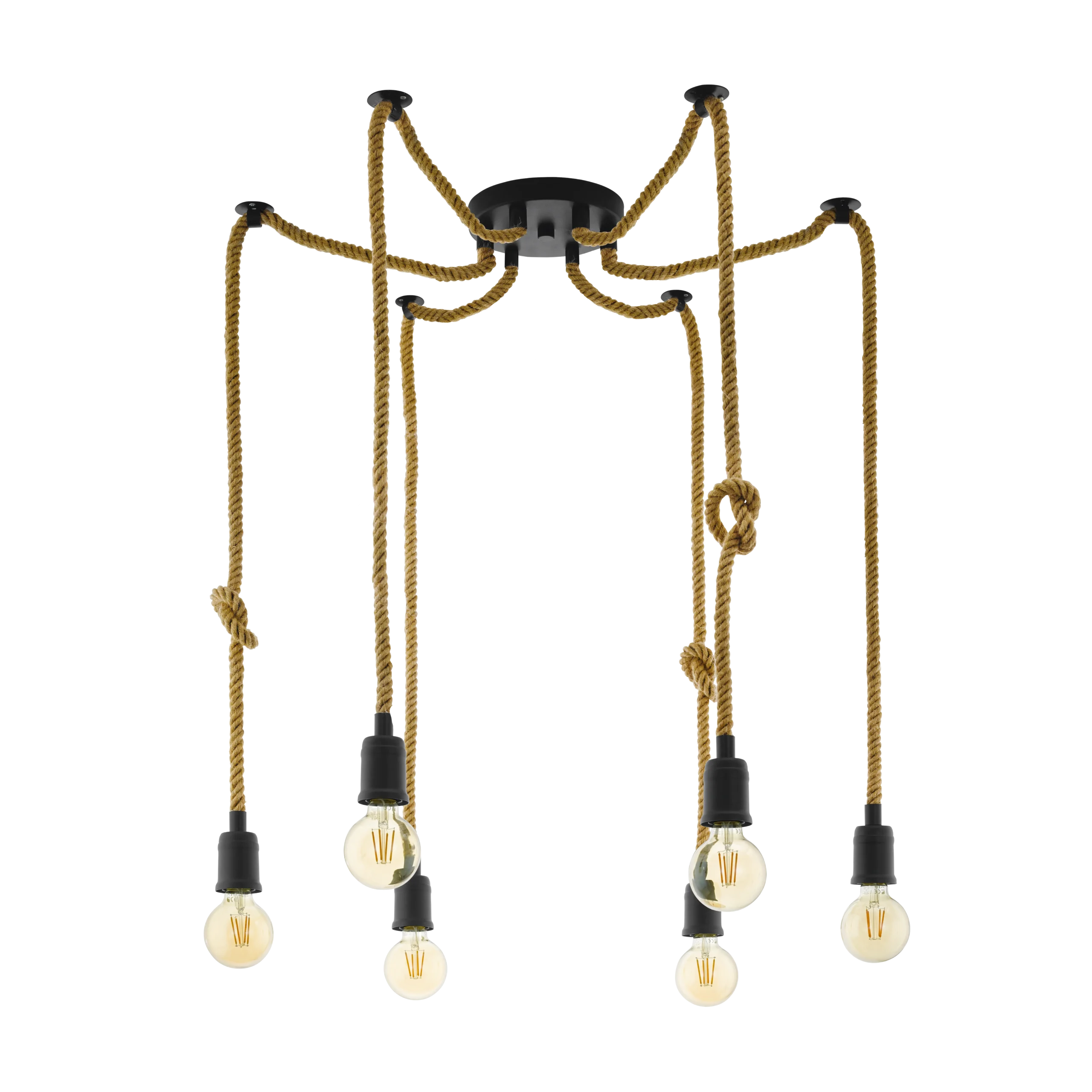 Rustic industrial design – features six black steel E27 lamp holders suspended by natural hemp ropes from a compact canopy, creating a charming factory‑style look.
