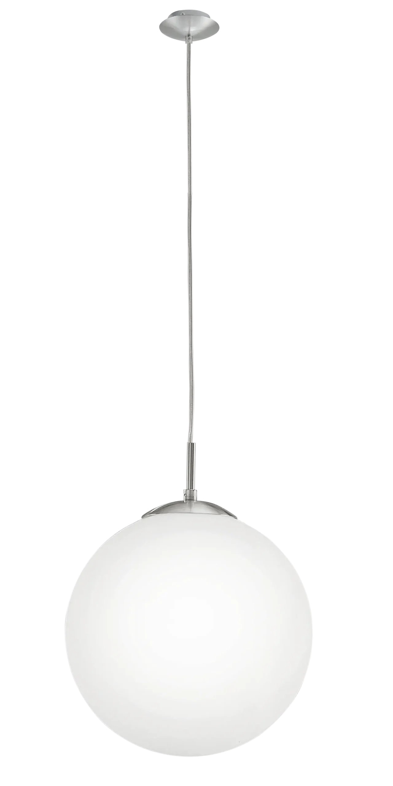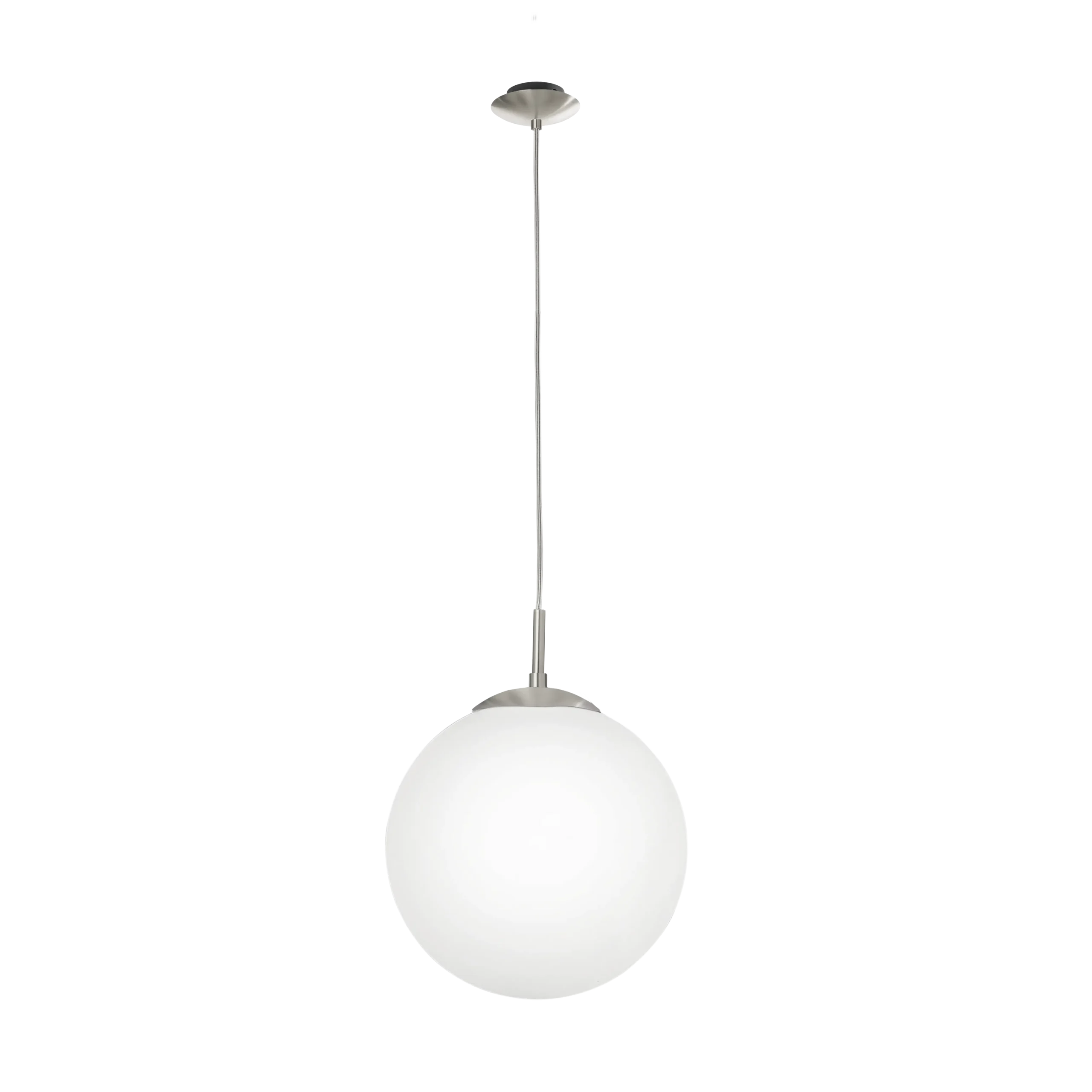 Minimalist Design: Features a sleek, matte opal glass globe suspended from a satin nickel canopy, offering a clean and contemporary aesthetic that complements various interior styles.