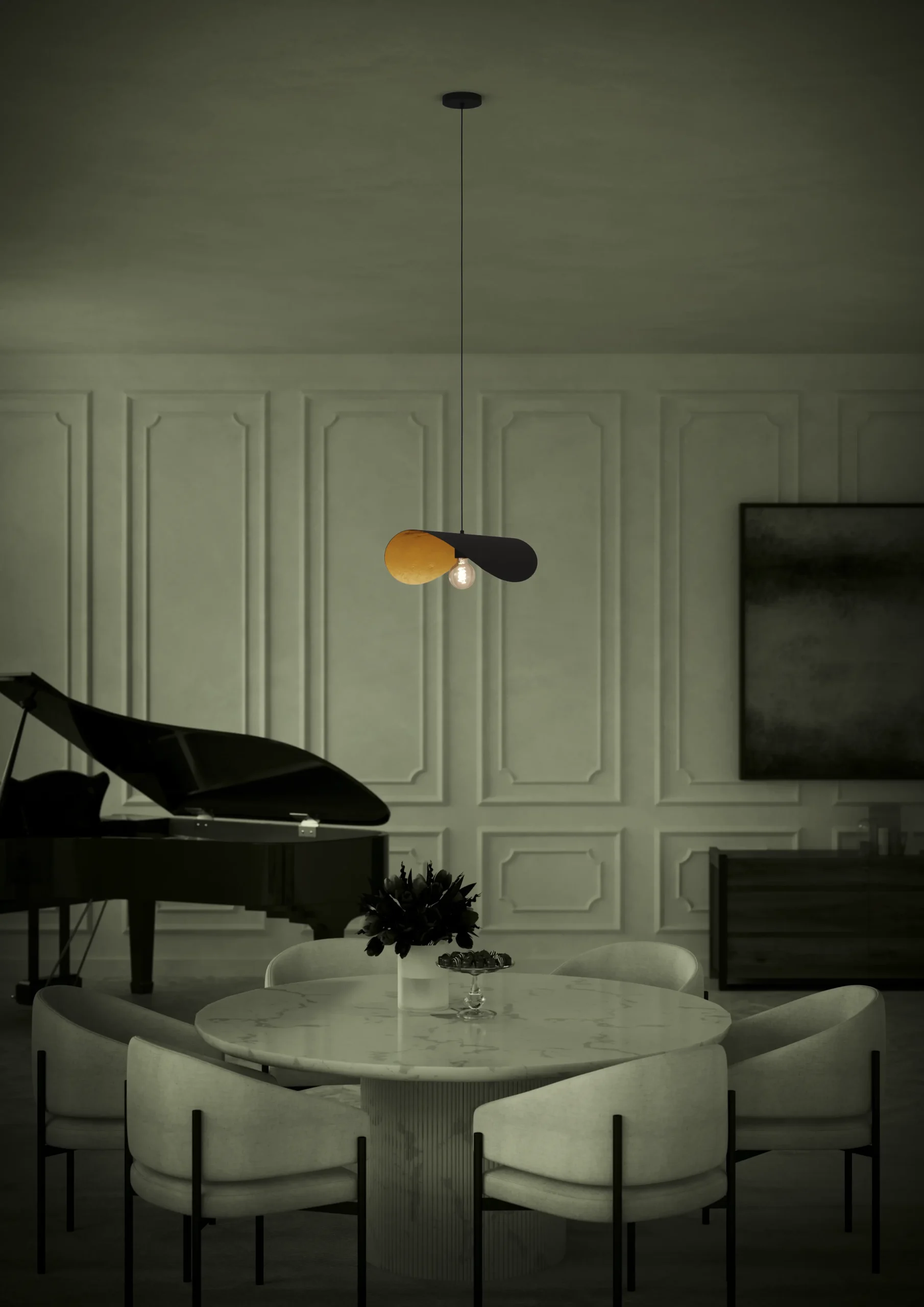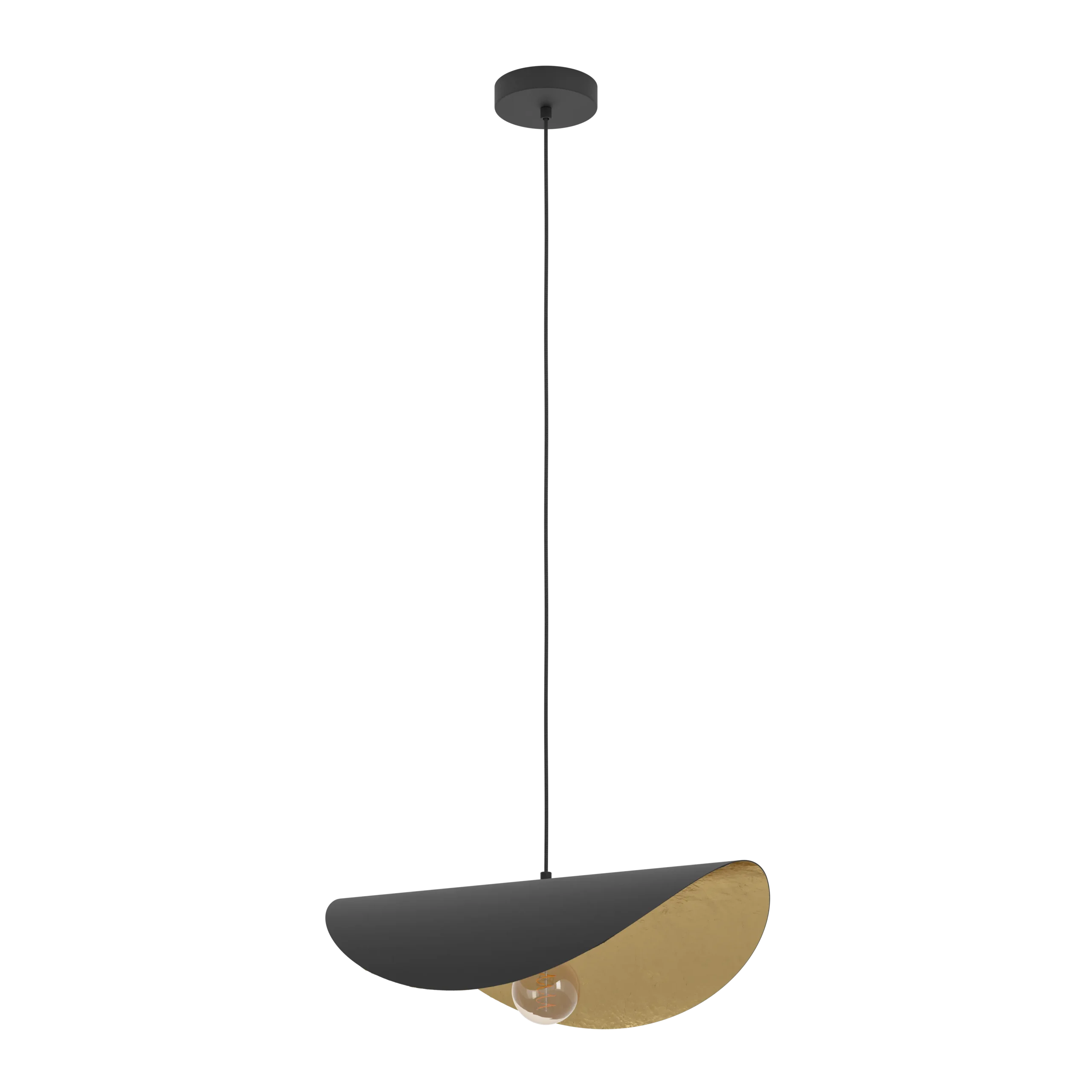 Sculptural Black & Gold Design: Stylish cylindrical pendant in black steel with luxurious gold-leaf interior—adds warmth and elegance to modern interiors.