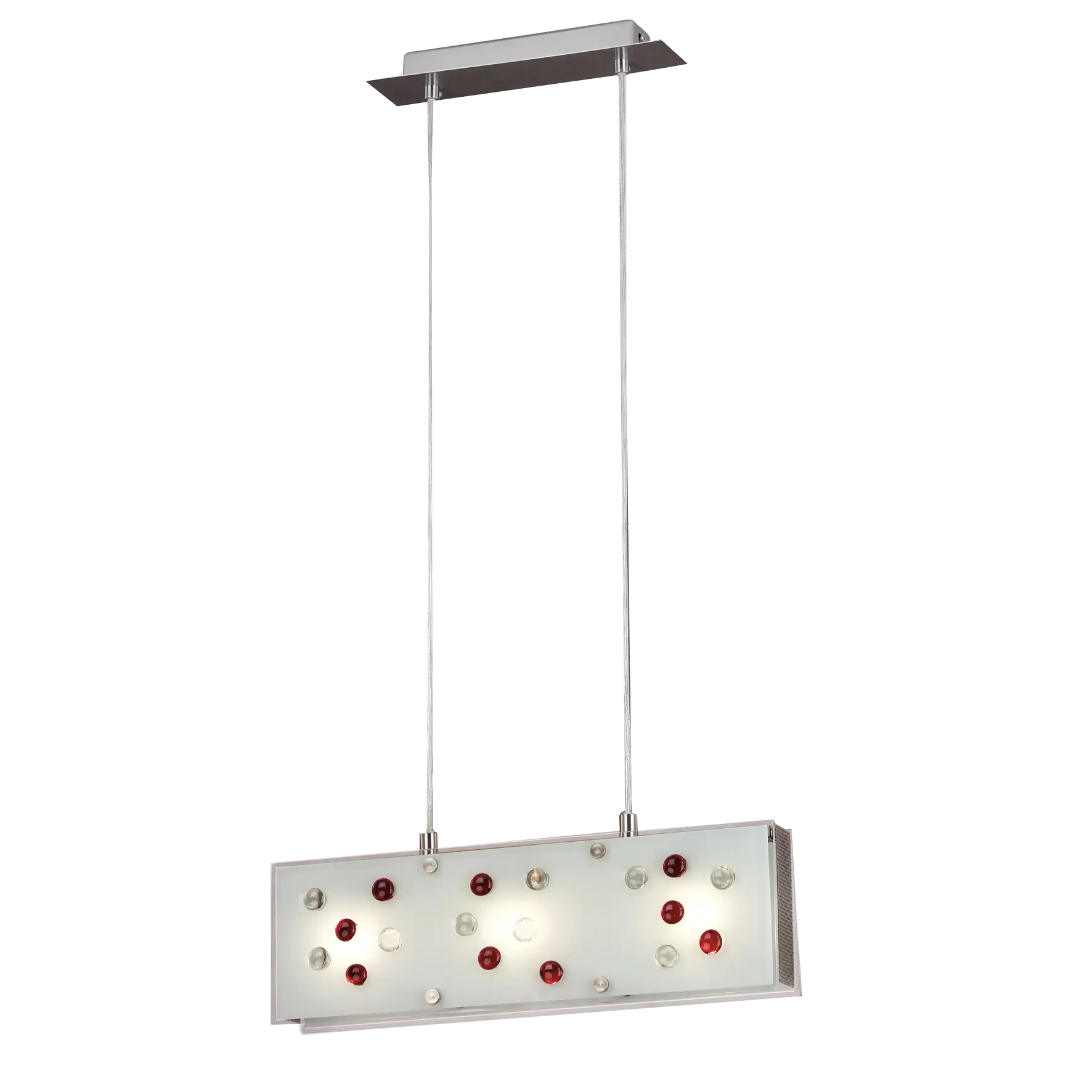The 87346 SANTIAGO pendant light combines sleek satin nickel steel with a decorative shade made of white satin glass and red glass stones, measuring 1100 mm in height, 450 mm in length, and 70 mm in width. Weighing 2.27 kg, this indoor fixture includes three G9 halogen lamp sockets, each rated at 40W, producing warm white light at 2700K for a cozy ambiance. Operating on 220-240V at 50/60Hz with an IP20 protection rating, it is designed without a built-in switch or battery. The unique combination of materials and warm light output makes SANTIAGO a stylish choice for distinctive interior lighting.