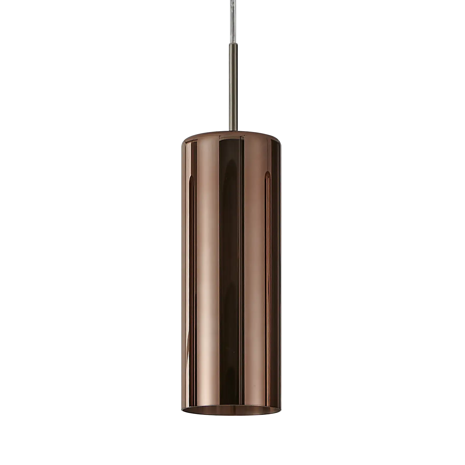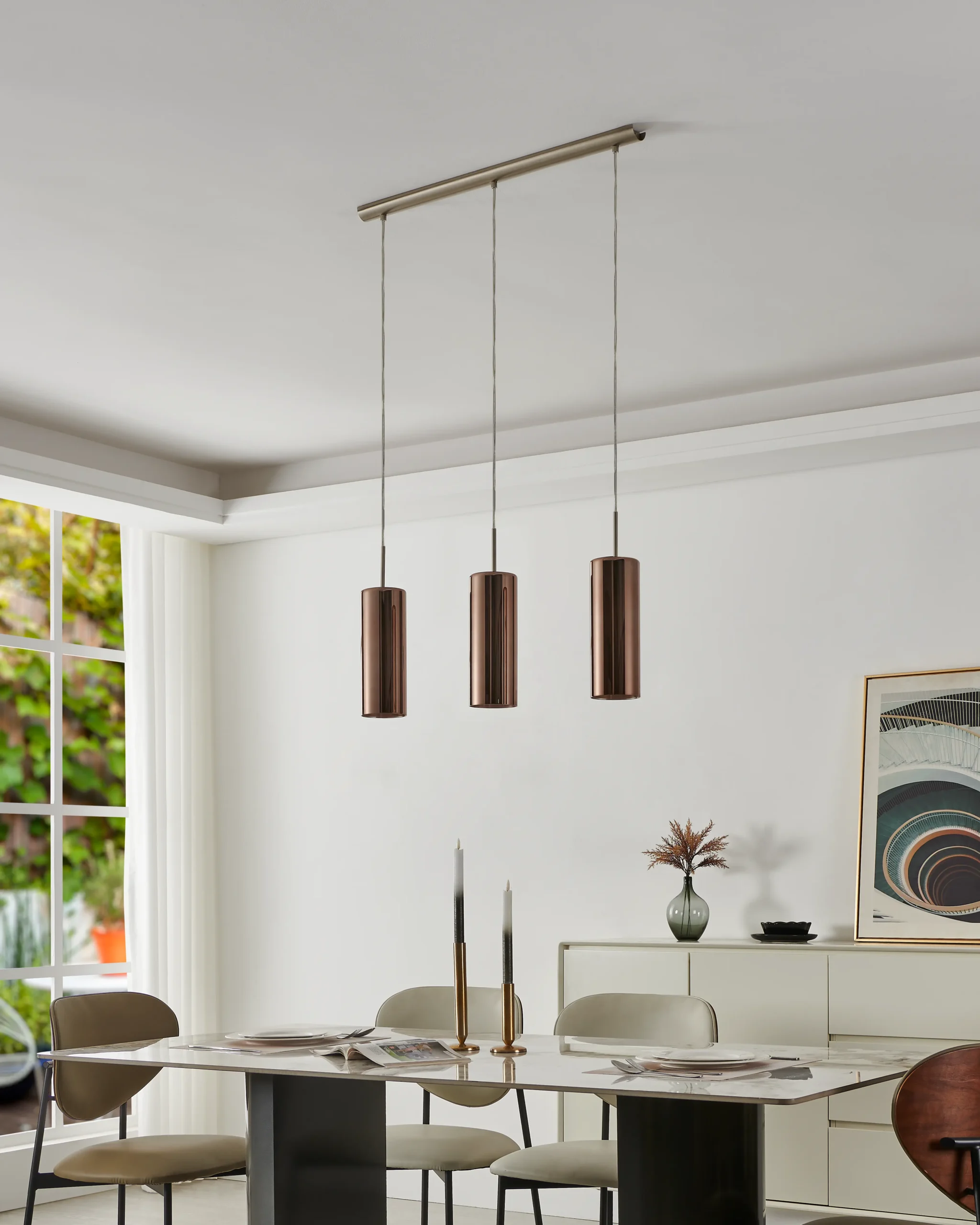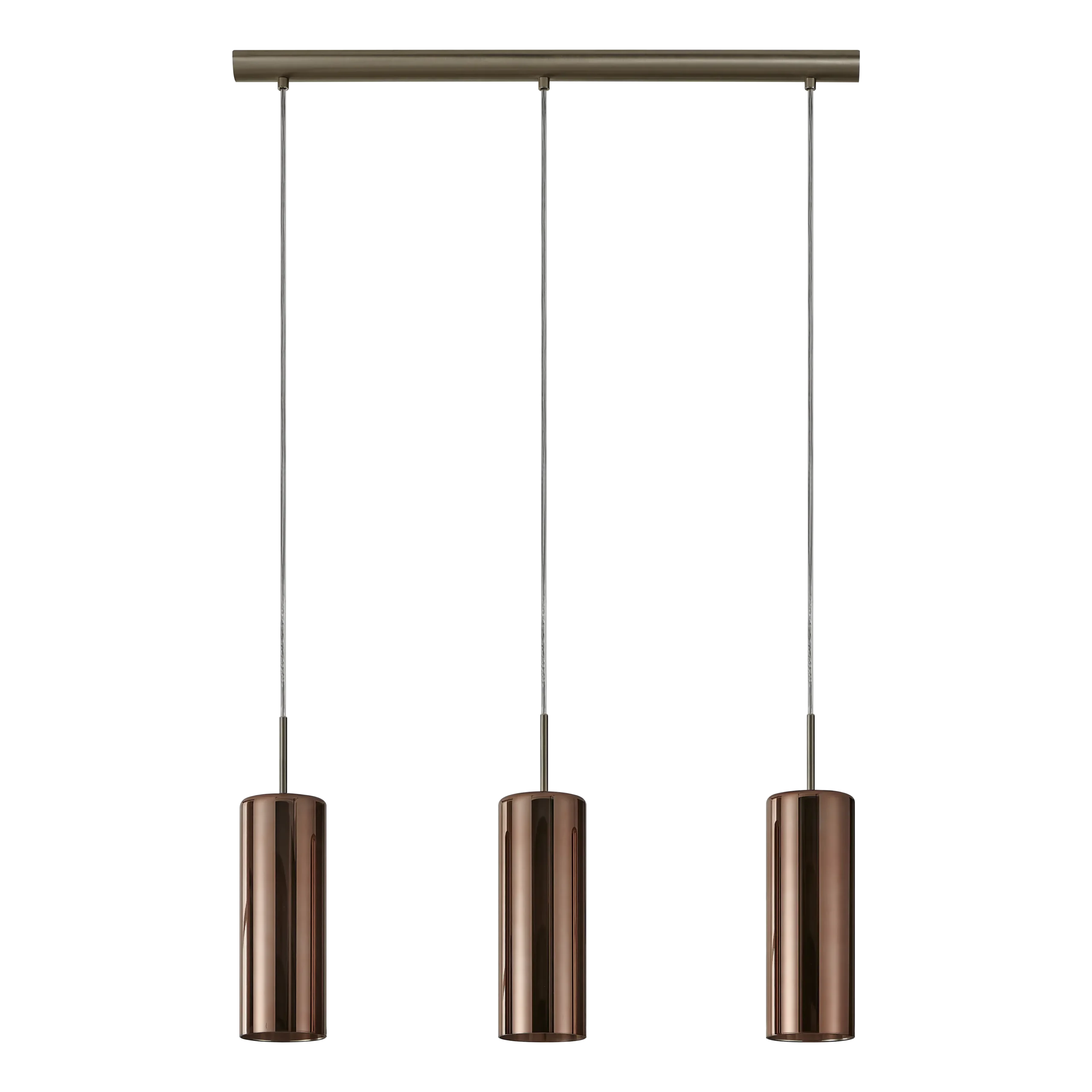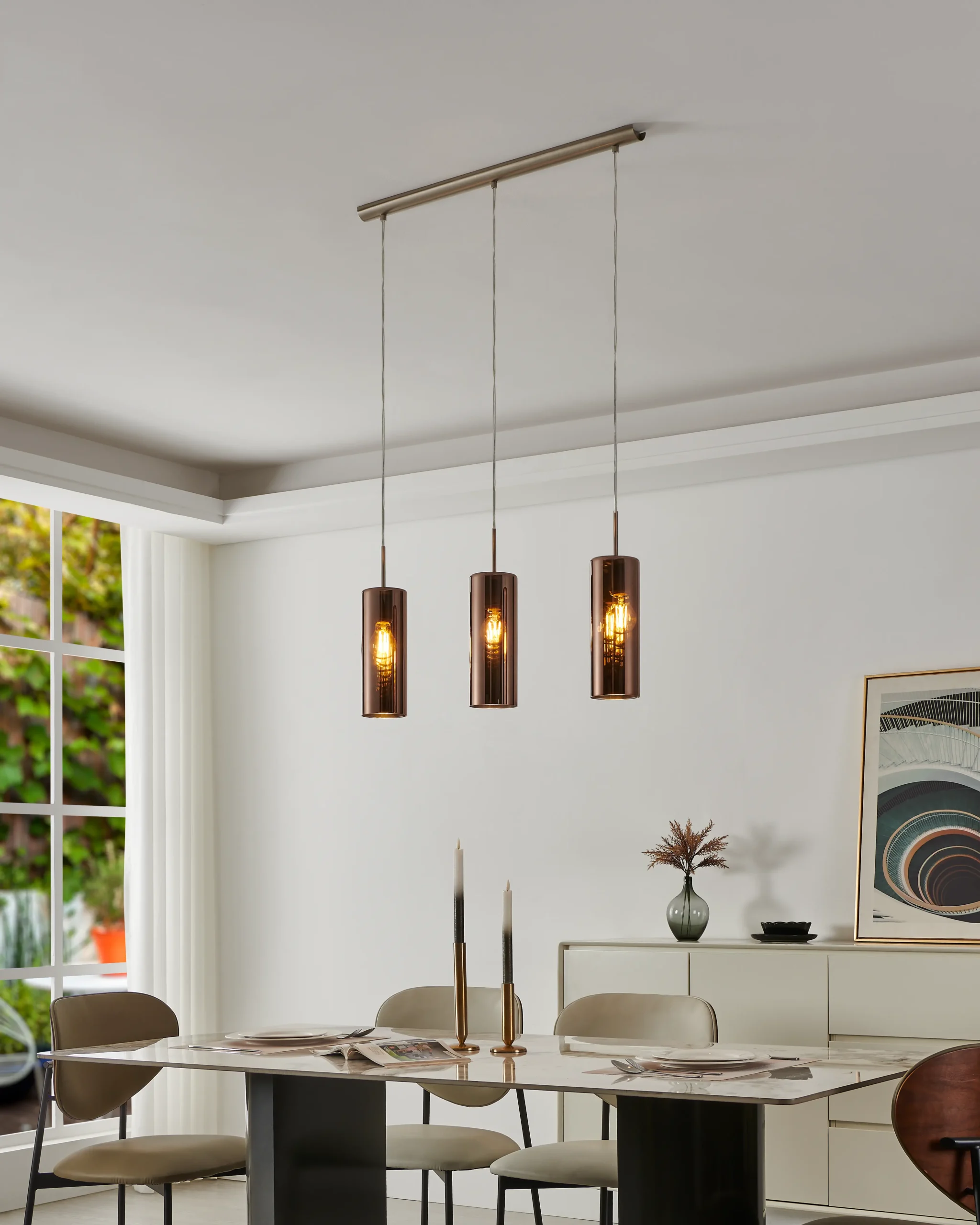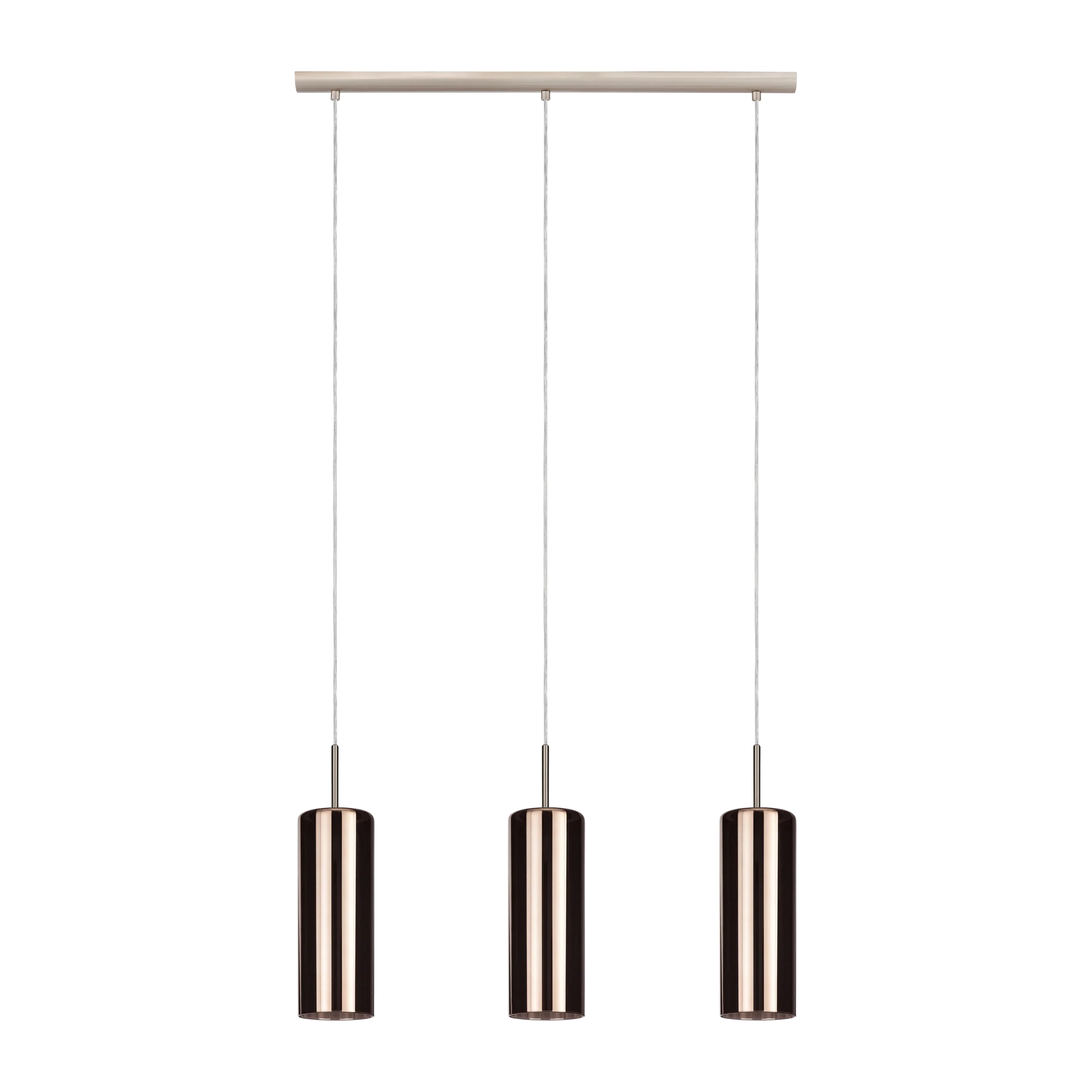 Modern metallic elegance – Three cylindrical copper‑vaporized glass shades suspended from a satin nickel steel canopy create a warm, contemporary look ideal for dining areas, kitchens, or living spaces.