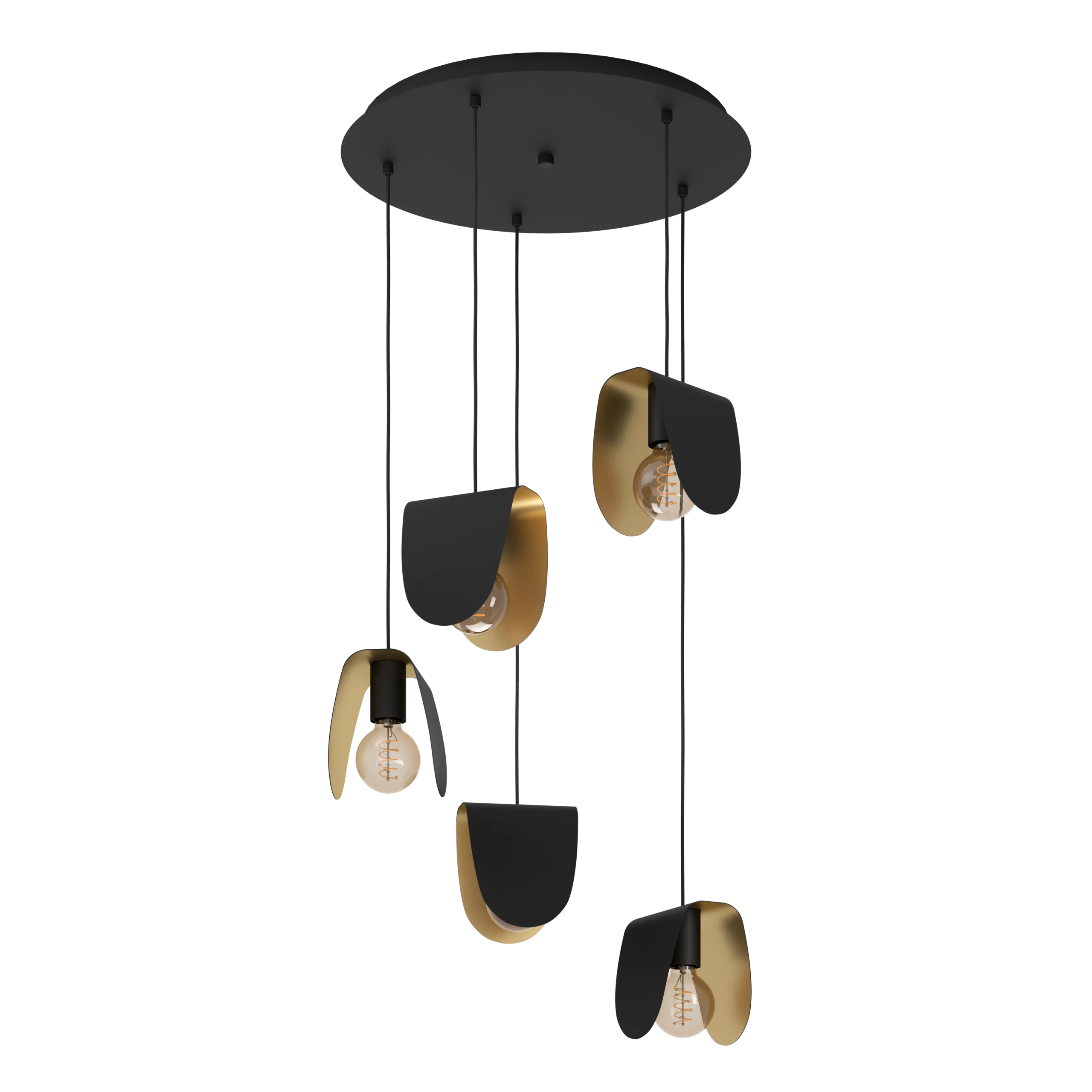 Striking Modern Design: Features five organically shaped black steel shades with gold-painted interiors, suspended from a sleek round canopy by black textile cables, creating a sophisticated, modern touch to any space.