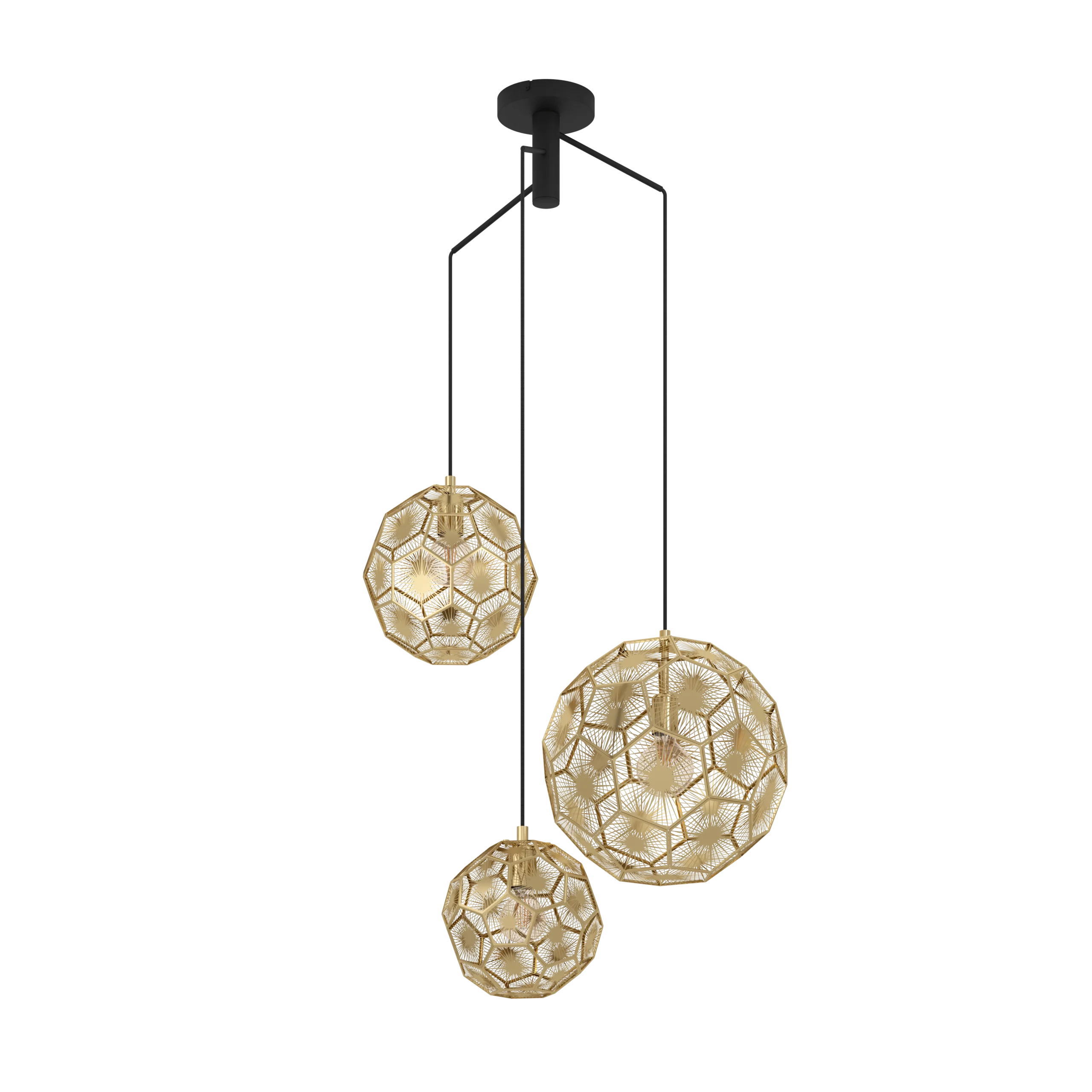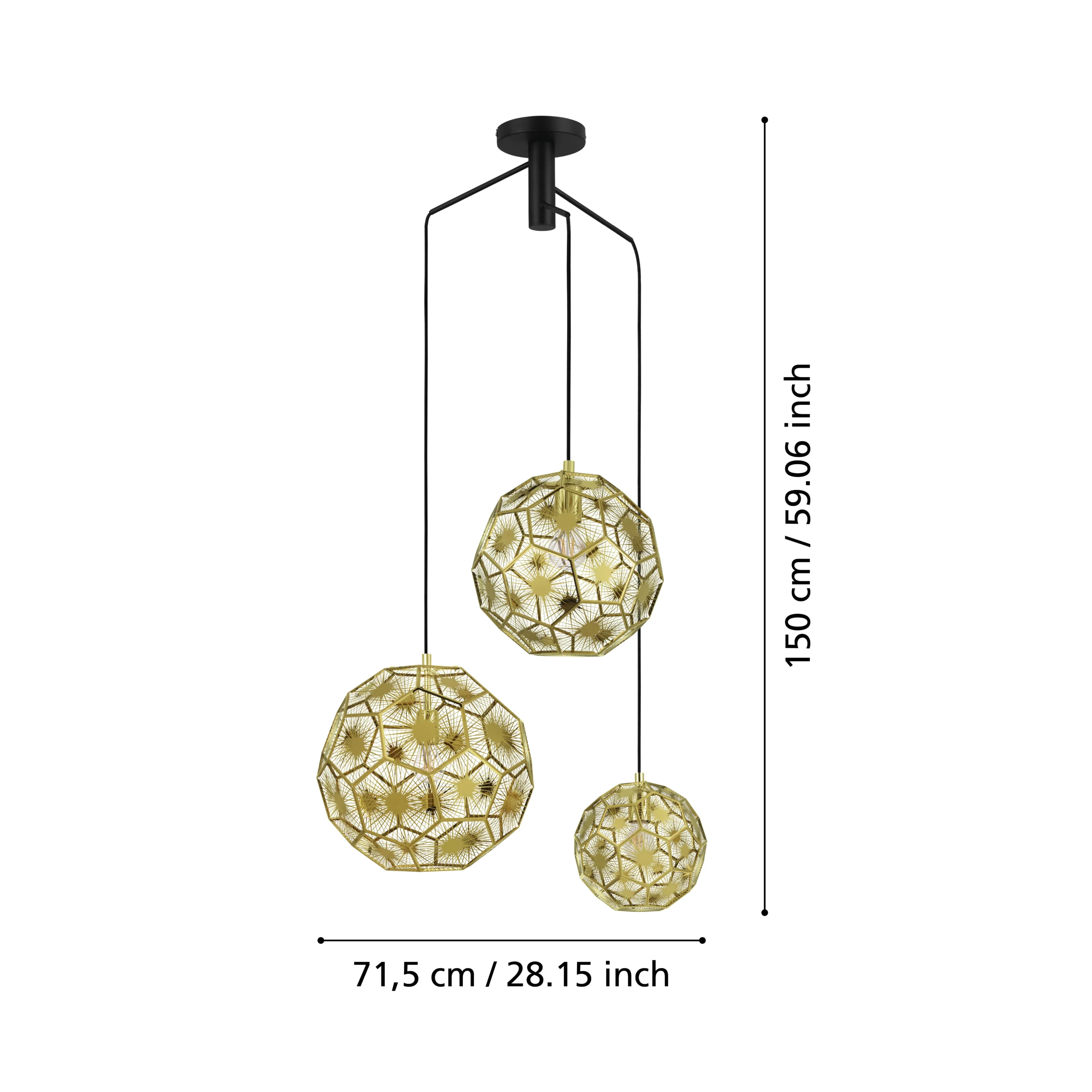 Trendy Black & Brass Finish: Features three geometric metal shades in black exterior and brass interior suspended in a triple cascade—ideal for contemporary kitchens, dining spaces, or entryways.