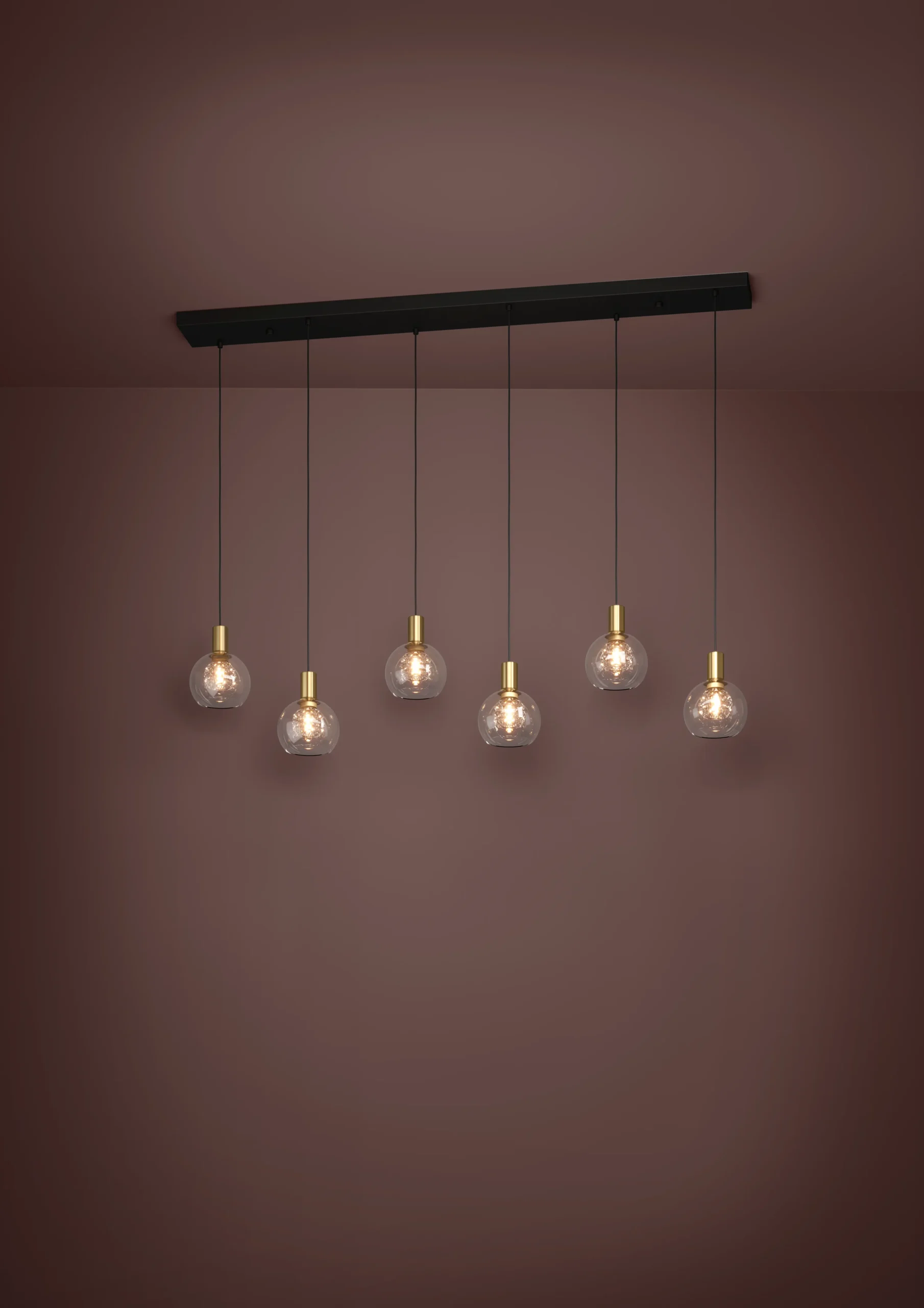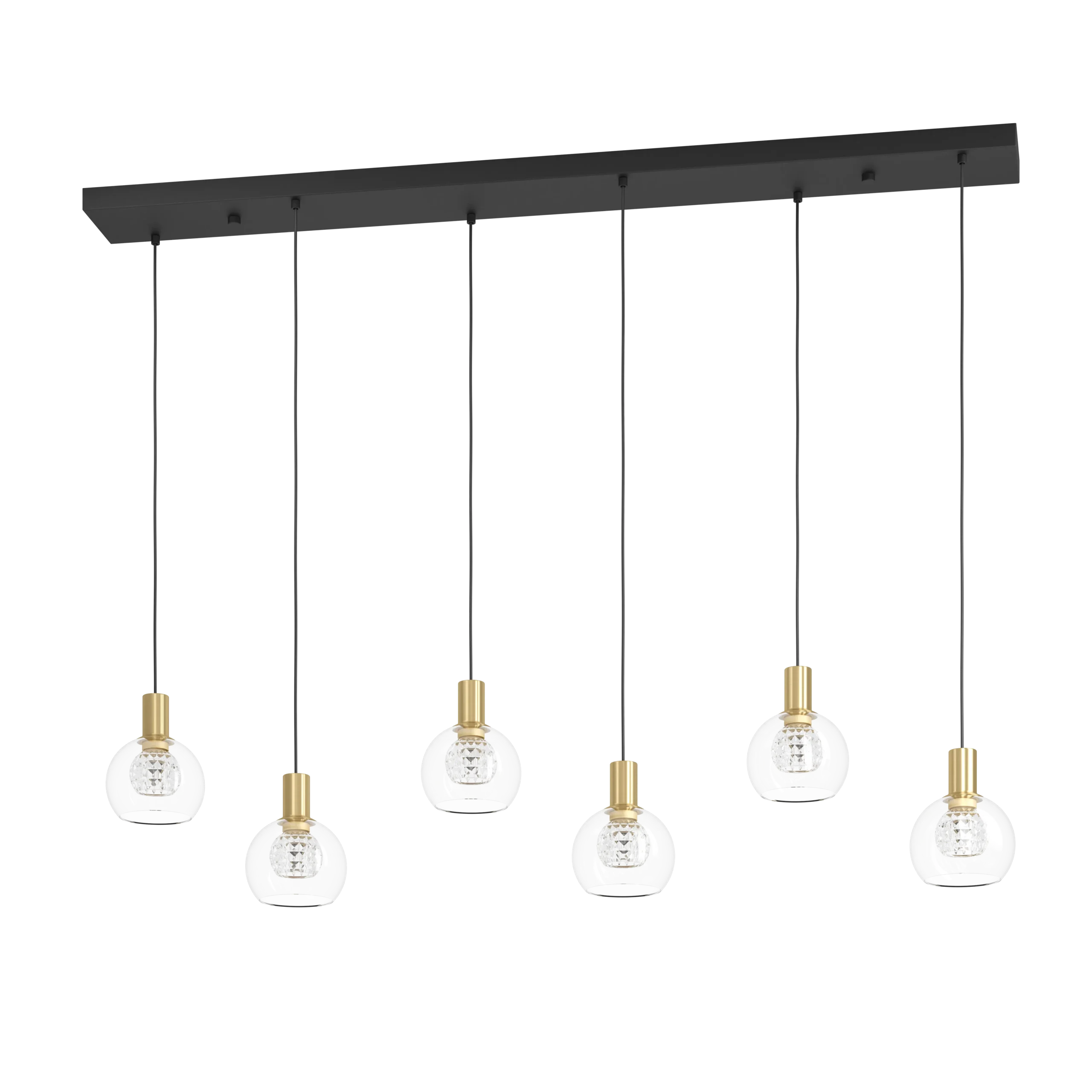 Stylish “Stars of Lamp” design – Six clear glass globes hanging from a sleek black steel bar with brushed brass accents for a luxurious, modern statement.