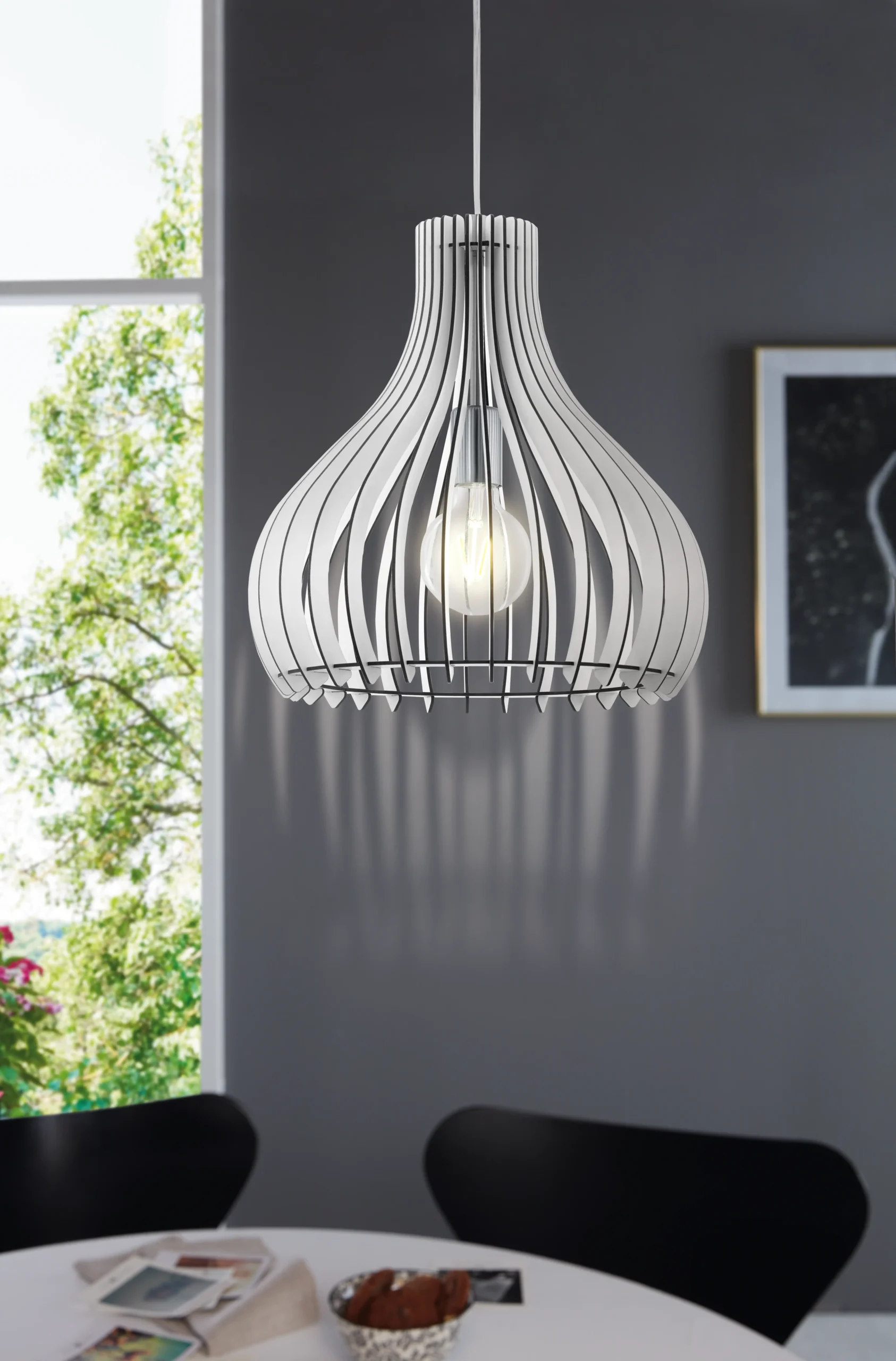 Scandinavian-Style Wood Slat Shade: A white-wood slatted cylindrical shade wrapped around a steel globe design, offering a warm, sculptural focal point for living or dining areas.
