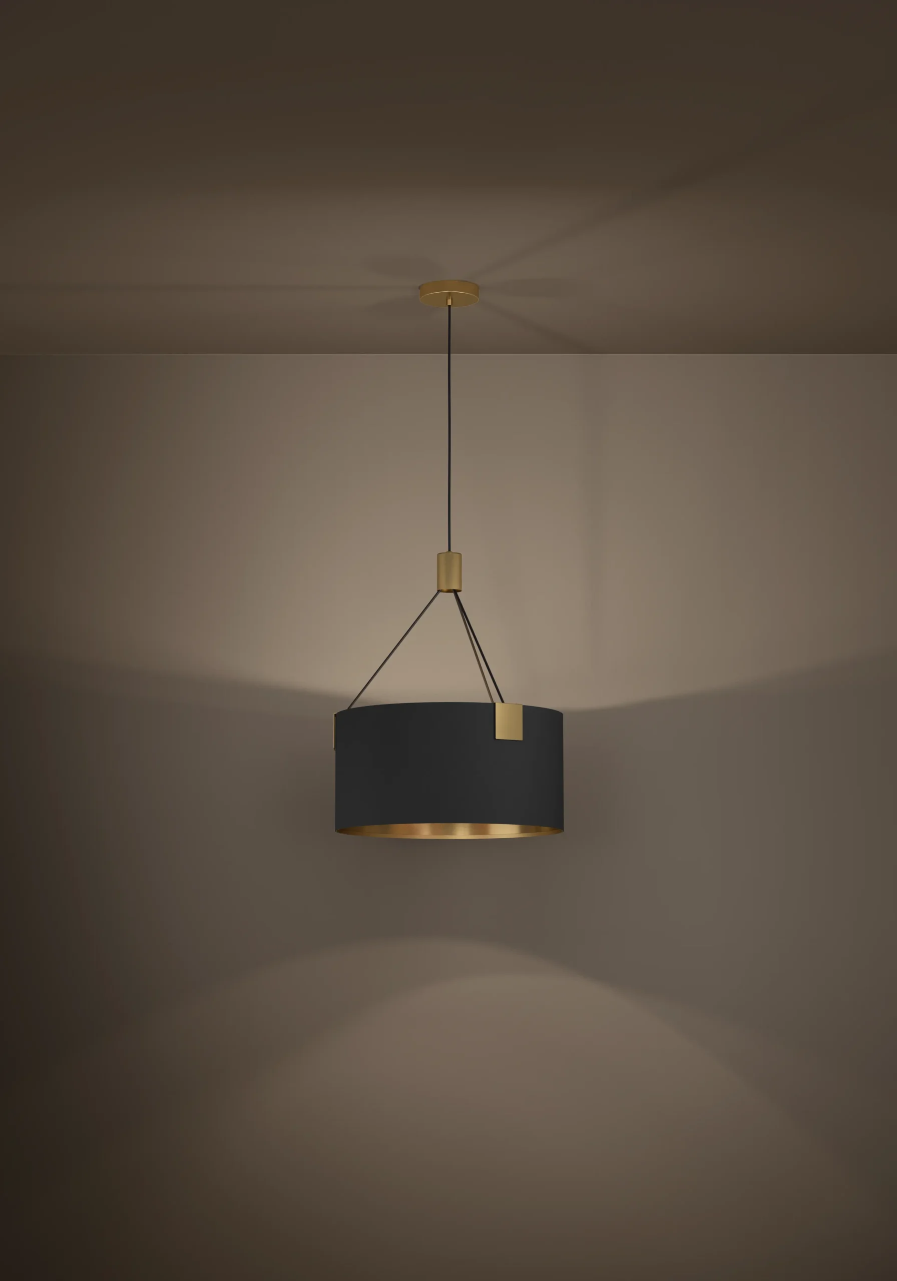 Stylish TORTOLA pendant light with brushed brass steel finish and black fabric shade, perfect for indoor ambient lighting.
