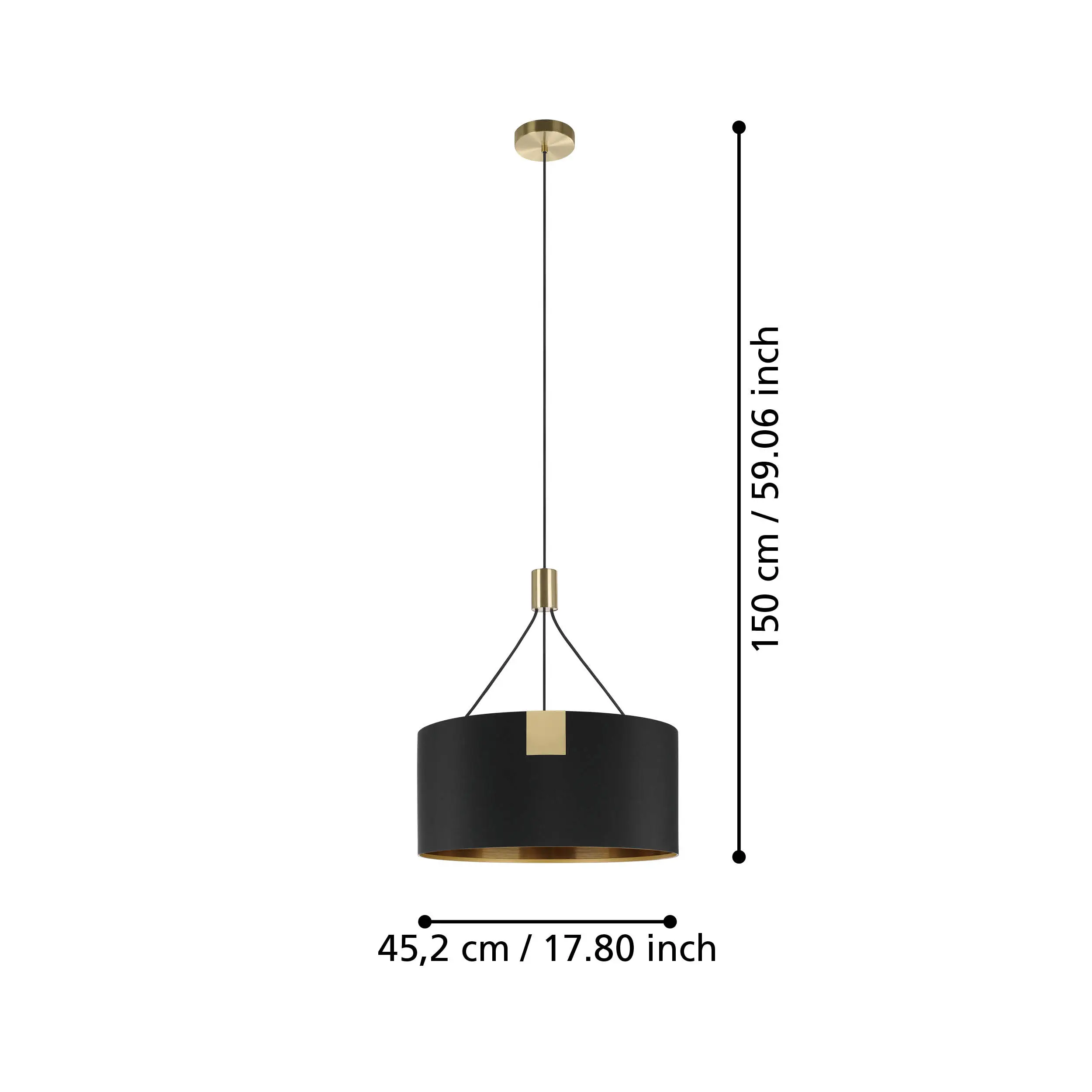 The 39964 TORTOLA pendant light is an elegant indoor lighting fixture from the Stars of Light collection. It features a brushed brass steel enclosure with a black and brass fabric shade, creating a modern yet warm look. With dimensions of 1500 mm height and 450 mm diameter, this light weighs just 1.47 kg. It uses one 40W AGL illuminant with an E27 lamp socket, operating on 220-240V at 50/60Hz. The pendant has an IP20 protection degree and does not come with a switch or battery. Ideal for adding sophisticated ambiance to any interior space, TORTOLA balances style and functionality seamlessly.