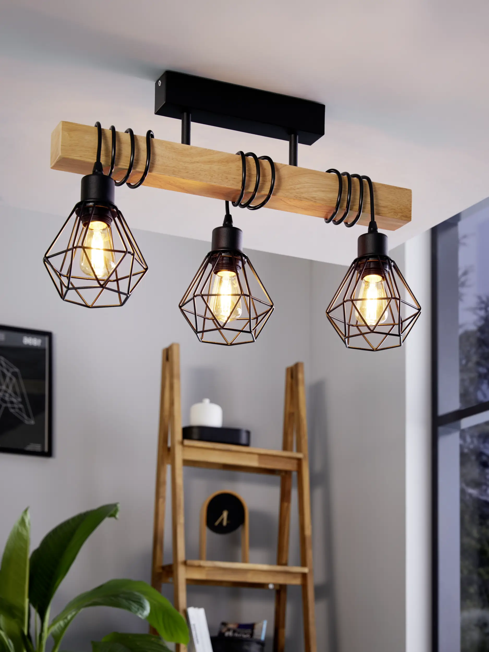 A rustic-industrial ceiling light combining black steel with warm wood elements for a timeless interior look.