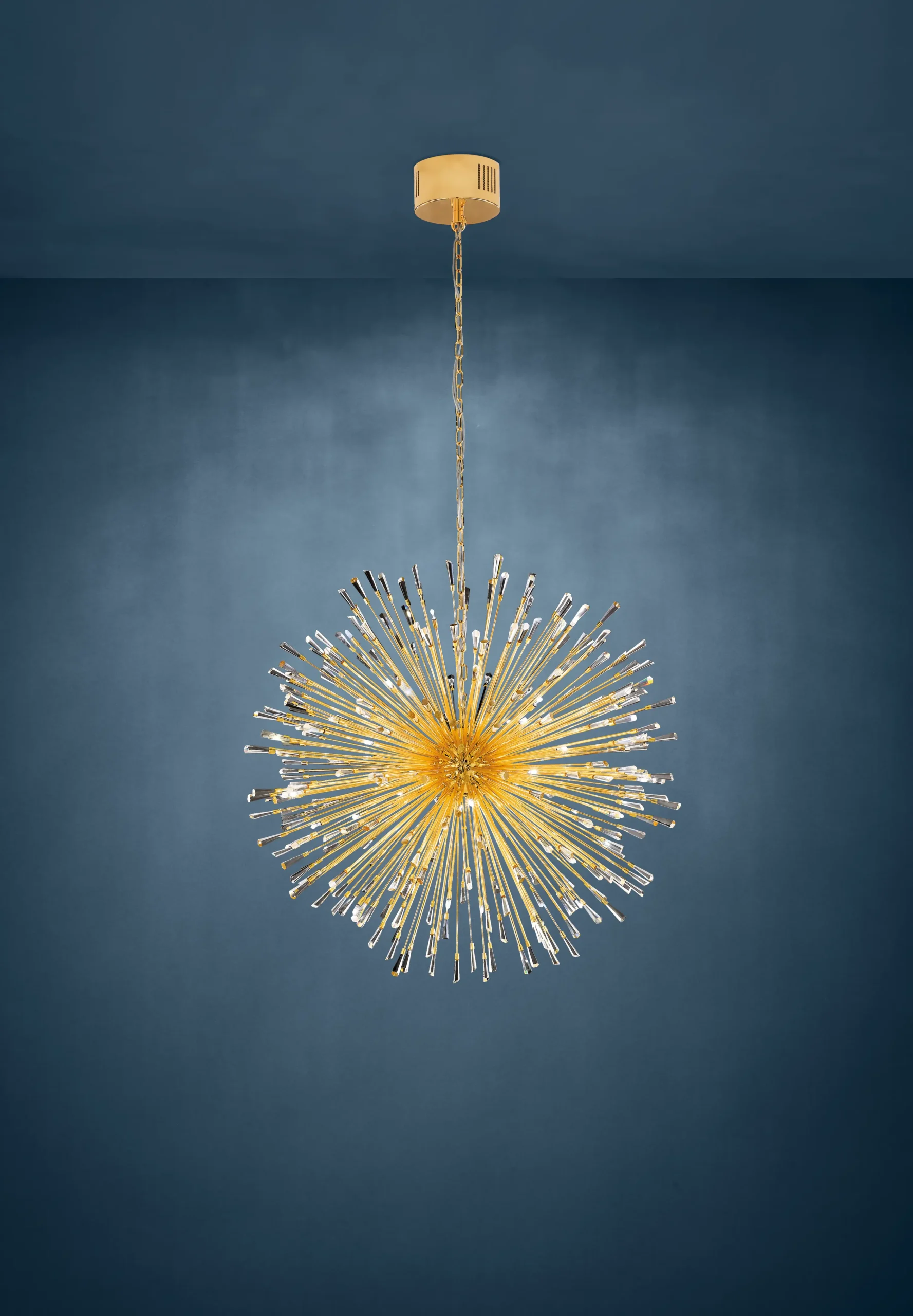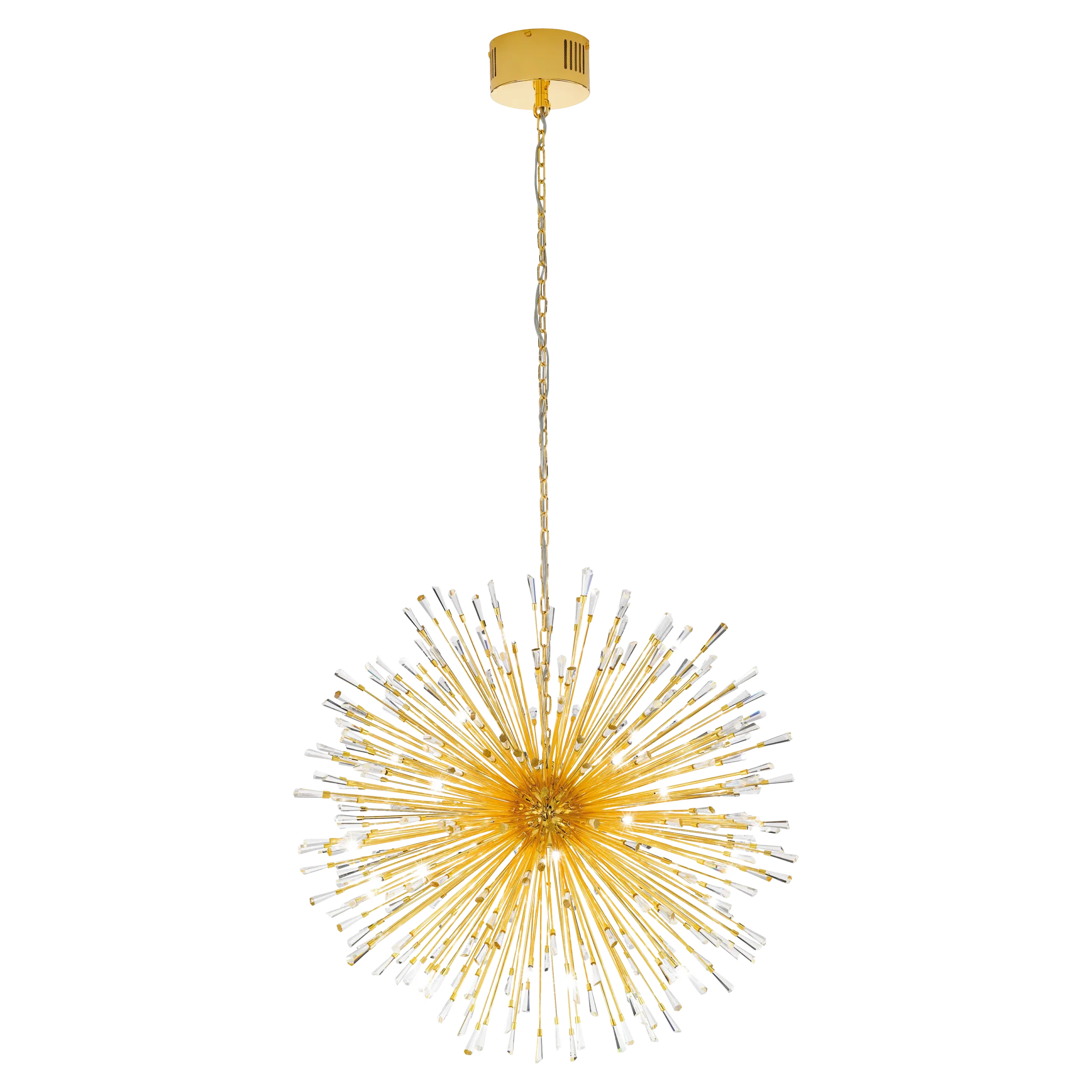 Dazzling Crystal Explosion Design: Gold-plated steel body adorned with 32 clear brilliant-crystal arms, creating a starburst effect that elevates style and ambiance.