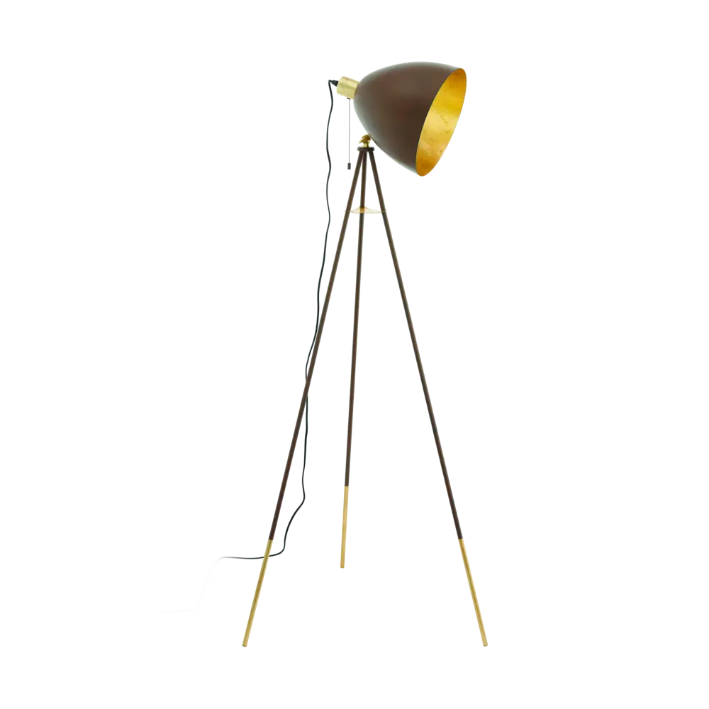 Vintage Industrial Design: Features a rust-coloured steel tripod base with gold accents and a matching adjustable shade, offering a unique aesthetic that complements various interior styles.