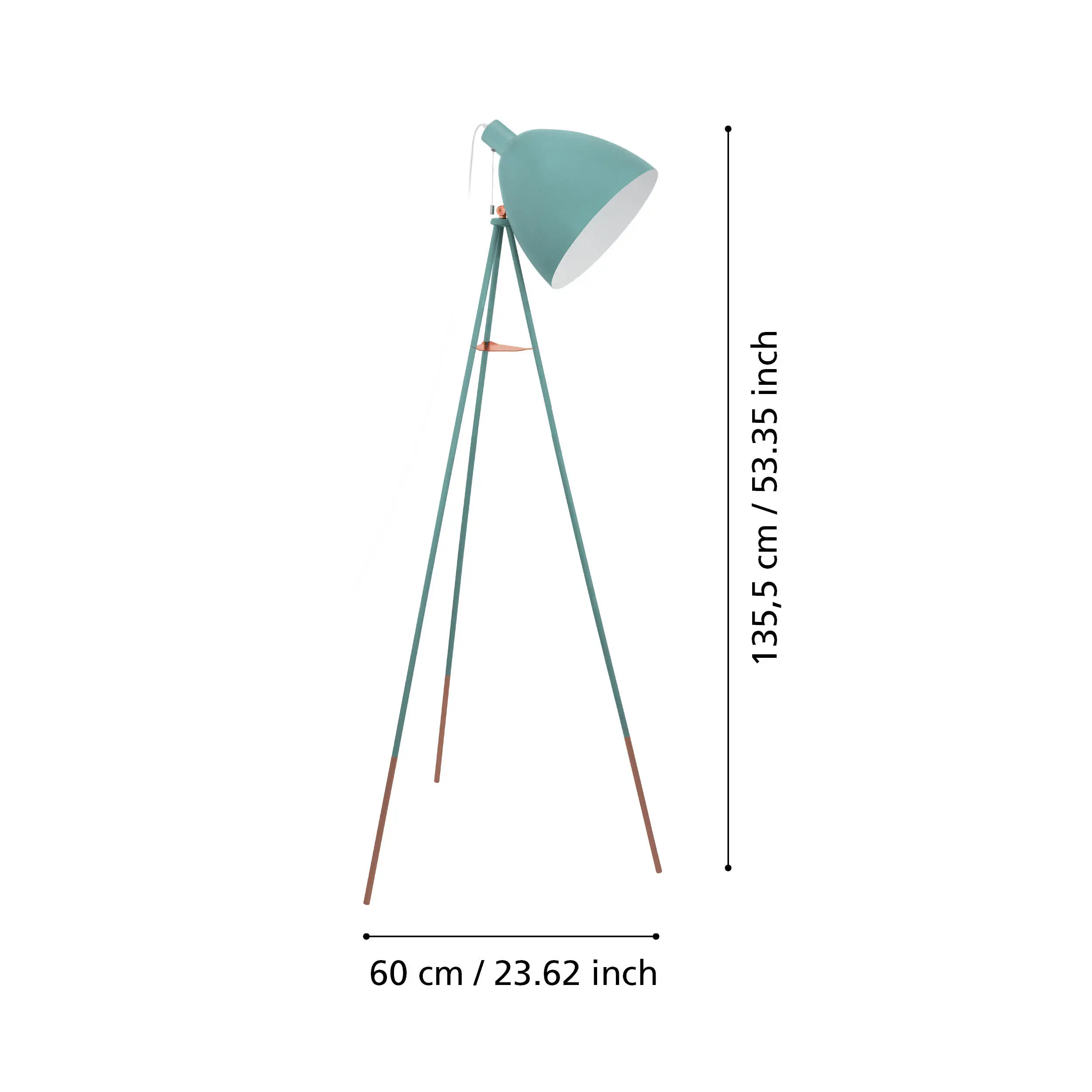 Retro-Modern Tripod Design: The DUNDEE floor lamp features a mint-green steel tripod base accented with copper details, topped with an adjustable mint-and-white dome shade—blending nostalgic charm with modern versatility .