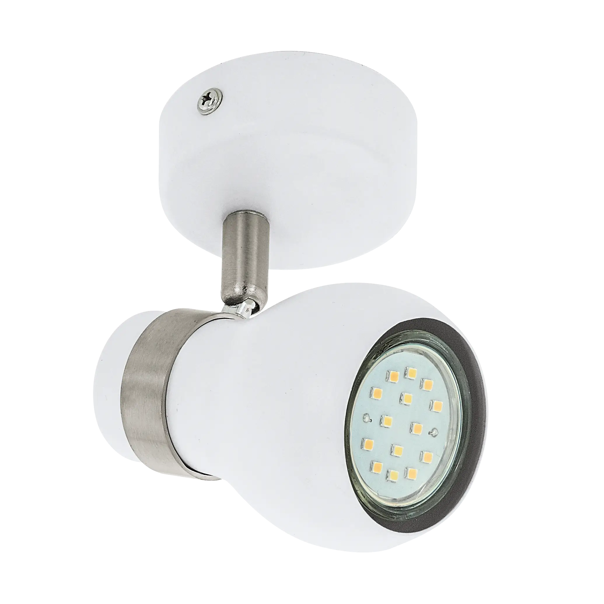 Compact & Stylish Steel Spot: Elegant white and satin nickel steel housing with minimal footprint (Ø85mm), ideal for modern indoor decor.