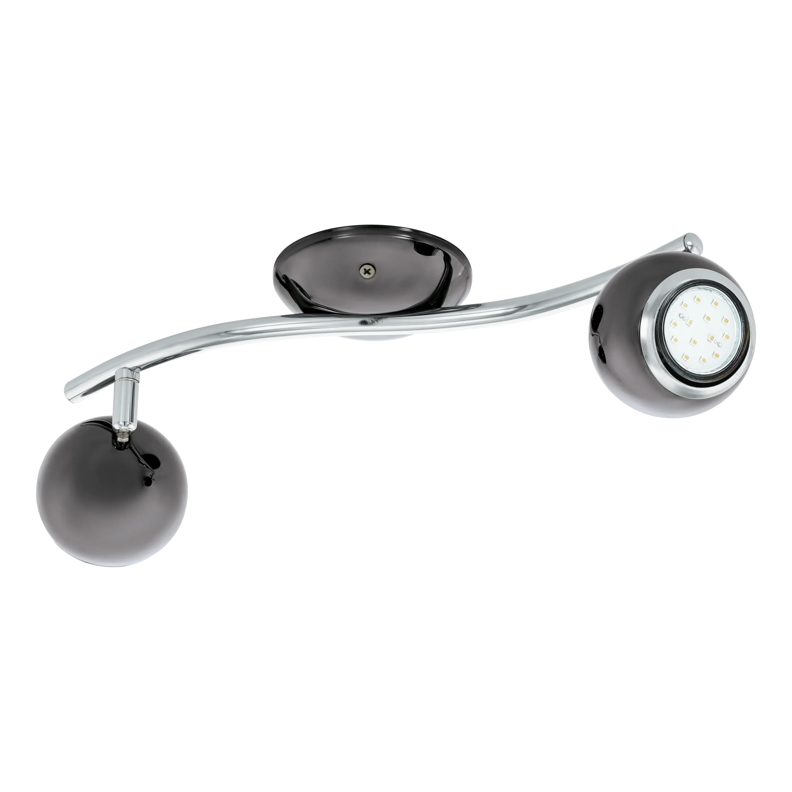 Contemporary Dual‑Head Spot Design: Stylish curved steel bar featuring two spherical spotlight heads in nickel‑nero and chrome finish, perfect for adjustable accent lighting in kitchens, living rooms, corridors, or bedrooms.