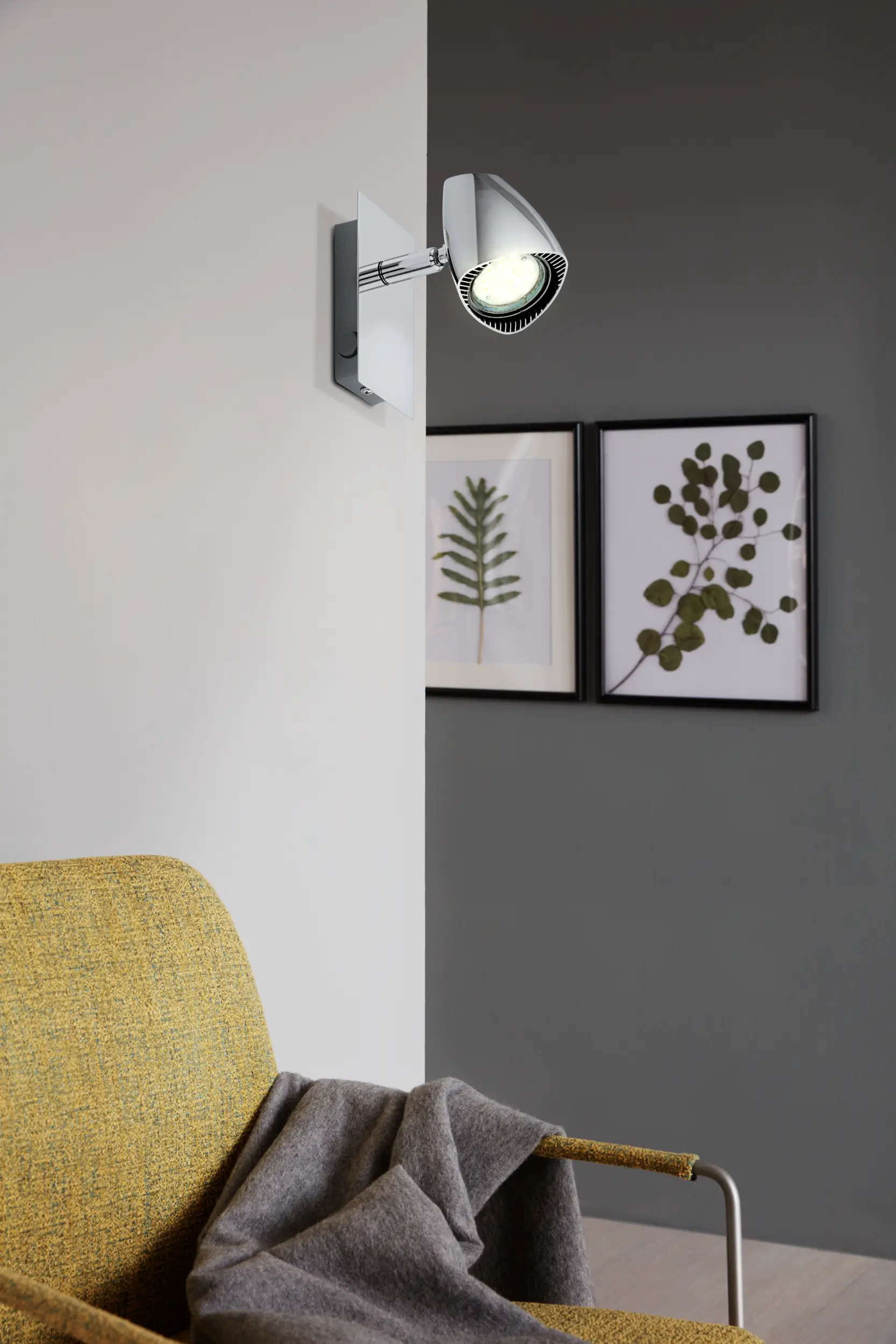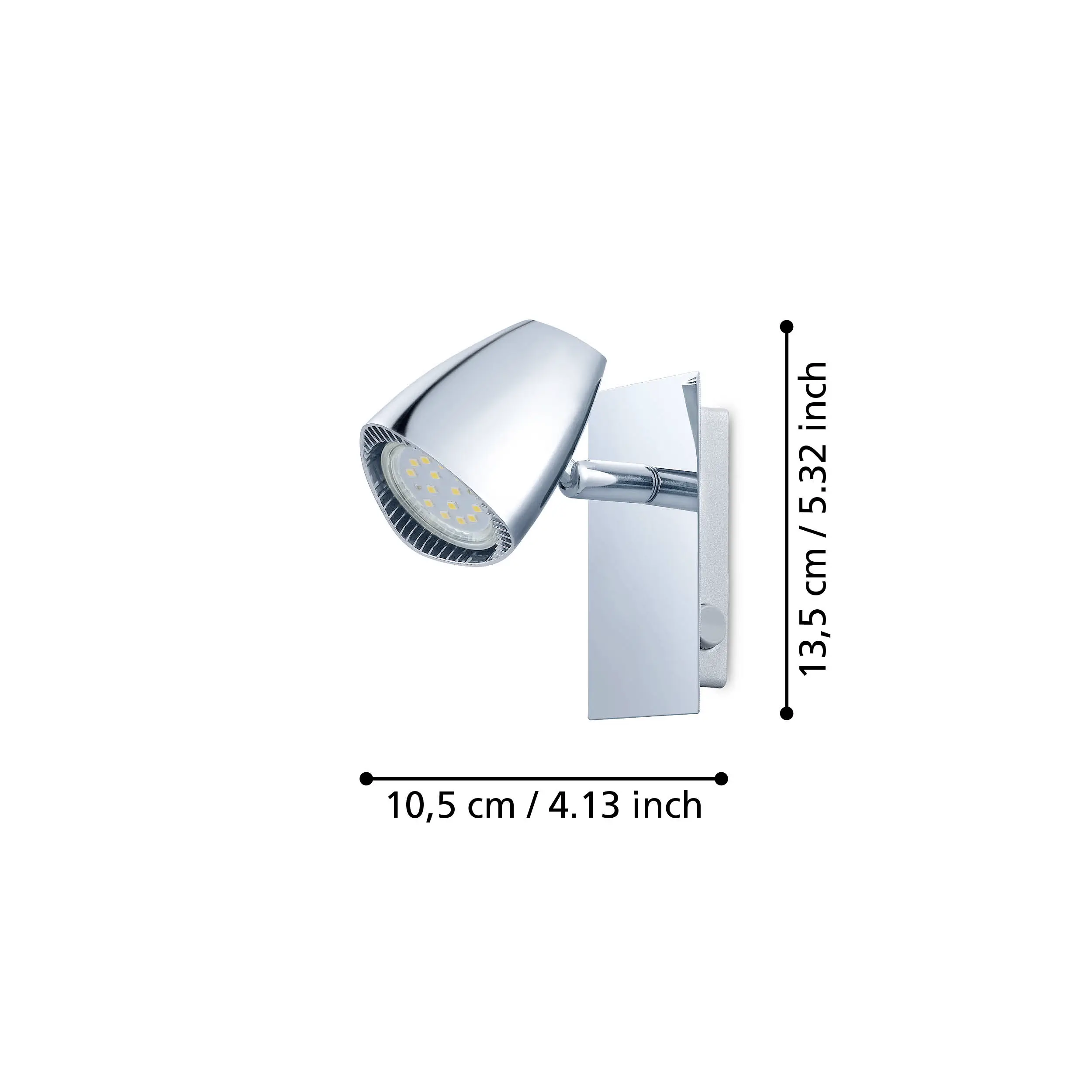 Compact & flexible spotlight – Sleek chrome steel-and-plastic body (120 × 60 mm) with a fully adjustable head allows you to direct light exactly where needed—perfect for highlighting artwork, mirrors, or reading areas.