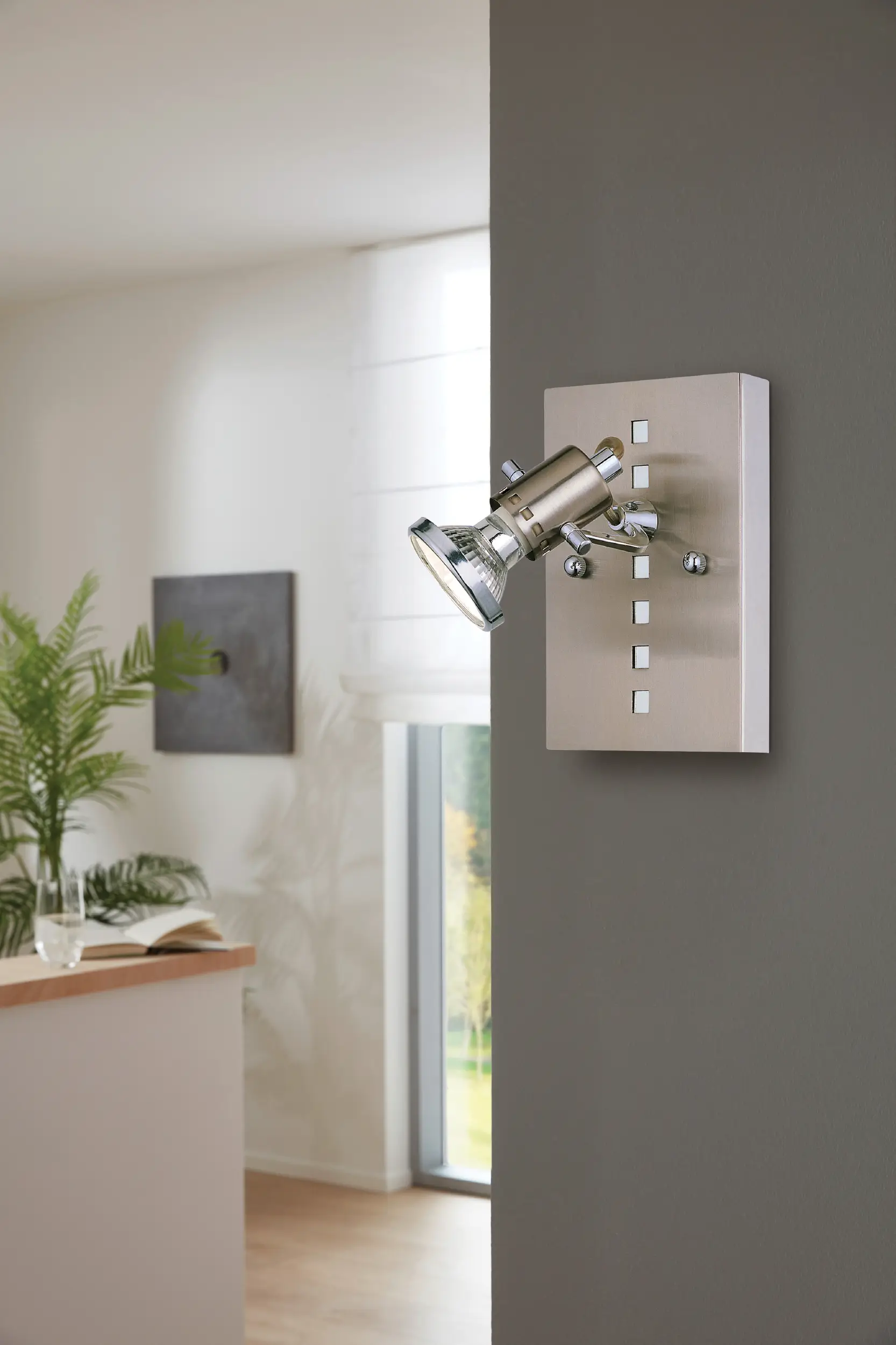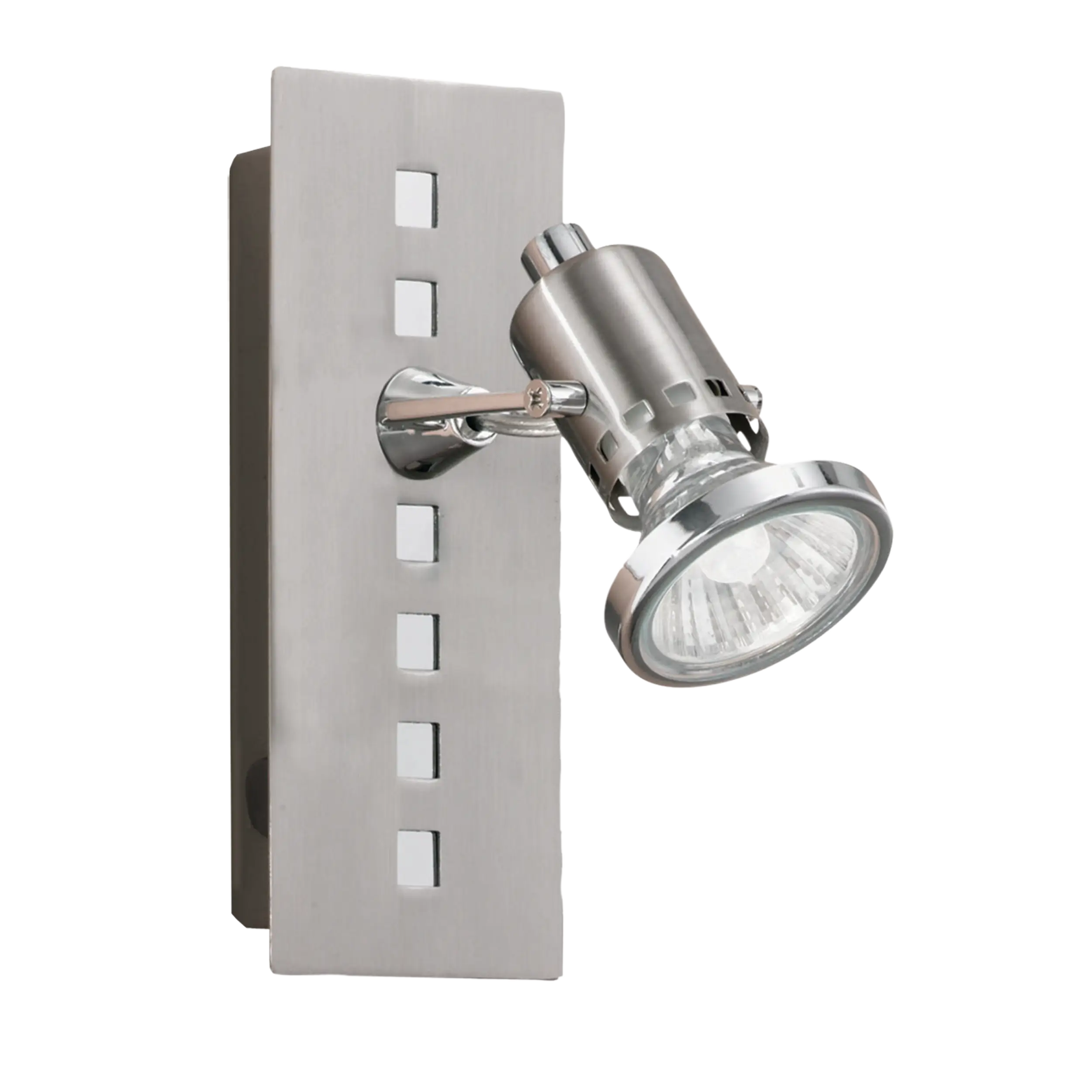 Modern directional spotLamp – Compact adjustable spot Lamp in satin nickel and chrome steel finish; suitable for ceiling or wall use