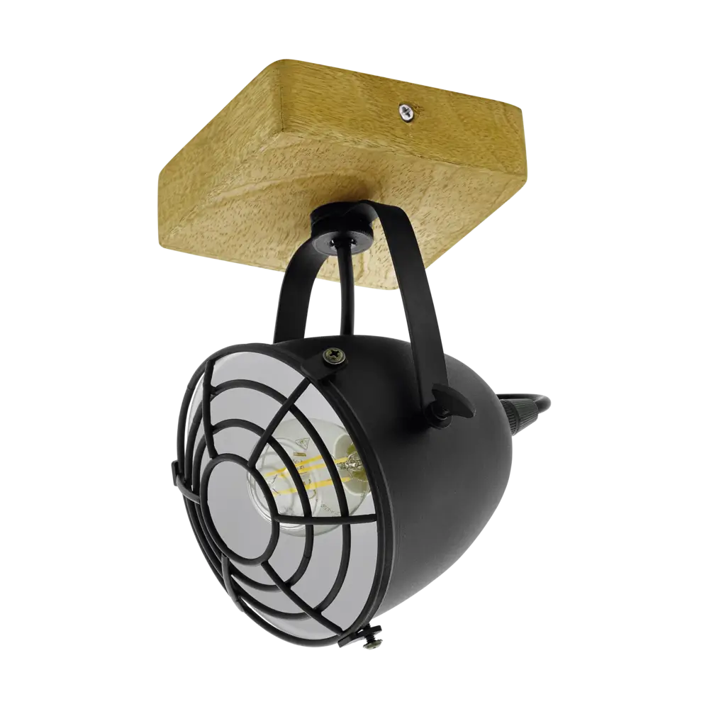 Rustic-Industrial Flair: A compact E14 spotlight featuring a natural wood square base and a pivoting black steel cage-style shade—ideal for adding character reminiscent of classic studio or warehouse lighting .