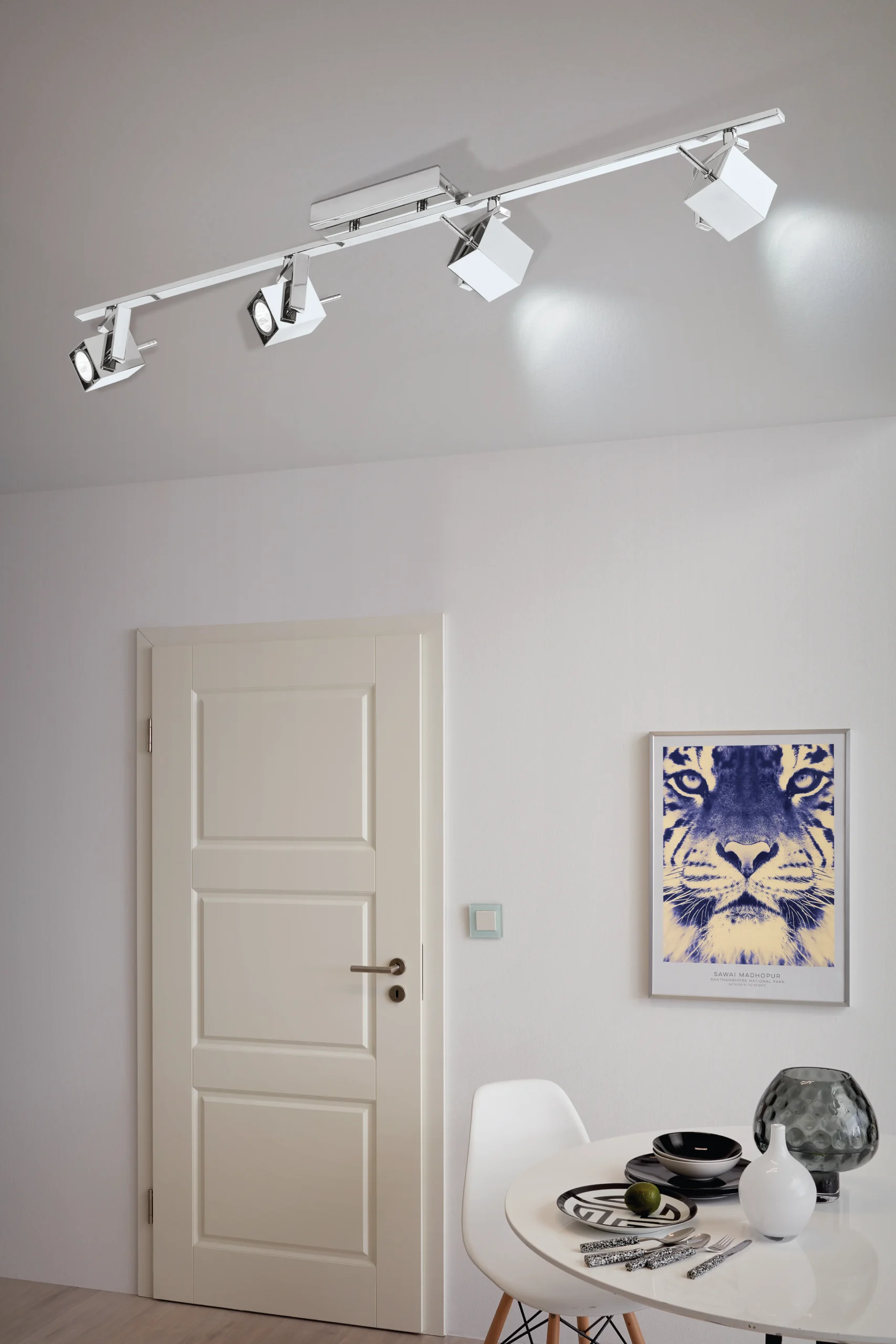 EGLO MANAO 1 93157 extends adjustable illumination across four GU10 spot heads on a long chrome bar for larger rooms and corridors. The included LEDs provide 4×5W at 3000K with 400 lumens per head, offering efficient, warm lighting under IP20, Class I protection at 220–240V. At 1075 × 70 mm and 1.64 kg, it delivers wide coverage with precise aiming for accent and task needs.