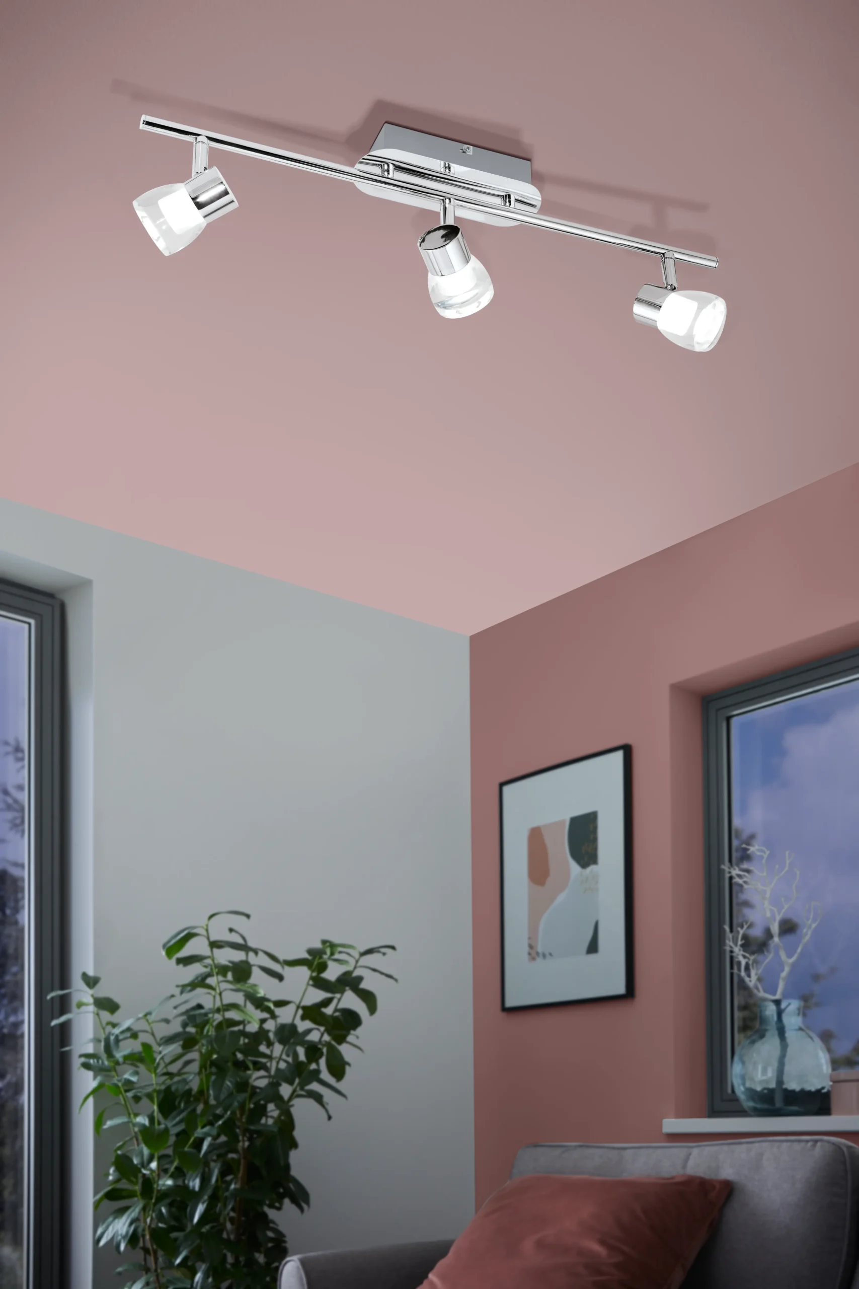 Modern Perito spot light with chrome steel and aluminium enclosure. Features clear satin-finish plastic shade, three 3W non-replaceable LEDs, and warm white lighting in indoor settings.
