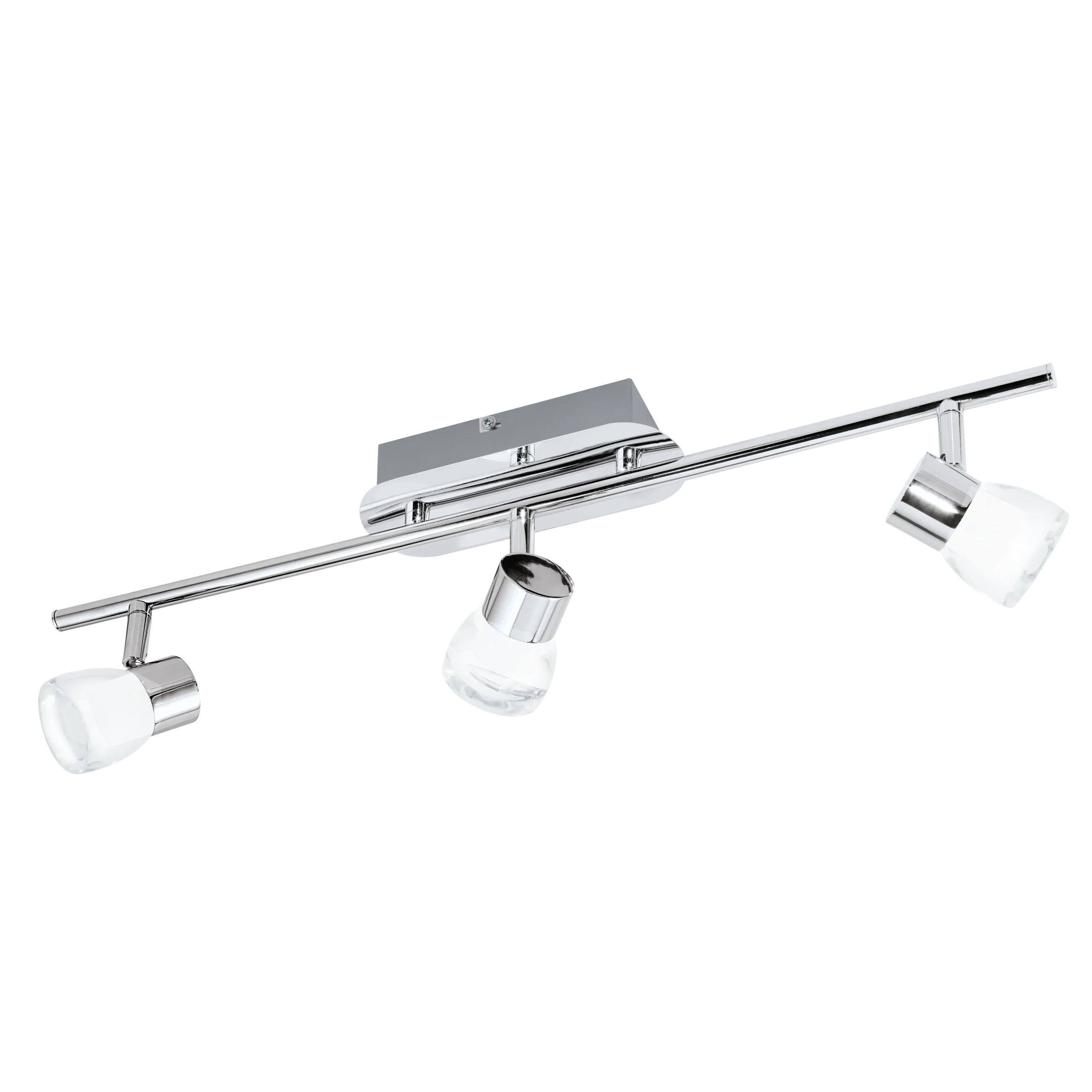 The EGLO Perito Spot Light (Material Number 94382) is a sleek indoor lighting fixture constructed from steel and aluminium with a polished chrome finish. It has a slim profile with a width of 65mm and length of 510mm, weighing 1.02 kg. This light operates on 220-240V mains voltage with a 12V operational voltage and incorporates three built-in 3W LED lights that are not replaceable. Each LED produces 300 lumens of warm white (3000K) light, providing bright, energy-efficient illumination. The clear satin-finish plastic shade adds to its modern aesthetic. With an IP20 protection rating and no dimming capability, it is designed for reliable use in indoor environments. The LED lights have a long nominal lifetime of 25,000 hours and 15,000 switching cycles, ensuring durability and performance.