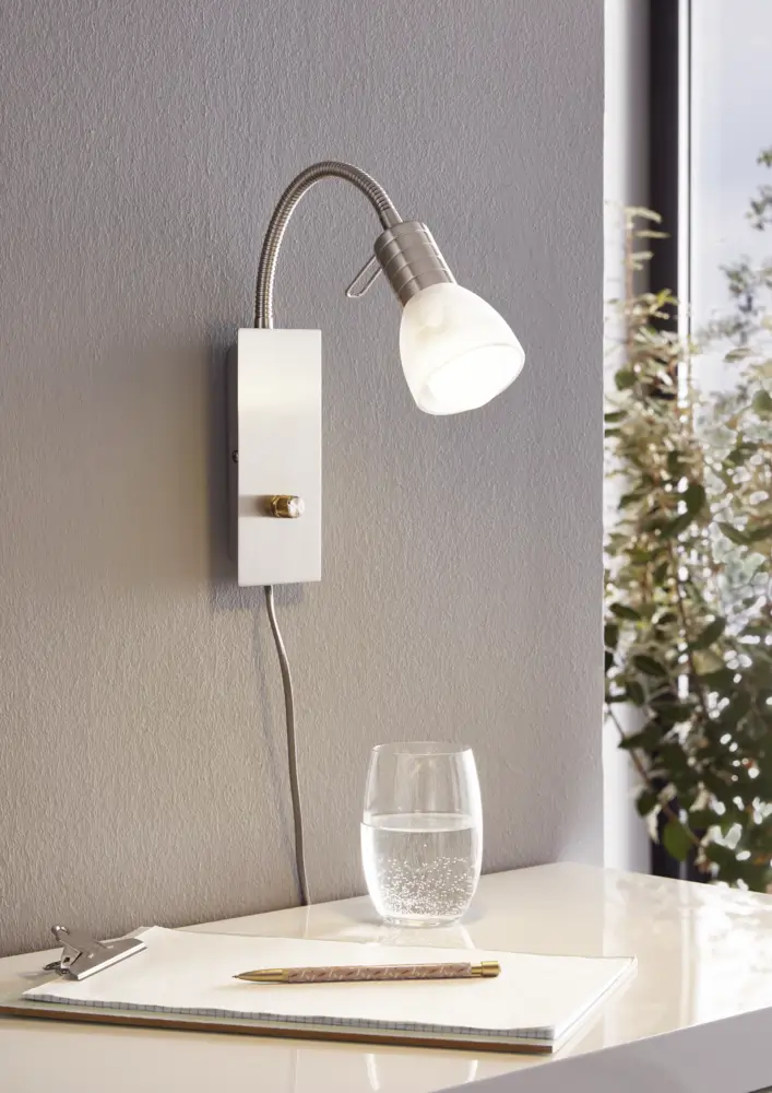 Flexible Satin-Nickel & Alabaster Glass Design – Made from durable steel with a satin-nickel finish, complemented by a white alabaster-style glass shade for modern, elegant Lamping in living rooms, bedrooms, or offices.
